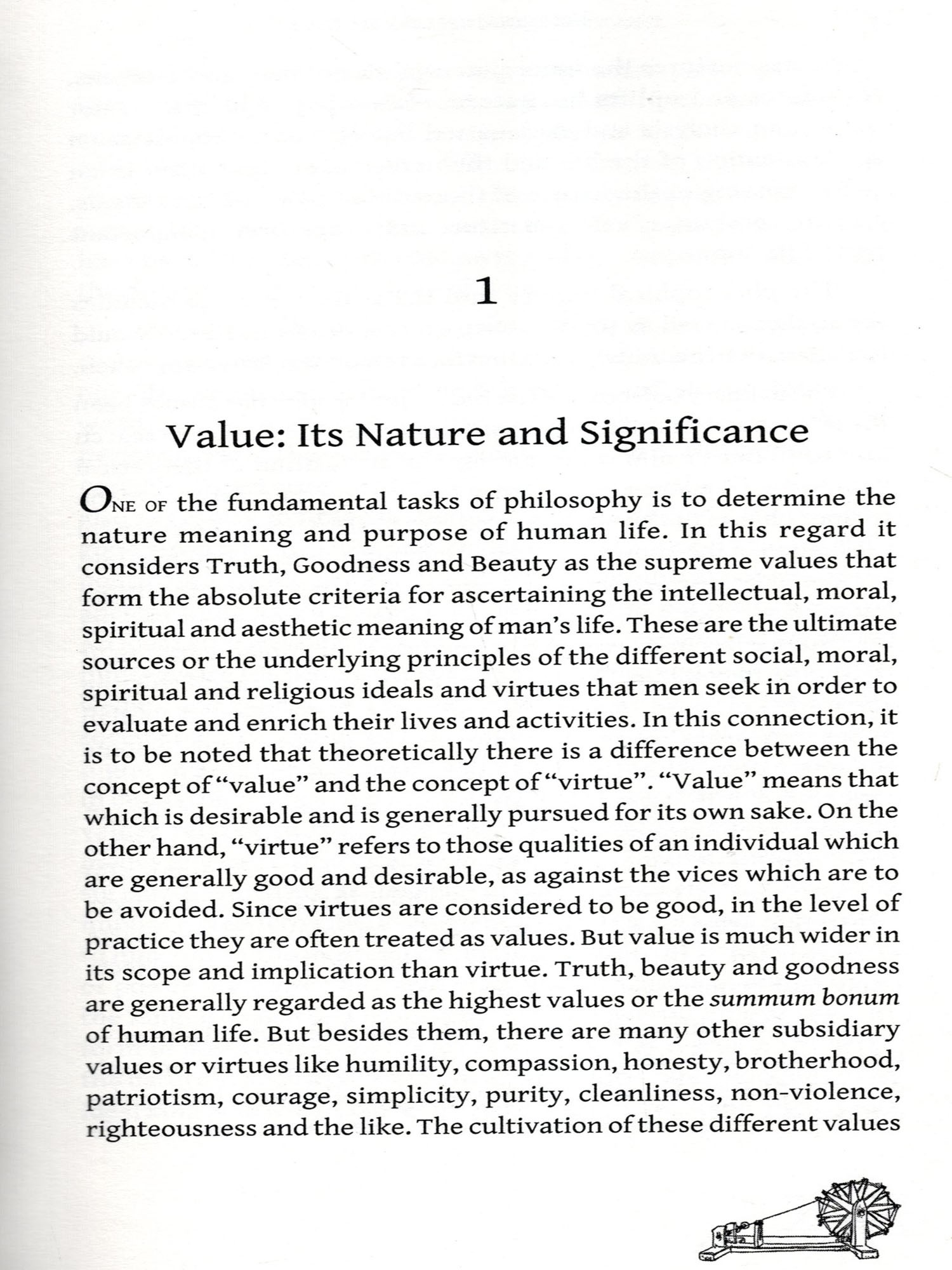 At present, the increasing violence, corruption, injustice and unending terror, as well as the excessive greed, love for more power and money that we are experiencing in every sphere of our social life show that lack of value-consciousness is gradually engulfing our lives, thoughts and activities. If we want to overcome this crisis of humanity, we must try to uplift ourselves and thereby reconstruct our society inculcating different human values such as love, peace, brotherhood and justice. In this mission to develop ourselves from within and rebuild our nation, we certainly need some guidance to take us from darkness to light. In this connection the values and the principles upheld by the pre-eminent personalities of India like Rabindranath Tagore, Swami Vivekanada, Mahatma Gandhi and Sri Aurobindo would be our best guides. During the later half of the nineteenth century and the beginning of the twentieth century, these noble thinkers of India, among many others, tried to improve and uplift the life of the nation and the mankind by interpreting traditional Indian values in modern light. With their ideas and actions they enriched the sociocultural and spiritual life of the then period. Now, if we, the people of the present century want to save ourselves from further social and moral degradation, we must once again become conscious of the essence and the effectiveness of the values suggested by those men of wisdom. We need to rethink and reassess, their thoughts and implement them in the best possible way. However, in the present book it is not possible to discuss the views of all those thinkers. My objective here is to explore the significant thoughts and ideals upheld and practised by the two eminent thinkers, Mahatma Gandhi and Sri Aurobindo, In accordance with this project, it is necessary to discuss first what we understand by the term "value".