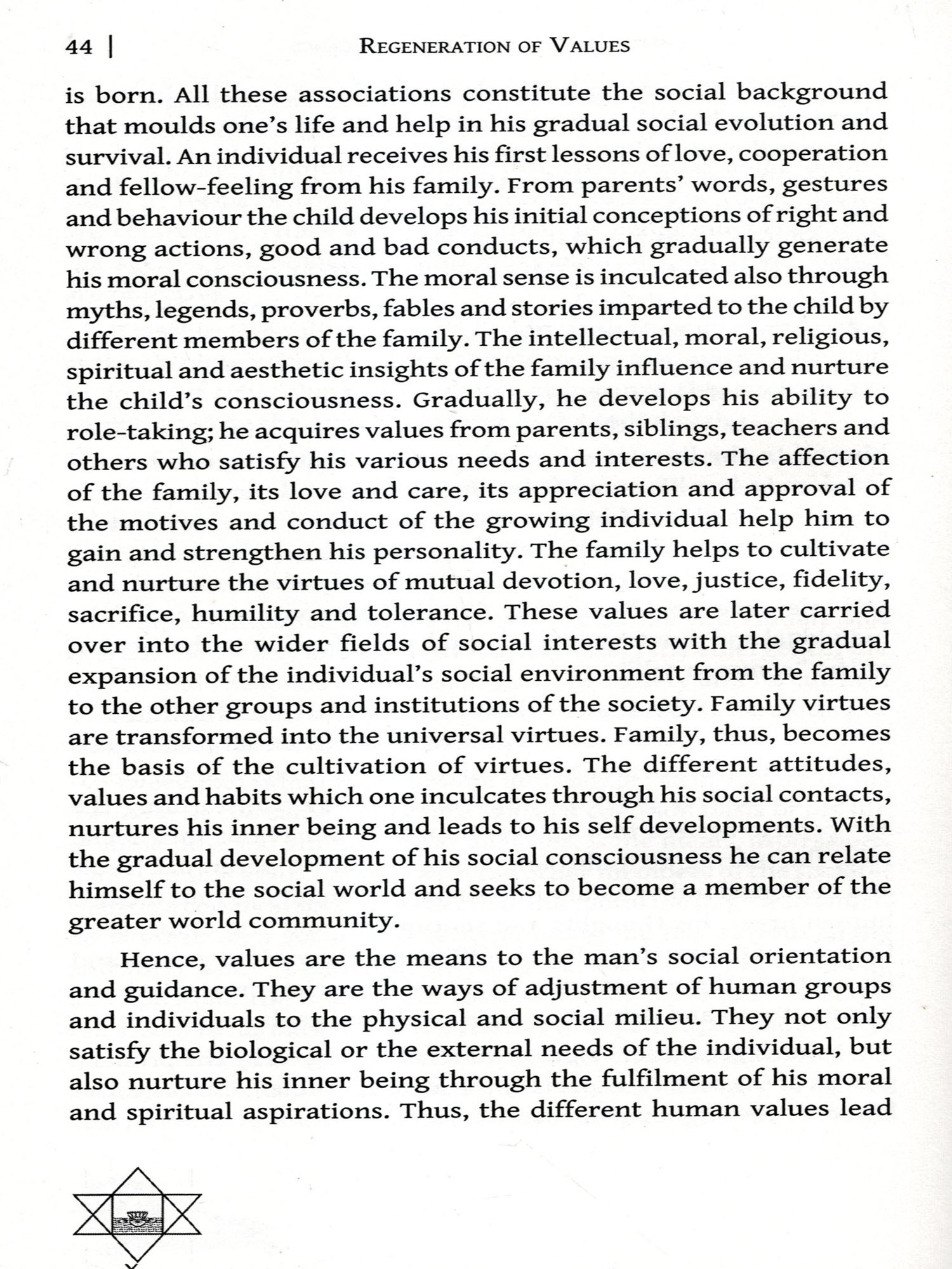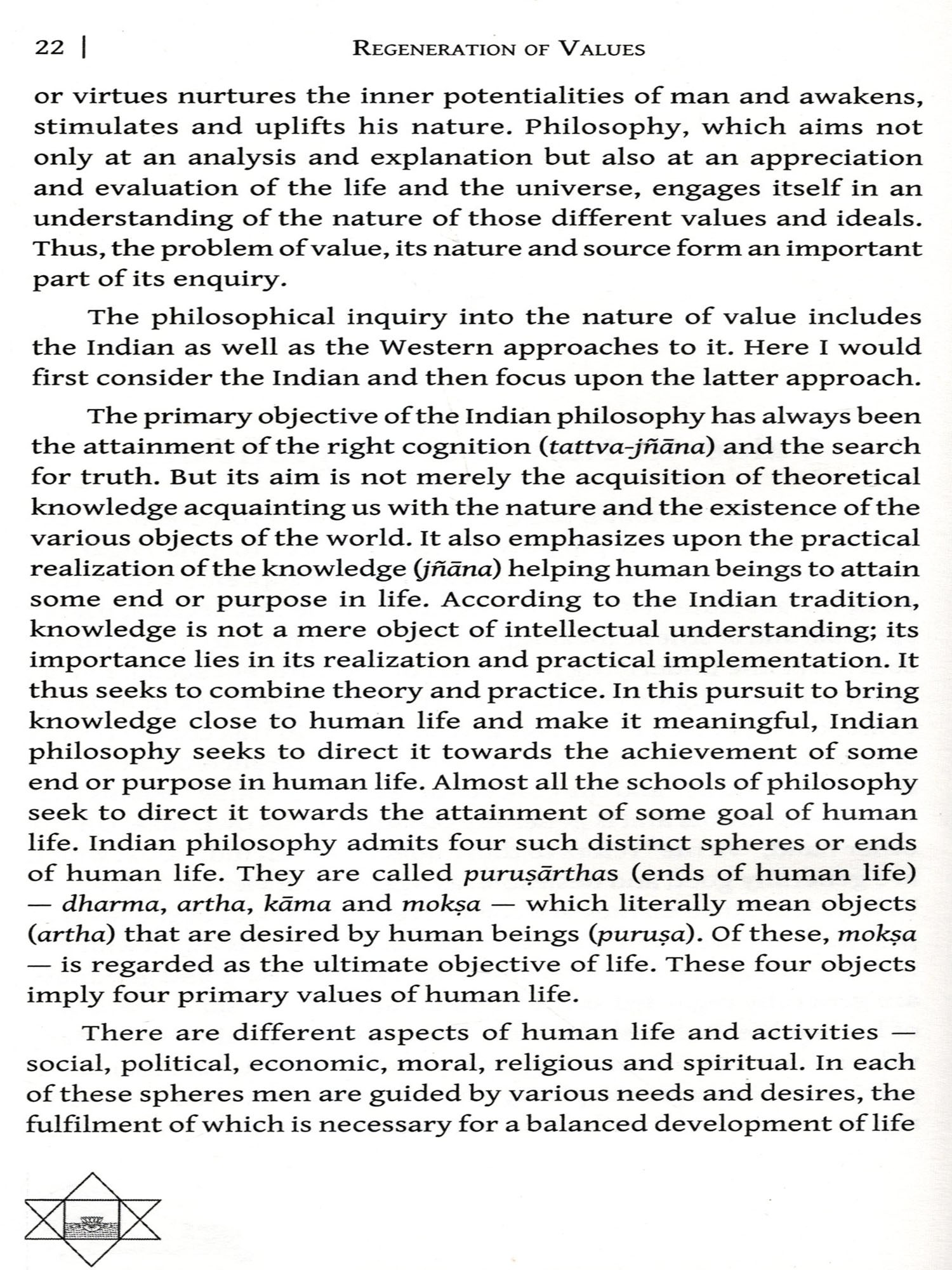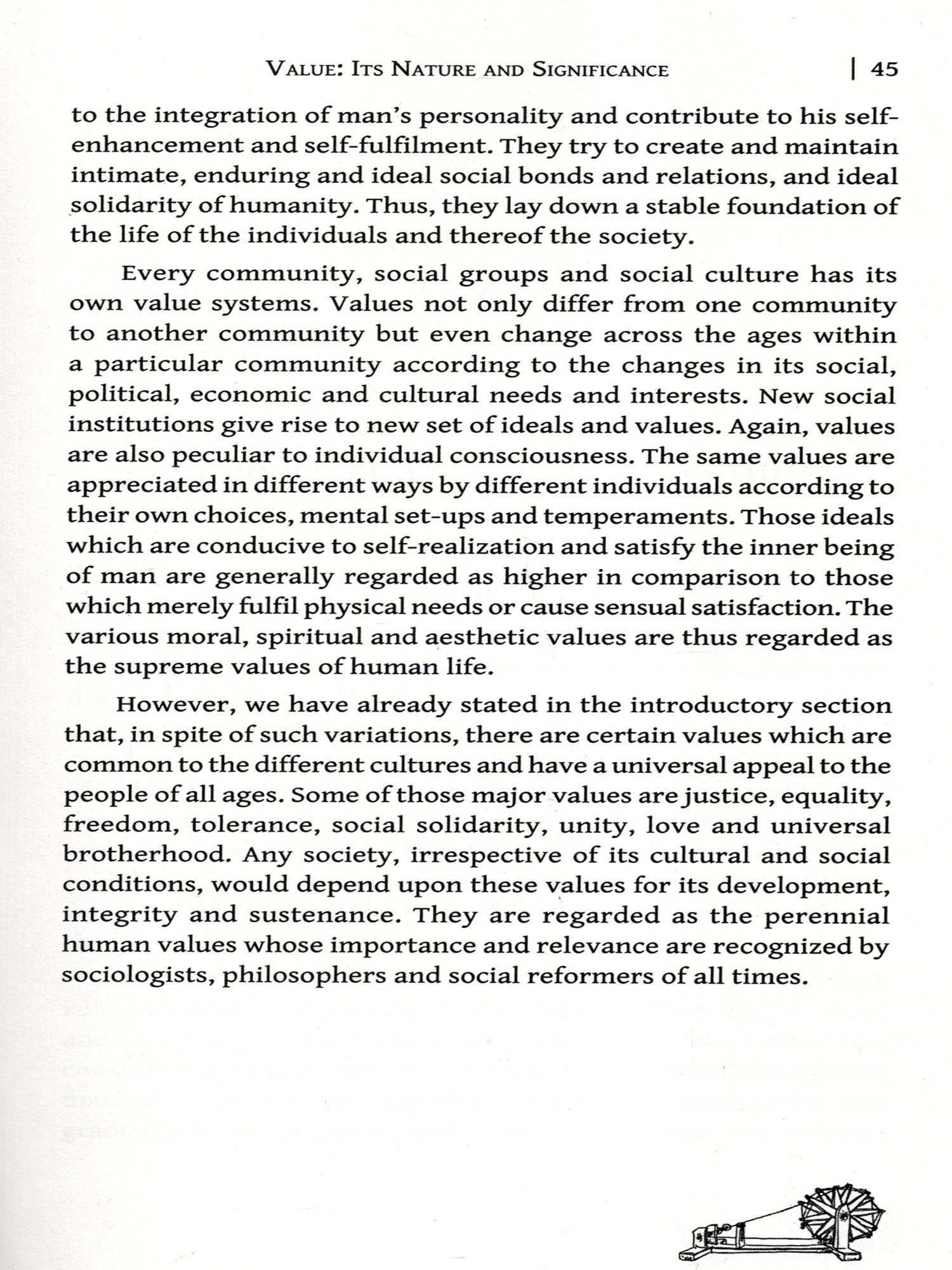 The term "value" is commonly used to refer to the worth of a thing. Etymologically, "value" is derived from the Latin word valere which means "to be strong" or "to have worth". Hence, value implies something which is either good in itself or the realization of which would produce something good or something worth while in human life. An object is regarded as good or valuable if it fulfils some human need or desire. For instance, food is valuable, for it satisfies our hunger; it is indispensable for the preservation and sustenance of human life. In this way anything that contributes to the maintenance and well-being of human life and society such as wealth or good health, may be regarded as valuable. But man is not satisfied only with the fulfilment of some external needs and interests. Beyond his physical body and mind his true nature consists of his being a self or a soul which has some deep moral and spiritual cravings and which seeks for its realization and manifestation. The intrinsic worth of human life lies in its attempts to develop such inner needs and potentialities and to attain self-fulfilment; the nurture of values prepares one to such self-development and self-realization. Value thus stands for some fundamental ideals and principles, and its inculcation would give a new shape and dimension both to the inner and the outer aspects of man's life. By enabling man to develop his inner potentialities and attain self-fulfilment, value helps to realize the deeper meaning of life. At the same time, it shapes human sentiments, moulds man's social behaviour and defines social relationships.