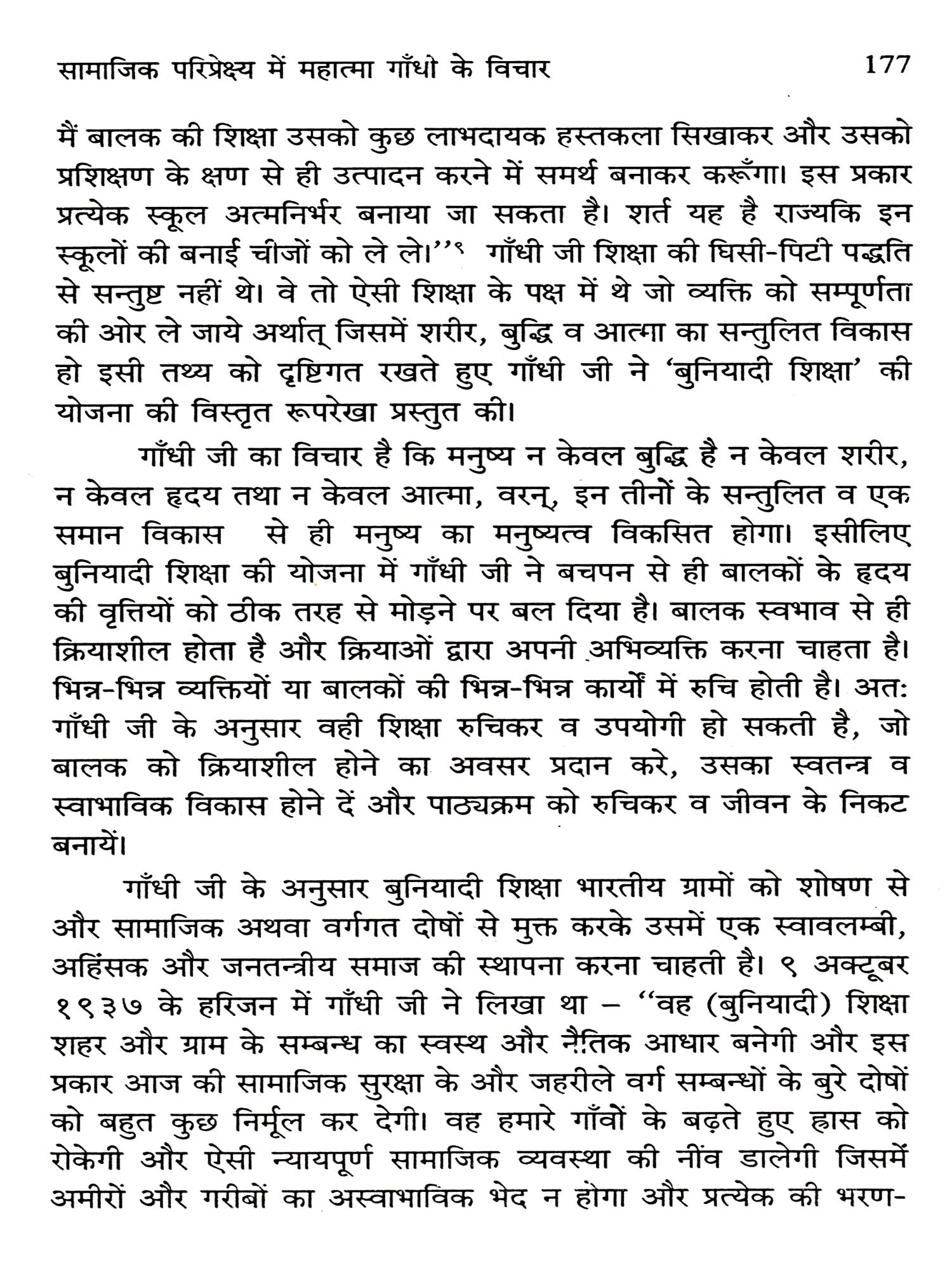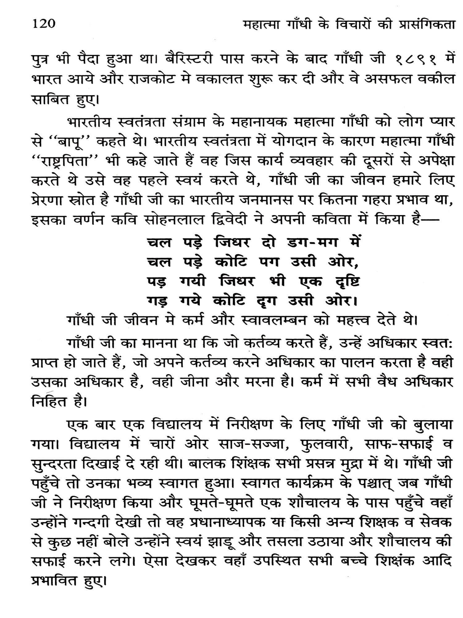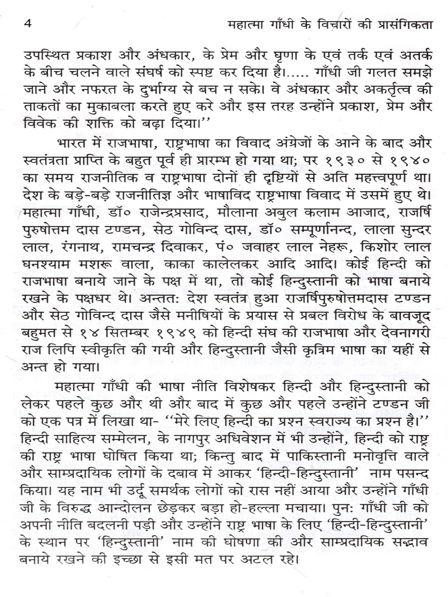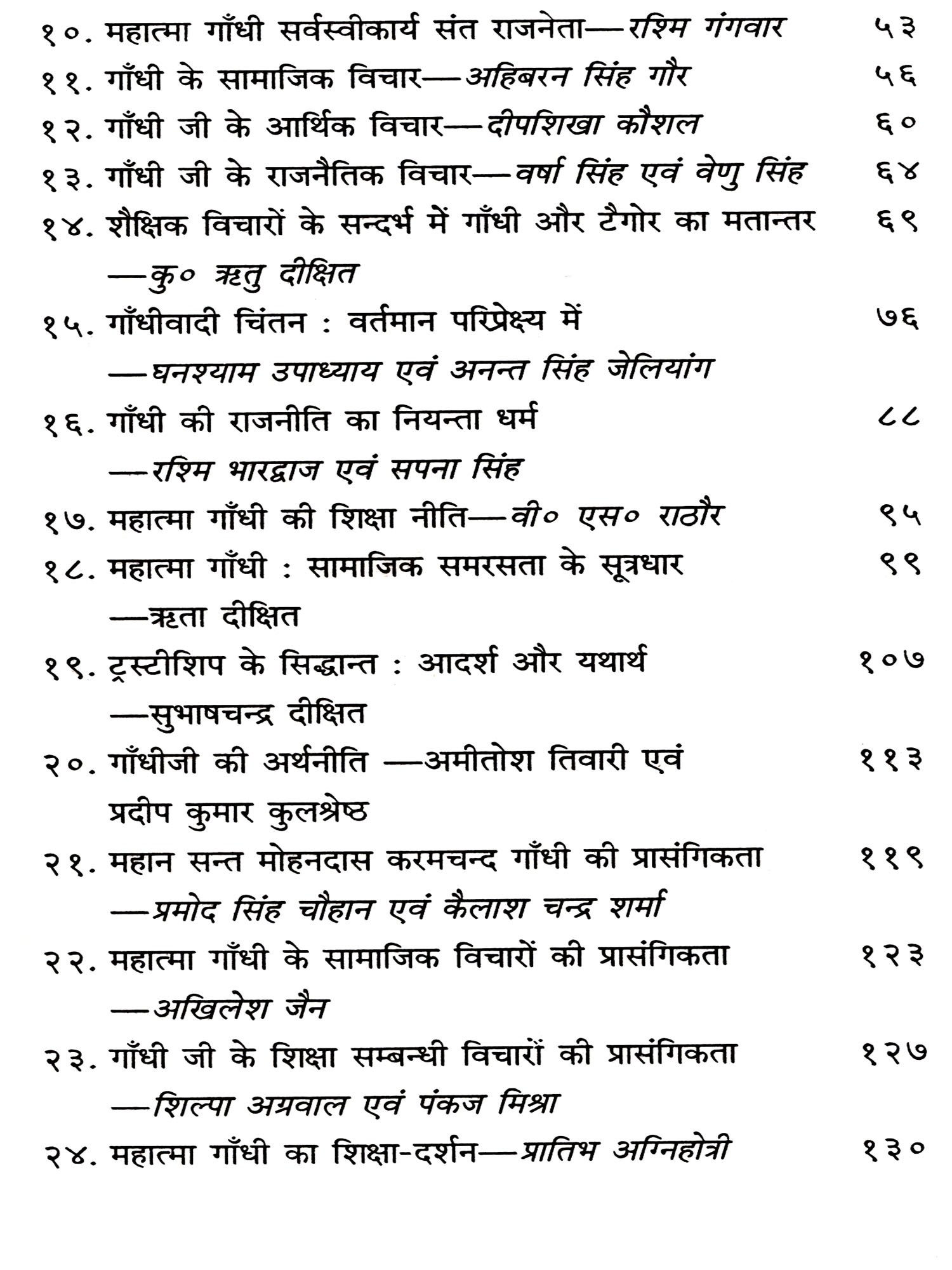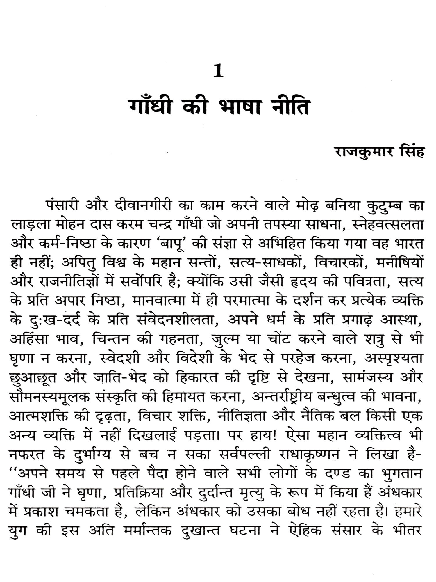 महात्मा गांधी एक सत्य शोधक एवं धर्मप्राण राजनेता थे जिन्होंने मानव जीवन को पूर्णता प्रदान करने वाले सभी बिन्दुओं पर अपने विचार व्यक्त किये। मुख्यतः यह विचार बिन्दु हैं धर्म, दर्शन, इतिहास, राष्ट्र, समाज, कुटुम्ब, स्त्री, पुरूष, युवा, छात्र, राजनेता, राजनीति, किसान एवं व्यवसायी आदि। इन सभी पर उन्होंने विशद चिन्तन कर अपने विचार व्यक्त किये है। गांधीजी सत्य एवं अहिंसा को समस्त समस्याओं का समाधानकारक मानते थे। आज की राष्ट्रीय पारिस्थितिक आलोक में राष्ट्रपिता महात्मा गांधीजी को सामान्य रूप से समस्त शोषित एवं पीडित मानवता के रक्षक रूप में तथा भौतिक-वादी तथा स्वार्थपरक भावनाओं से ग्रस्त एवं दिग्भ्रान्त भारतवासियों के मार्गदर्शक के रूप में माना जा रहा है।