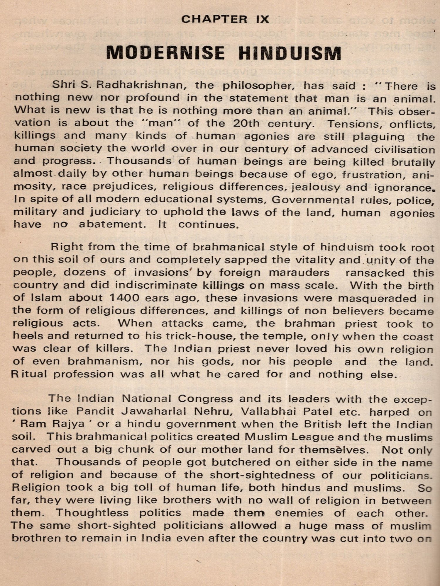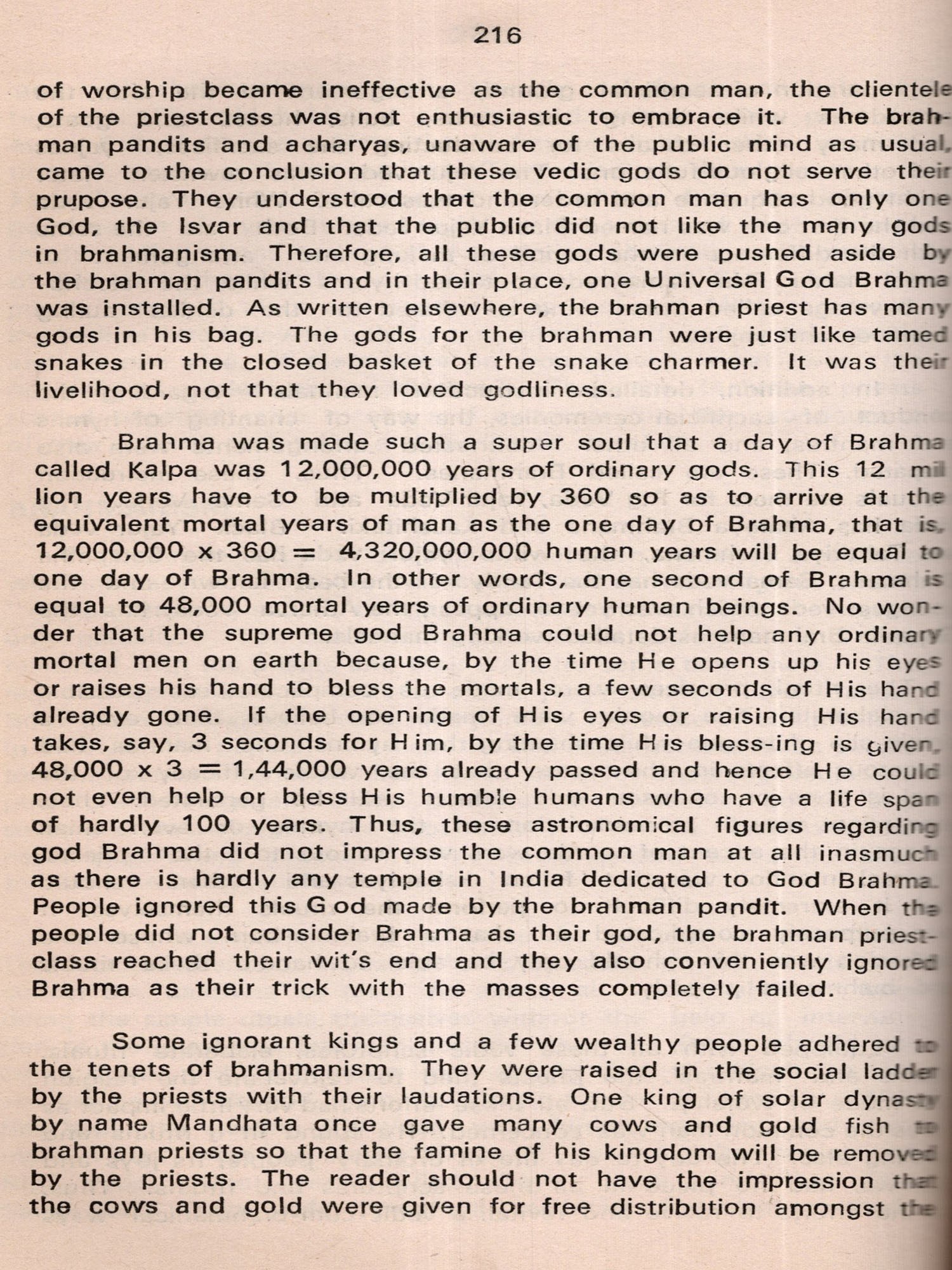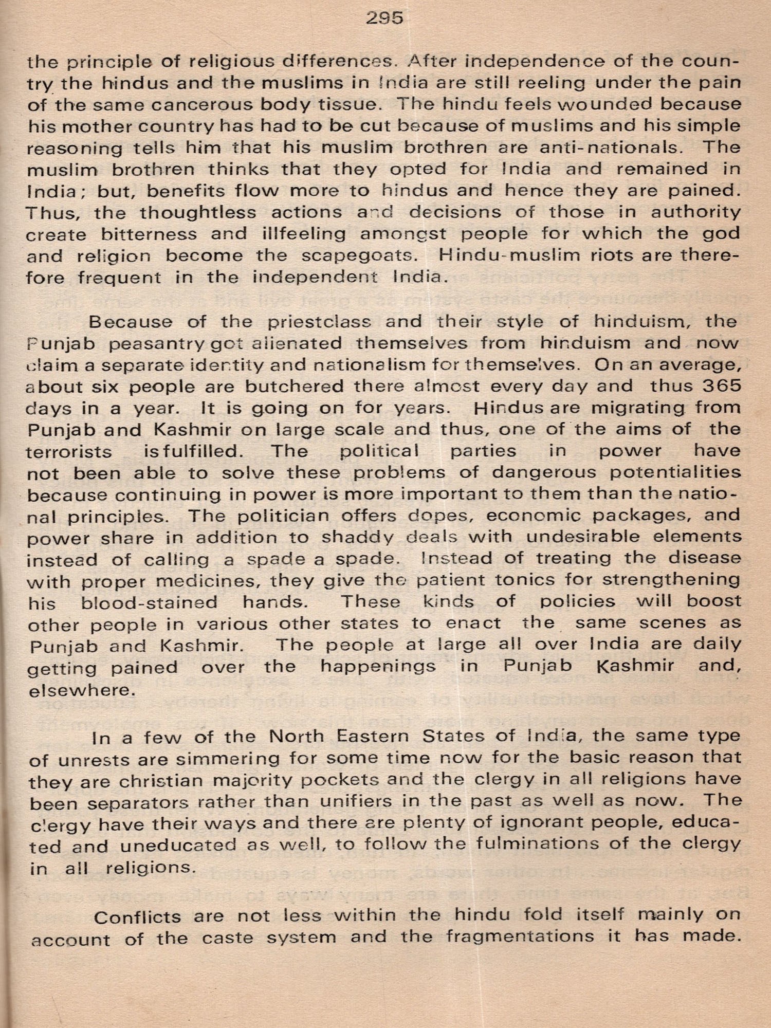 Our hindu religious leaders are not worried about Punjab problem, Kashmir insurgency and the many riots that take place in the name of caste and religion. That is not their concern. How can they be concerned about it when the undeclared aim of brahmanical hinduism has always been pushing the 98 per cent of the people of this country down the drain. Upliftment of the common man has never been in their agenda ever before. It is, therefore, the urgent duty of the common public to organise our religion as it originally was so that it will stand as guide and support in the various trials and tribulations of daily life. There is nothing that we should invent and then implement. Everything is there in our soil. We have only to rediscover it by washing away all the filth thrown on it by the ancient priestclass of this country. Brahmanical hinduism has done enough harm. It should not do any further. The lsvar religion, the most purposeful of all the religions of the world, the first and the oldest, has to be understood as it really is. Most of us are already adherents of this religion, brahmans and non, brahmans alike, though many do not know its basic tenets and original principles. The emphasis should be to rectify the past undoings. The false premises on which this religion is surrounded, have to go for ever. Then Only the disastrous effects of the Code of Manu and other make-believe anecdotes in our ancient books can be eliminated and the nation put back into one piece in letter and spirit.