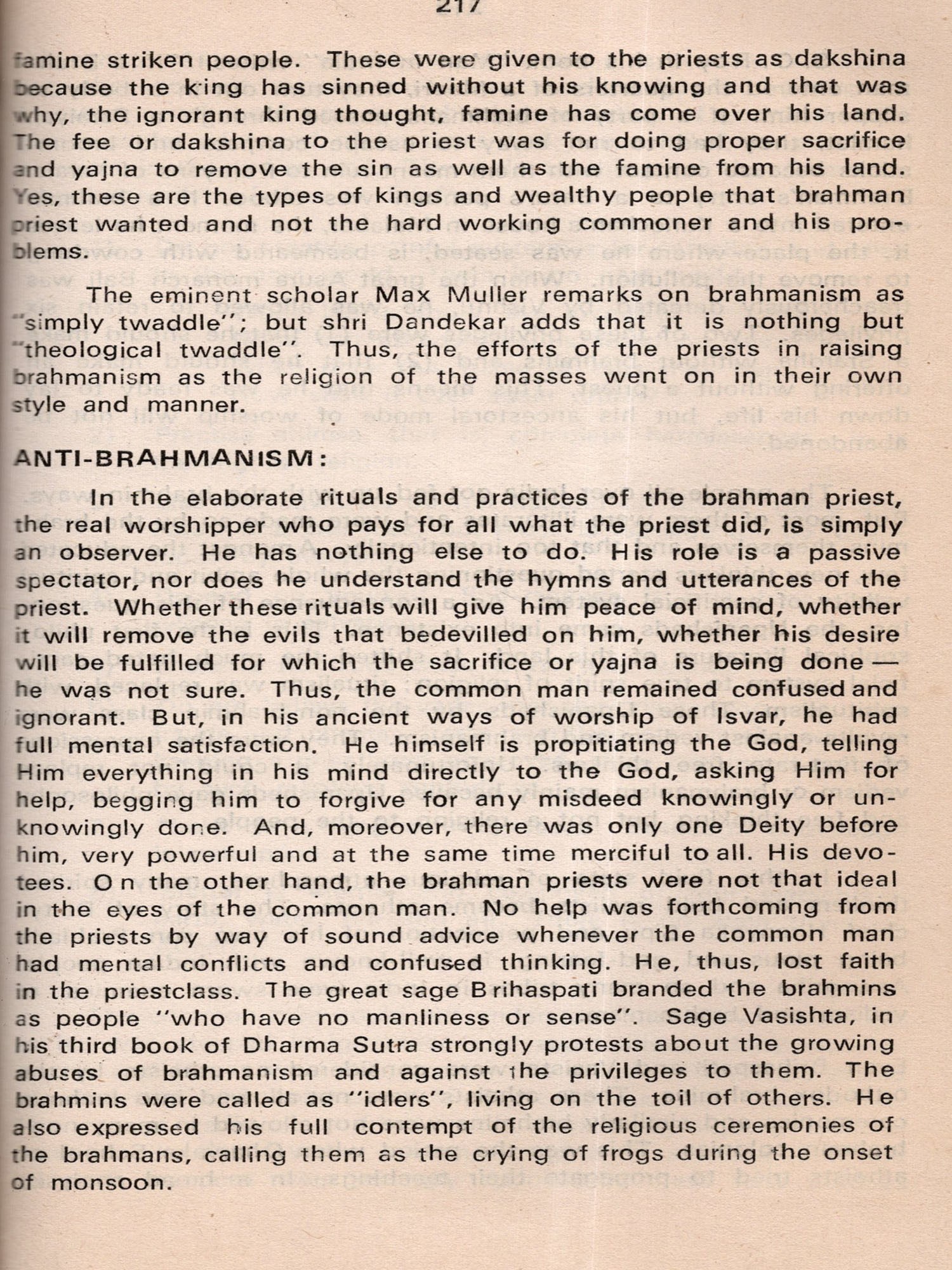 The eminent scholar Pargiter has said that "hinduism is a stupendous fraud" and it is so. As a thief is said to leave his marks while decamping with the booty, we have to put two and two together to extract some truth out of our voluminous religious texts. However, it is our duty to rediscover our real religion if it was worth its salt once. It was pushed off its track by the selfish priestclass of old. Many of their descendents do not regret it even now because the original religion of this land, the Isvara, has never been their religion. They were pure adulterers. As Muslims and Englishmen were our masters in the political field, the brahman priests were our masters in the religious field. Brahmanism was alien to this land and was also alien to the migrated aryans.
