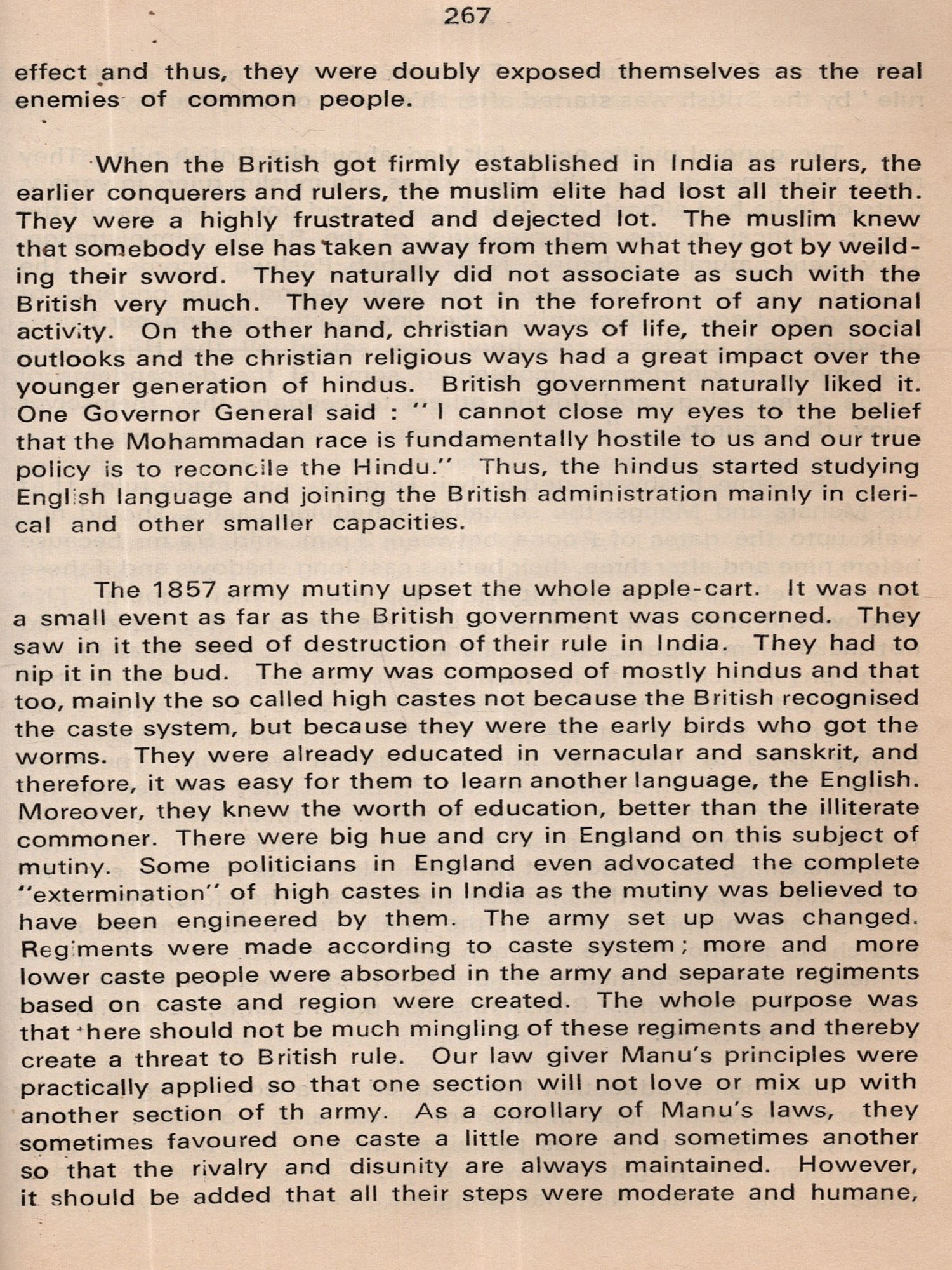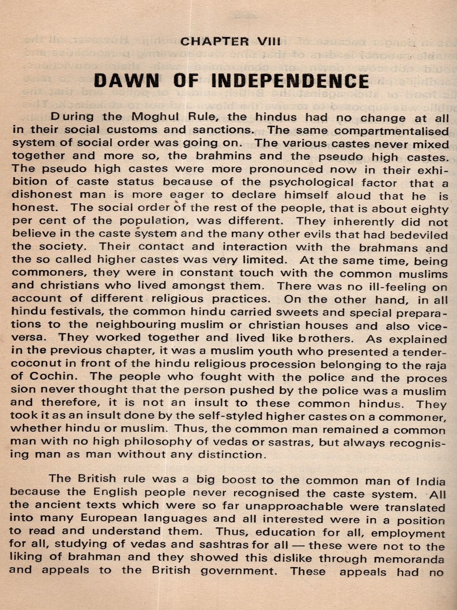 When two christians talk each other, they happily discuss on Lord Jesus and, christianity. When two muslims talk, brotherly feelings bind them together. But, when two hindus. talk, they may talk on all? subjects under the sun except hinduism. When the word 'hinduism' is heard, a hindu casts his head down in thought or look into a different direction and avoids the subject. Generally, he does not say anything on the subject. If at all he talks, there is evidently no enthusiasm in the talk. Words get stuck up in his throat. Words get stuck up because one hindu cannot talk on hinduism unless he knows the caste of the other man with whom he talks. The views on hinduism radically differ from caste to caste. The meaning of religion, its social purpose and interpretations are drastically different between the various denominations of castes and sub-castes. It is a religion of oppressors and oppressed under the same umbrella. The true story of our hindu religion is that the villains became demi-gods and godly men and saints became demons. Hinduism has never been a binding force for the people of India; it remained, rather, a divisive force for all intents and purposes.