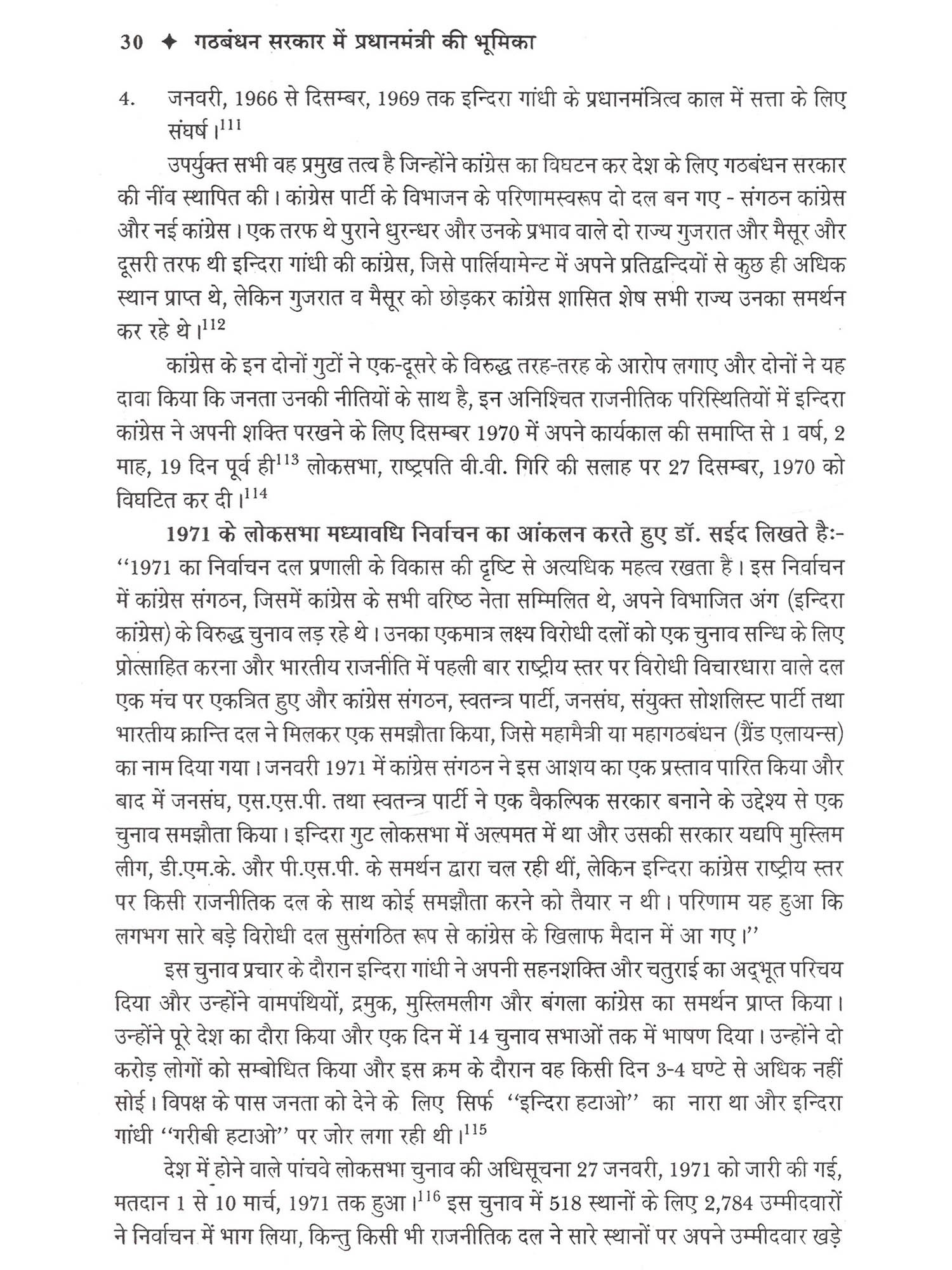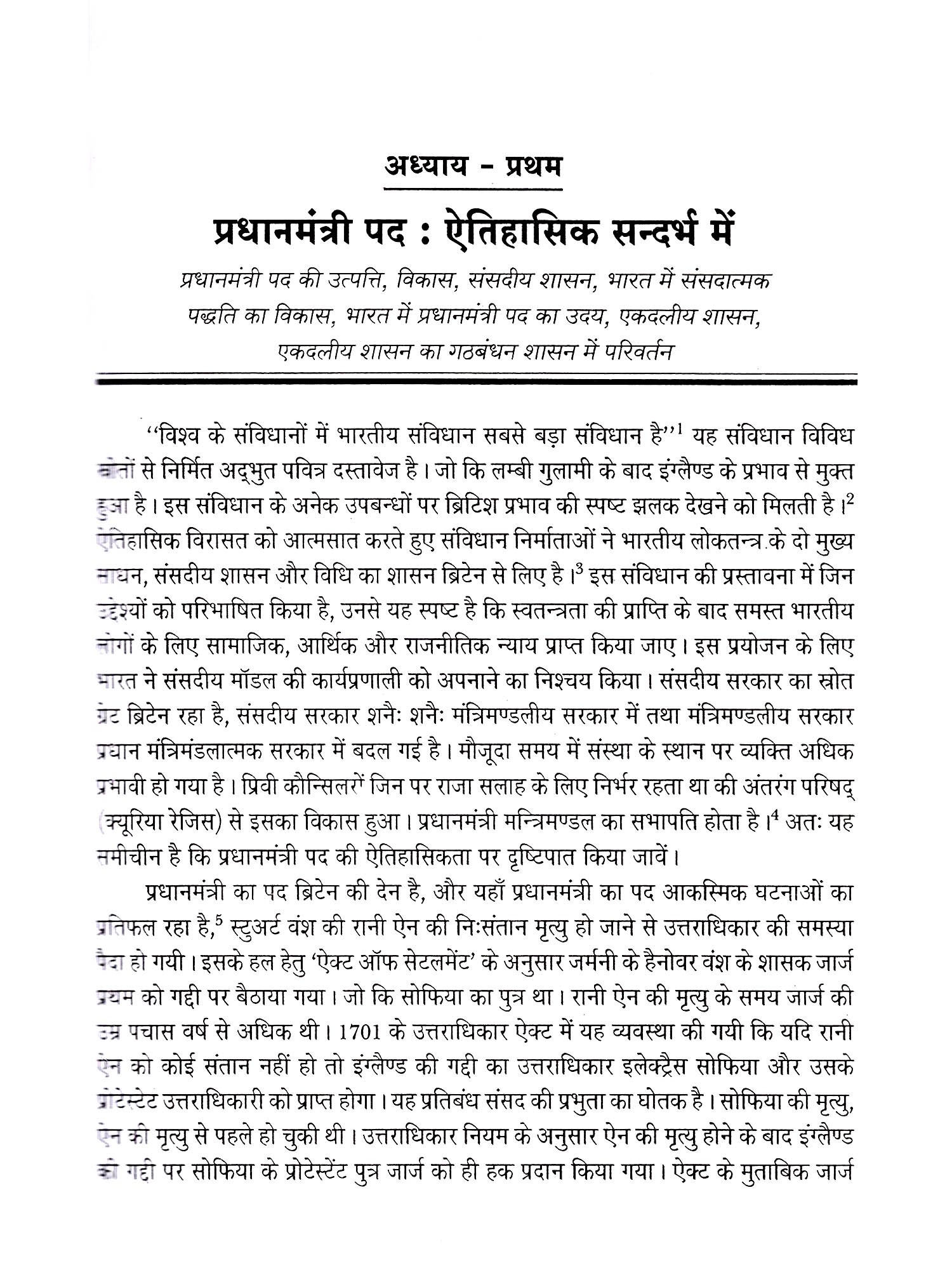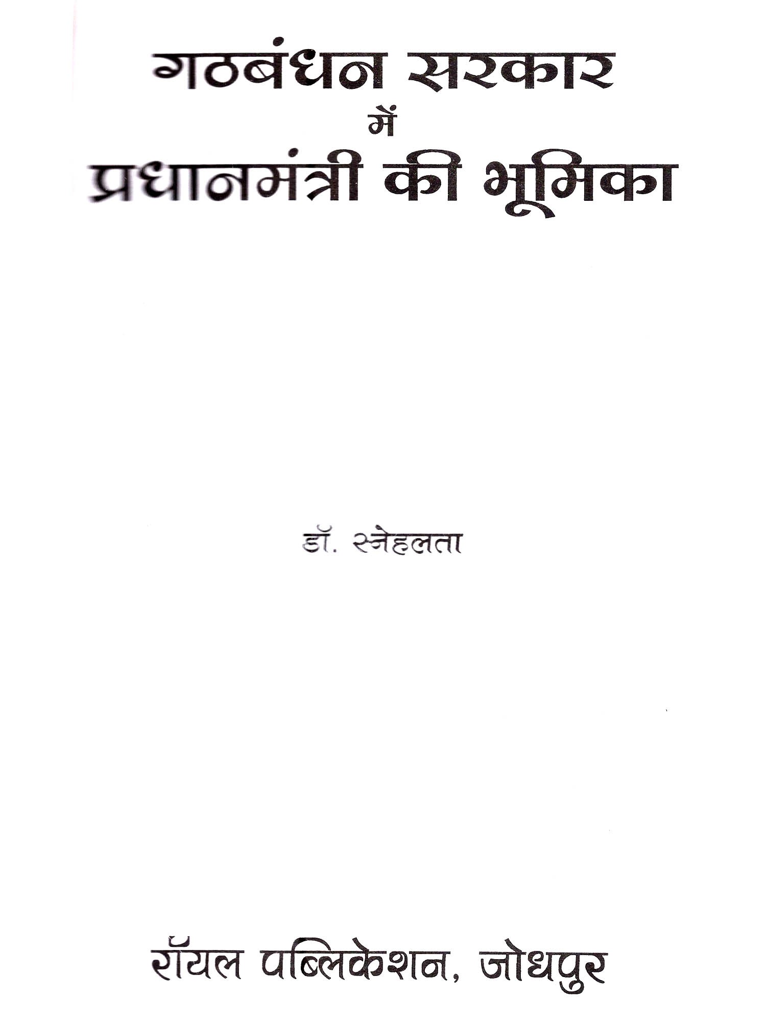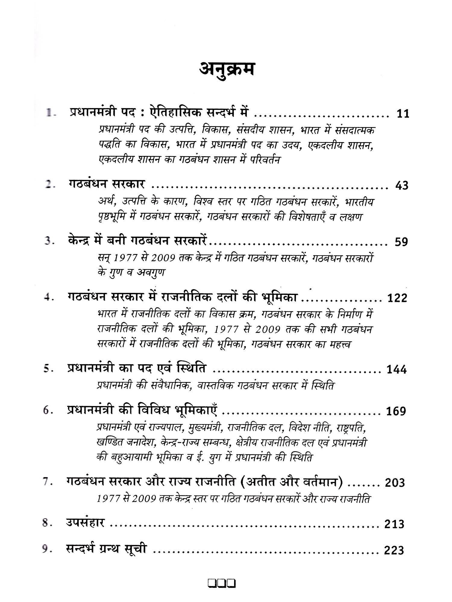 प्रस्तुत पुस्तक 'गठबंधन सरकार में प्रधानमंत्री की भूमिका' भारतीय राजनीति में केन्द्र स्तर पर गठबंधन सरकार के आगमन व इससे उत्पन्न राजनीतिक परिस्थितियों को प्रकट करती है। इसको सात अध्यायों में विभाजित किया गया है। पुस्तक में सैद्धान्तिक, व्यावहारिक, प्रक्रियात्मक, पर्यवेक्षणपूर्ण तथ्यों को स्थान दिया गया है। पुस्तक के प्रथम अध्याय में प्रधानमंत्री पद के ऐतिहासिक संदर्भ को दर्शाया गया है। साथ ही भारत में प्रधानमंत्री पद का उदय व एकदलीय शासन का गठबंधन सरकार में परिवर्तन को सम्मिलित किया गया है। दूसरे अध्याय में गठबंधन सरकार का अर्थ, विशेषता व लक्षण बताये गये हैं। साथ ही विश्वस्तर पर गठित गठबंधन सरकार व भारतीय पृष्ठभूमि में गठबंधन सरकारों को दर्शाया गया है। अध्याय तृतीय में केन्द्र स्तर पर 1977 से 2009 तक बनी गठबंधन सरकारों का सविस्तार वर्णन प्रस्तुत किया गया एवं गठबंधन सरकारों के निर्माण और कमजोरियों पर प्रकाश डाला गया है। अध्याय चतुर्थ में गठबंधन सरकार में राजनीतिक दलों की भूमिका व गठबंधन सरकार के महत्त्व को बताया गया है। अध्याय पंचम में प्रधानमंत्री की संवैधानिक, वास्तविक एवं गठबंधन सरकार में स्थिति पर प्रकाश डाला गया है।