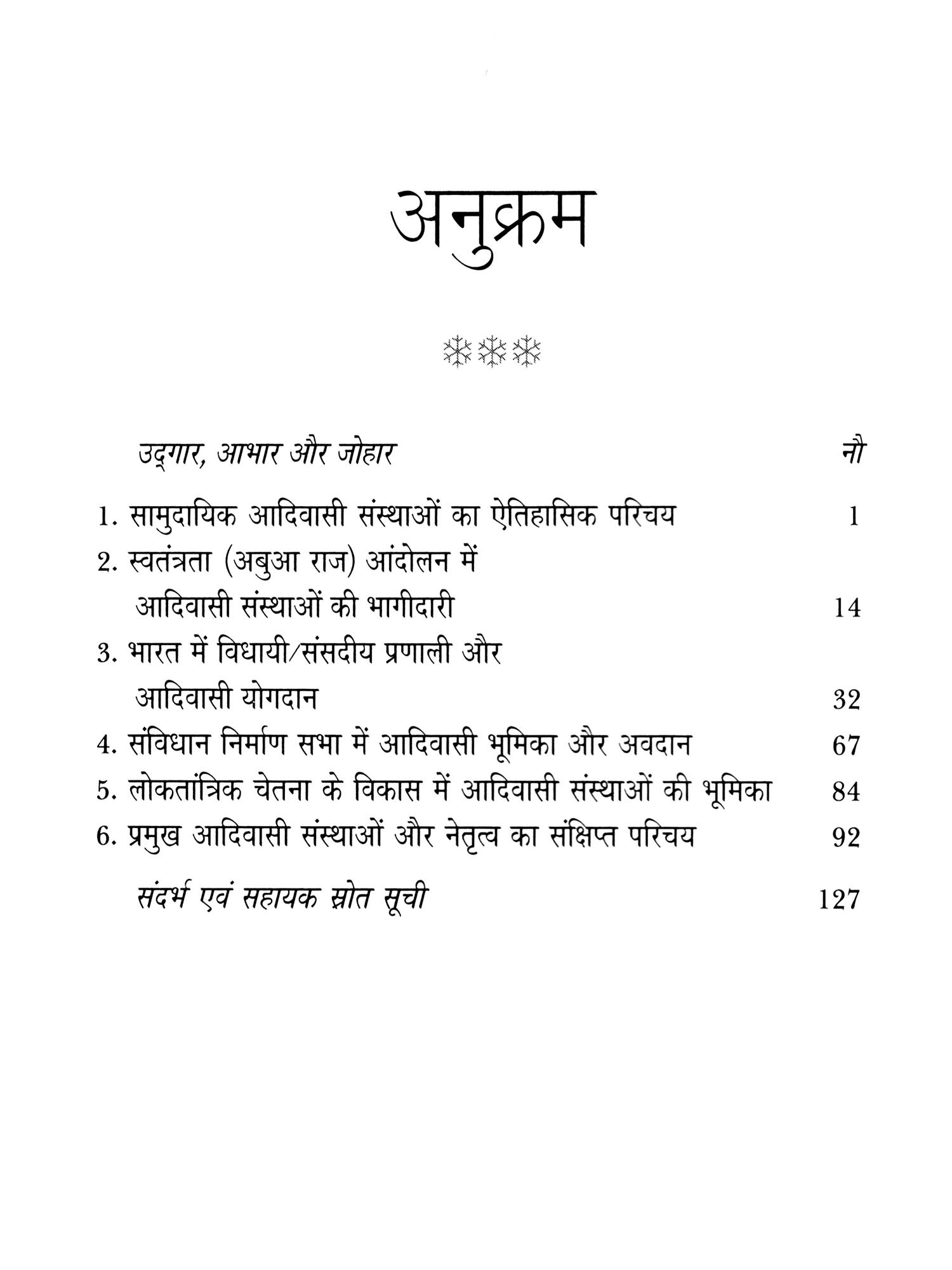 इन सब विषयों में आदिवासियों ने शिद्दत के साथ शिरकत की और देश को लोकतांत्रिक बनाने में हर तरह से भागीदारी की। आदिवासियों के योगदान और सभी सामाजिक-राजनीतिक संगठनों व उनके दूरदर्शी नेतृत्व की बदौलत नई लोकतांत्रिक विधायी व्यवस्था कायम हुई और संविधान द्वारा दिये गए अधिकारों ने समाज को एक नई दिशा दी, जिसके फलस्वरूप भारतीय समाज में आज भी विभिन्न भाषाएँ, धर्म, जातियाँ और संस्कृतियाँ सह-अस्तित्व में हैं, जो इसे एक अद्वितीय समाज बनाती हैं।