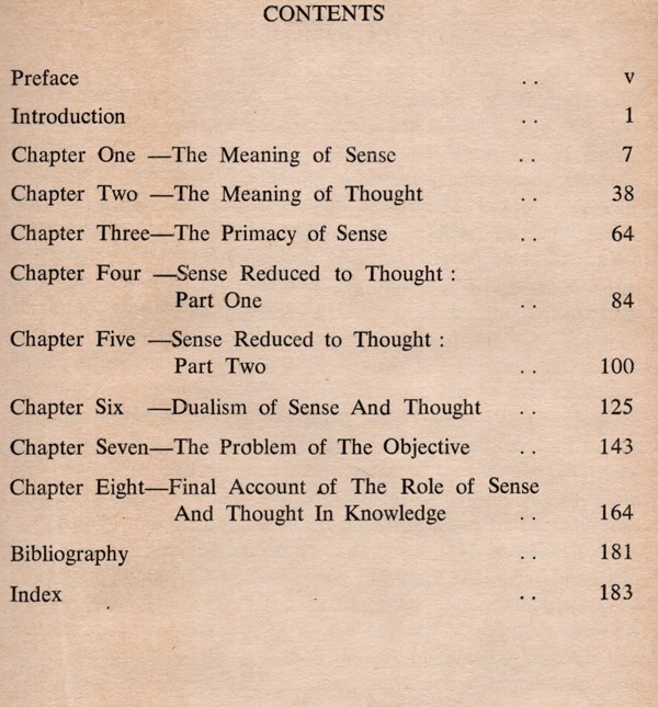 The work which follows may be taken as an epistemological treatise. Empiricism and rationalism as two rival theories of the origin of knowledge have always attracted my interest and attention. The fundamental problem that underlies the age long controversies between empiricists and rationalists is the problem of determining the role of sense and thought in knowledge. I have subjected the traditional approaches made to this problem by philosophers belonging to diverse schools of philosophy to a thorough examination and have indicated what I consider to be the most balanced and plausible view. My humble endeavour has been to combine certain results which were reached by earlier empiricist and rationalist thinkers and should be considered valuable by all. I have tried to indicate that instead of taking an opinionated view of the problem, it is possible to uphold a balanced view. It is this balanced view and the combination of results of permanent value which I have highlighted in this work. The pre-sent volume was my thesis for the Ph.D. degree of the Calcutta University.