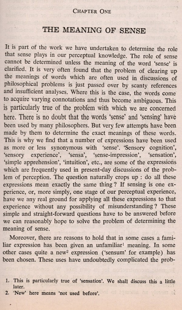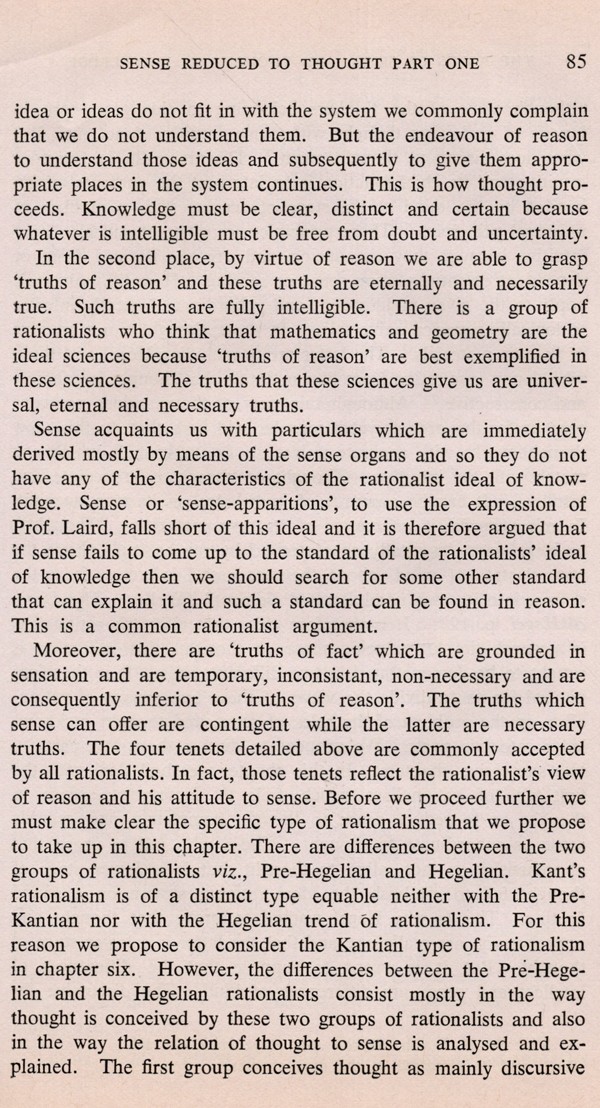 and rationalists alike. Besides, to discuss the roles of all these factors of knowledge in a single treatise is a huge task which we like deliberately to avoid here. Hence we shall be concerned with the problem of determining the roles of sense and thought in knowledge. Recognition of sense and thought as indispensable components of knowledge is quite common. But the manner in which sense and thought are conceived by different philosophers varies widely and this divergence is not less prominent in their attempts to determine the respective roles of sense and thought in knowledge. The question that has haunted philisophers for centuries is, does sense or thought play the primary role in know-ledge or, are both sense and thought required for knowledge? If we notice the various ways in which philosophers have approached and analysed this problem we can hardly resist the temptation of supporting the witty remark of Berkeley that "Philosophers first raise a dust and then complain that they cannot see". Perhaps it will not be amiss here to point out that there are two dangers against which we must guard ourselves. The first is metaphysical bias and the second is the vagueness of the words "sense' and 'thought'. Let us try to be more precise.