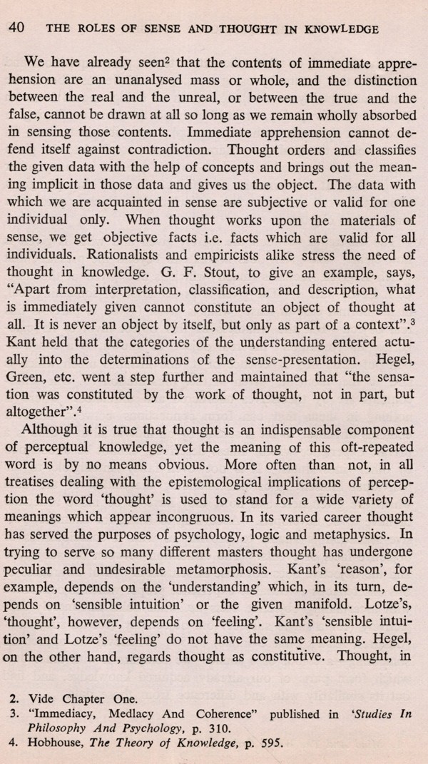 Our ordinary perceptual knowledge reveals on analysis the presence of two components viz., sense and thought. The presence of these two components may not be apparent in any or every example of perceptual knowledge because in many cases of such knowledge they are intermixed and intertwined. But we can with some effort of attention distinguish between an immediate awareness or a direct awareness of something which is presented to us at a certain moment and our habitual interpretation (or retention, classification, ordering etc.) of it by thought. Let us take an example from Hobhouse. "This is green" or "that's a loud rushing noise" does not go beyond the present and makes no assertion about a definite object that we can be said to know But the judgment "This is my table" or "That is a train" requires both sense or immediate awareness of something presented to me now and here and an interpretation of it by thought. In other words, in order to make such a judgment we require not only the immediate presence to consciousness of the train or the table but also a clear recognition of the individual that is presented as belonging to a definite class. We can thus distinguish between certain data which are given to the mind and an interpretation of those data with the help of the activity of thought. What is generally called 'sense' points to the pre-judgmental stage of our cognitive experience and is characterized by immediacy and givenness. On the other hand, the main function of thought is one of interpretation. The question might be raised, are sense and thought the only requirements of knowledge? Certainly not. Besides sense and thought knowledge involves memory, imagination, physiological apparatus, etc. Although the importance of the factors other than sense and thought can hardly be under-estimated yet the fact that sense and thought play more fundamental roles in knowledge is generally accepted by empiricists.
