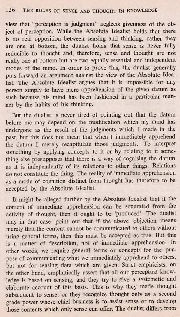 The Absolute Idealists, Bergson, and others have been inspired and guided by their views of ultimate reality. The Absolute Idealist's view of concrete thought is closely linked with his view of ultimate reality. Similarly Bergson's eulogy of 'intuition' and his comparative denunciation of 'intellect' are rooted in his theory of the Elan Vital. We see therefore that the views of these philosophers have been coloured by (because they are supposed to be consistent with) their conception of ultimate reality. But this, we are afraid, does not solve the problem, rather it creates problems of its own. We shall have occasions later to discuss the pros and cons of such endeavours. We hold that the problem is to be approached not with any metaphysical bias or any particular psychological theory in mind. It is a problem that demands in-dependent inquiry and has to be solved, if at all, mainly with reference to perceptual experience.