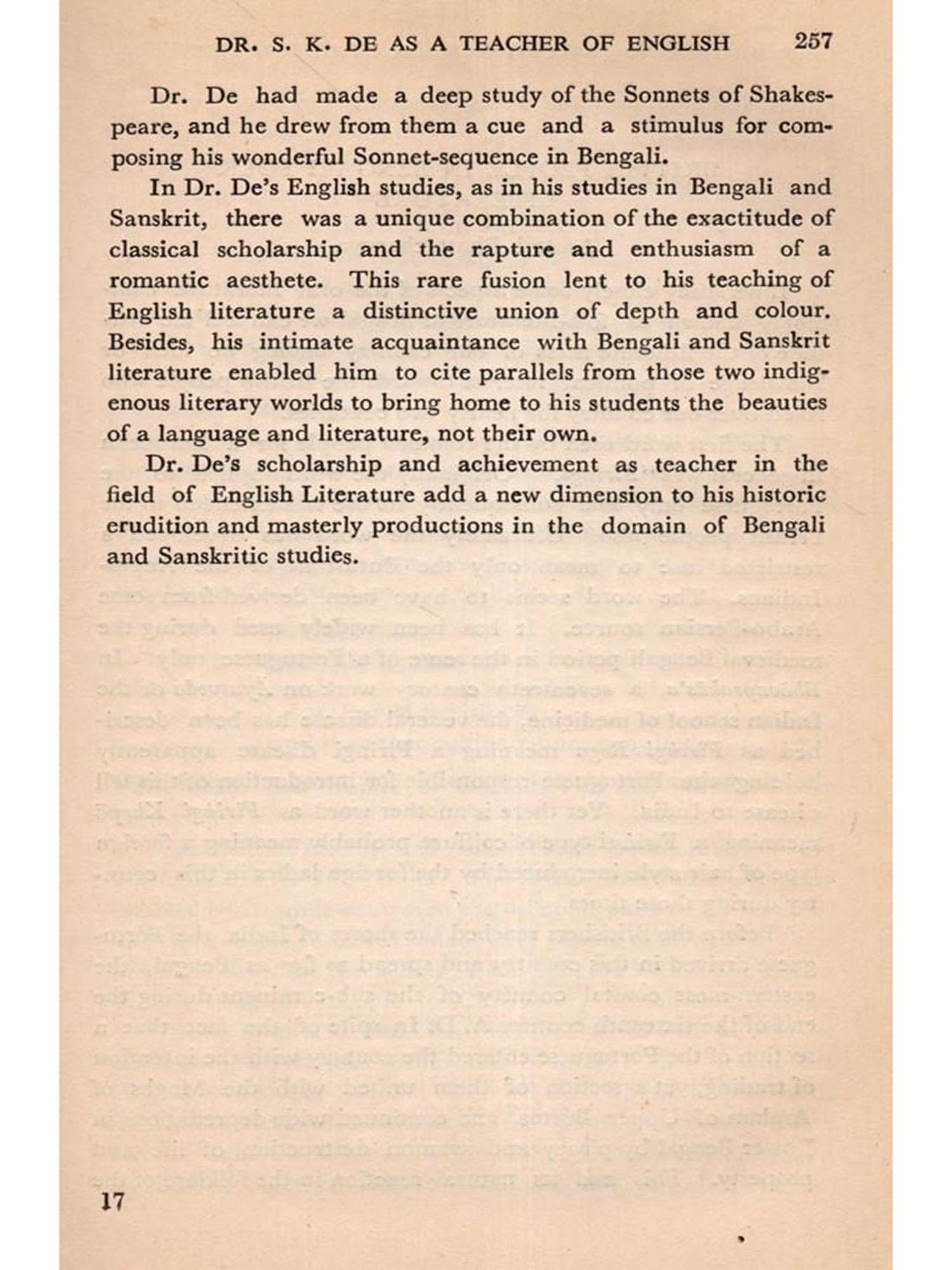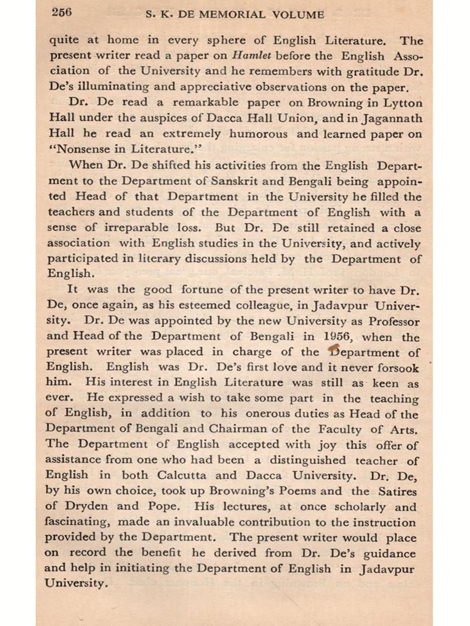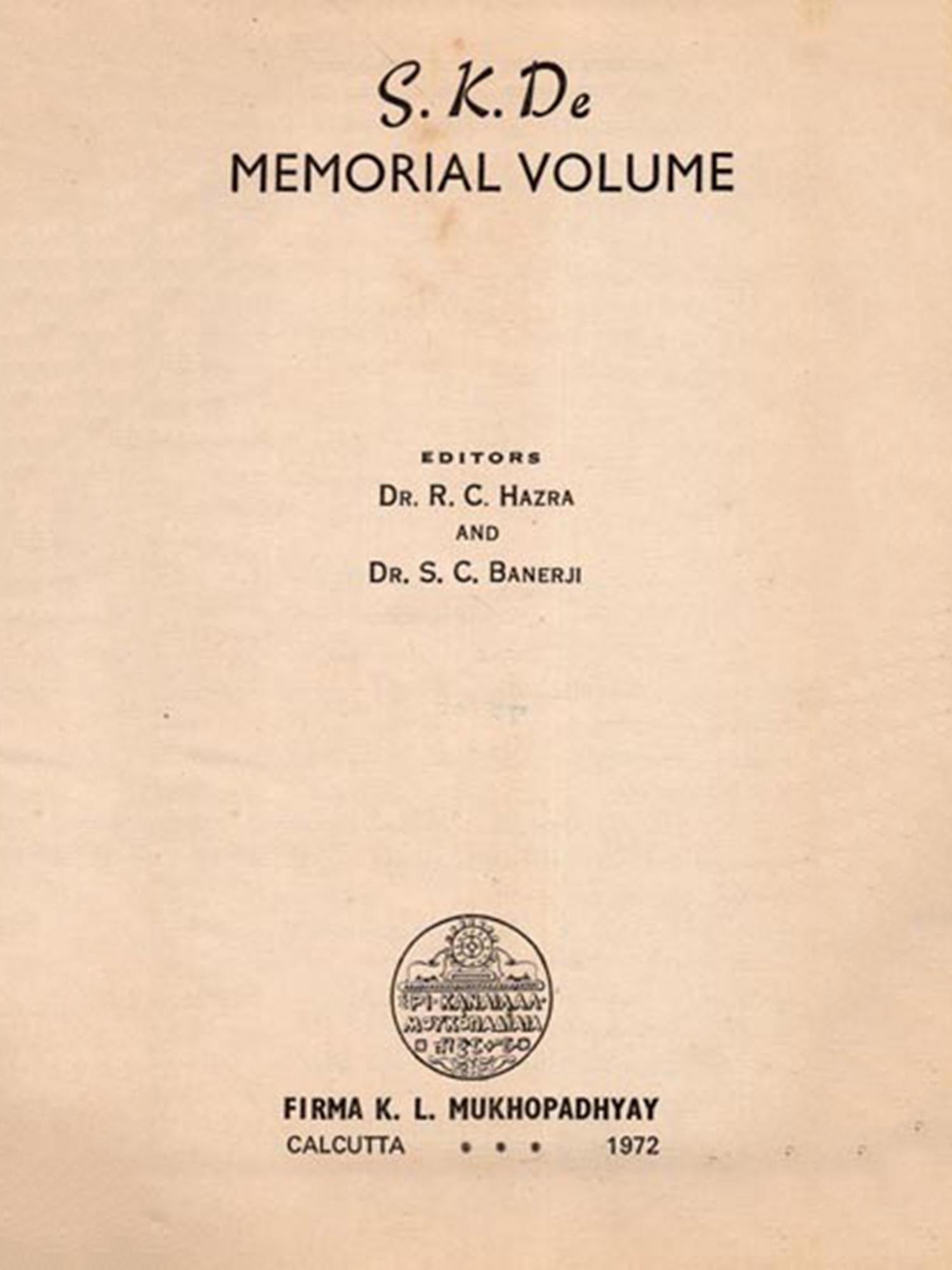 Immediately after the demise of Prof. S. K. De, a committee, called S. K. De Memorial Committee, was constituted with Dr. R. C. Majumdar as the President. The Committee got a ready and generous response from the scholarly world, both Indian and foreign, to its appeal for contribution for the projected S. K. De Memorial Volume. We are grateful to the scholars who have enriched this Memorial Volume by their valuable papers. We take this opportunity to thank them all most heartily.