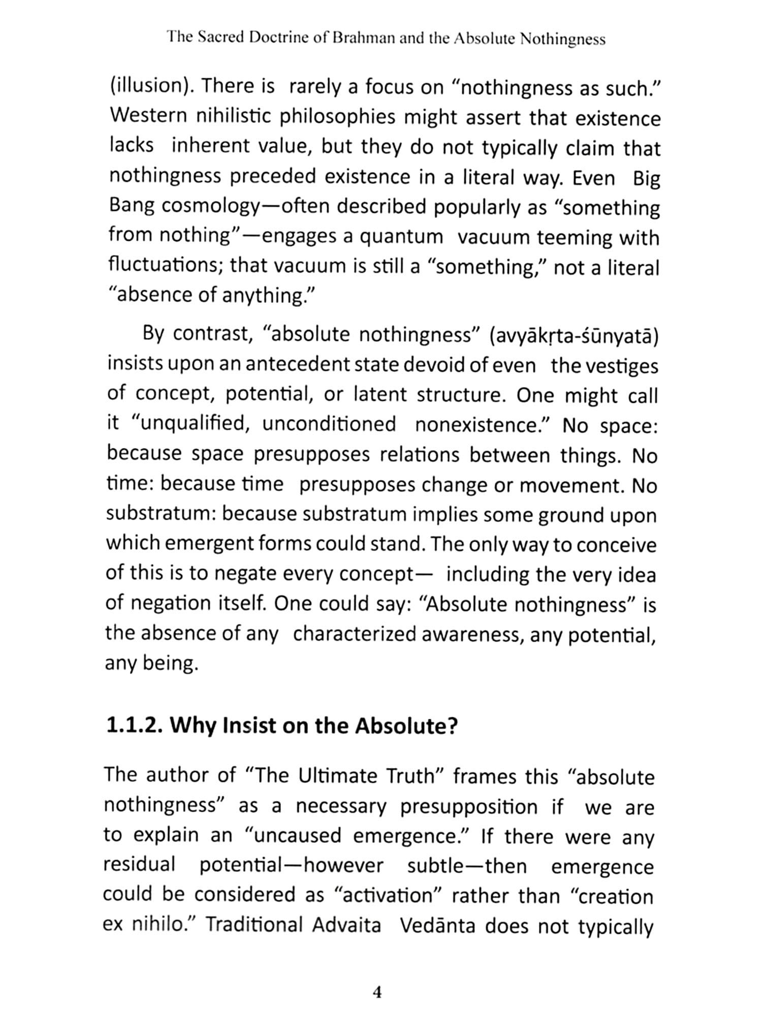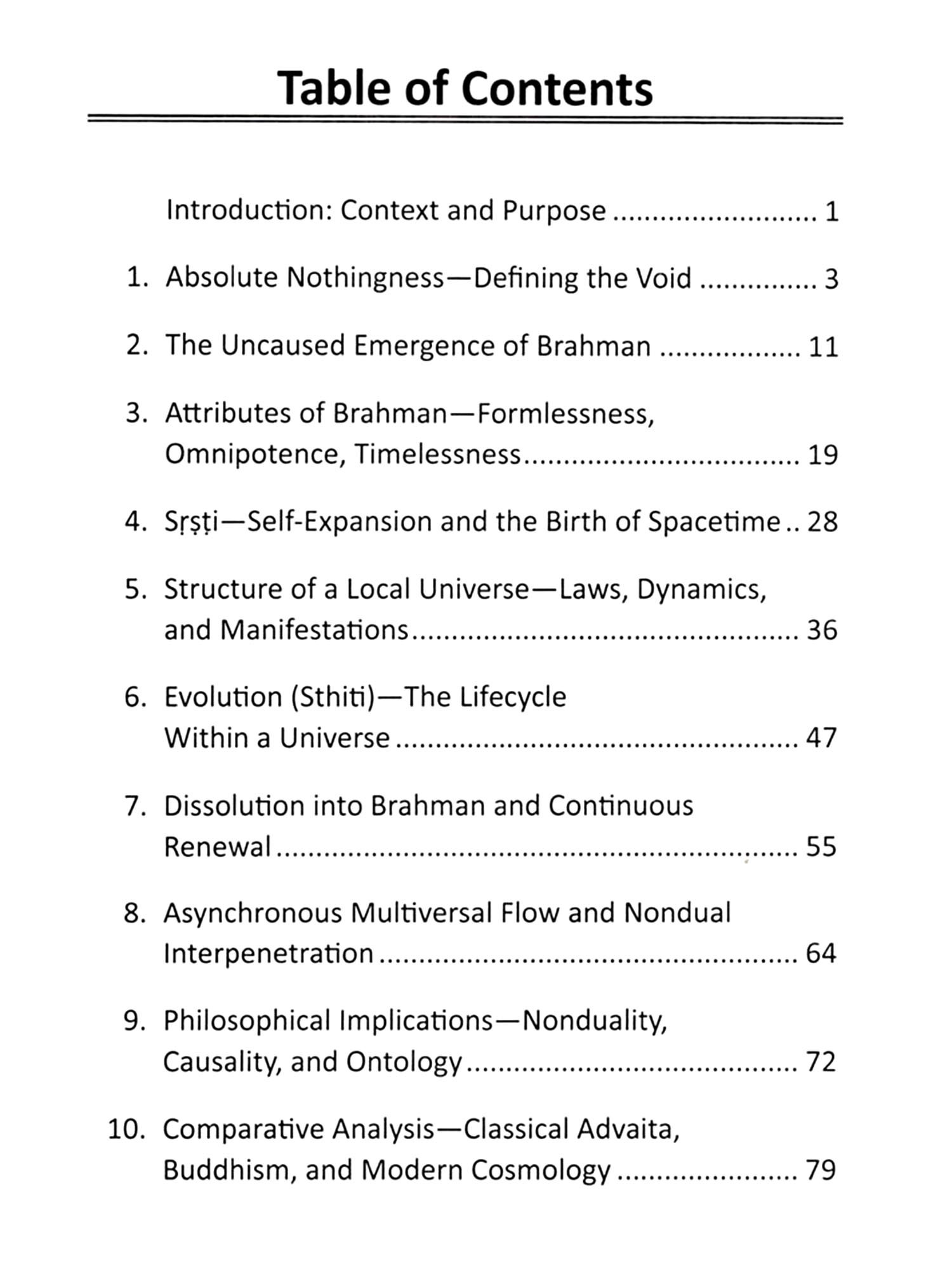 The perennial quest to understand the ground of existence has inspired countless philosophical, theological, and scientific systems throughout human history. Among these, the Advaita Vedānta tradition stands out for its uncompromising insistence on nondual reality-Brahman as the one eternal essence, beyond all dualities of subject-object, time-space, and causality. Yet, while classical Advaita tends to treat Brahman as ever-present and changeless, certain contemporary thinkers have proposed a more dynamic portrayal, one in which Brahman's "self-activity" unfolds into creation, sustenance, and dissolution of multiple local universes in an endless, non-final cycle. This book aims to explore, in depth, a metaphysical system that begins with "absolute nothingness," posits an "uncaused emergence" of Brahman, and describes a multiverse of local universes that arise, evolve, dissolve into Brahman, and re-emerge in seamless continuity. It builds on the 2025 paper "The Ultimate Truth: A New Understanding of Advaita Vedanta," which supplies the foundational axioms and definitions. In doing so, we will: Clarify foundational concepts-absolute nothingness, Brahman, srşți, sthiti, pralaya. Elucidate the structure and dynamics of each local universe as a self-contained spatiotemporal bubble within Brahman's undivided reality. Examine the continuous, non-final cycle of emergence, evolution, and dissolution back into Brahman. Investigate philosophical implications-on nonduality, causality, the nature of time and space, and the status of individual selves. Compare this model with classical Advaita Vedānta, Mahāyāna Buddhist perspectives, and modern cosmological theories (e.g., cyclic models in physics). Address the role of consciousness and liberation (mokşa) when all "events" are simply facets of Brahman's "eventing." Offer practical reflections on how this view informs meditation, ethics, and daily life, fostering a sense of unity and continuity. By the end of this 150-page, twelve-chapter volume, the reader should possess a comprehensive understanding of the model-its logical coherence, its affinities and departures from tradition, and its transformative potential for thought and practice.