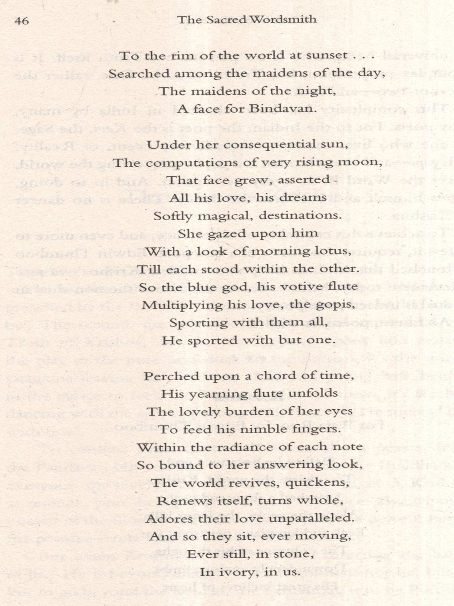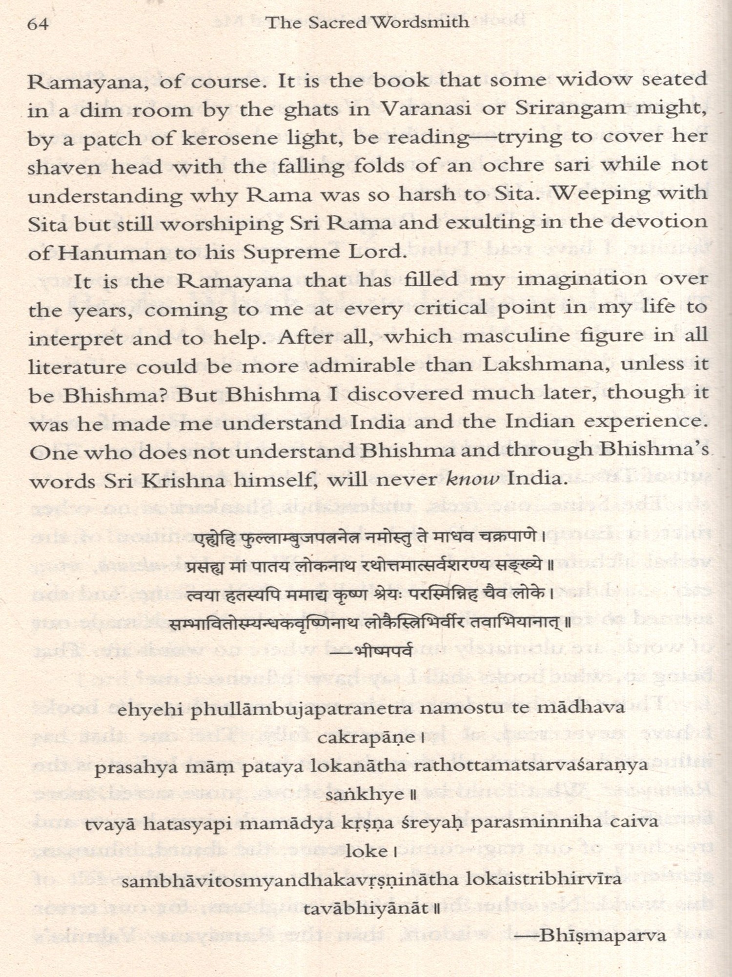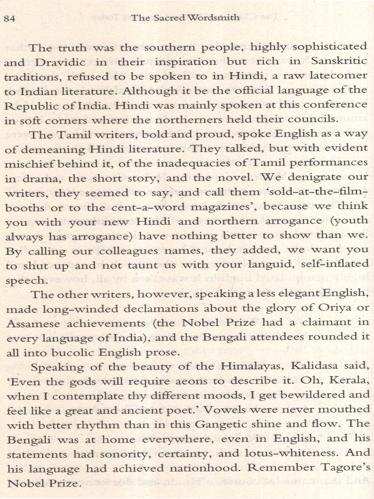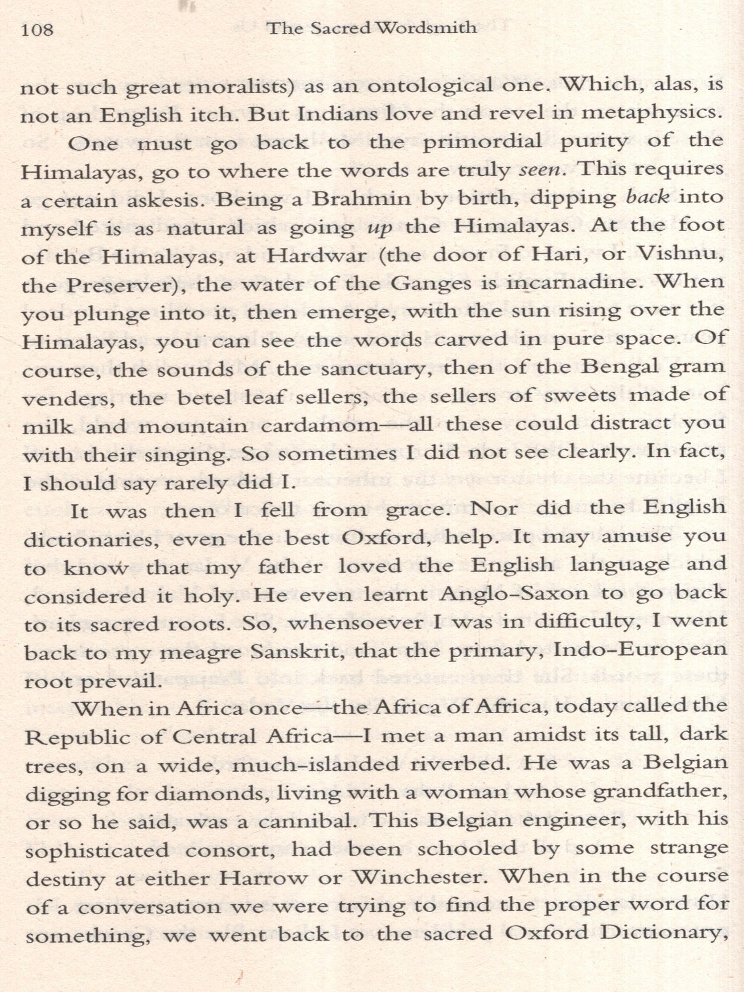 Raja so reverenced the word, he never used abbreviations or colloquialisms; he abhorred American slang. In the twenty-six years we were together, I not once heard him utter a frivolous word. He disliked creative-writing classes; indeed, was adamantly opposed to all mental manipulations of the word. He understood that the true art of writing arises, beyond the personal self, from one's inmost being. He always said, "The word is sacred, and writing is worship. When awarded the 1988 Neustadt Prize for Literature, in his acceptance speech, he stated, 'I am a man of silence. And words emerge from that silence with light. And light is sacred... The writer or poet is he who seeks back the common word to its origin of silence, that the manifested word become light.'