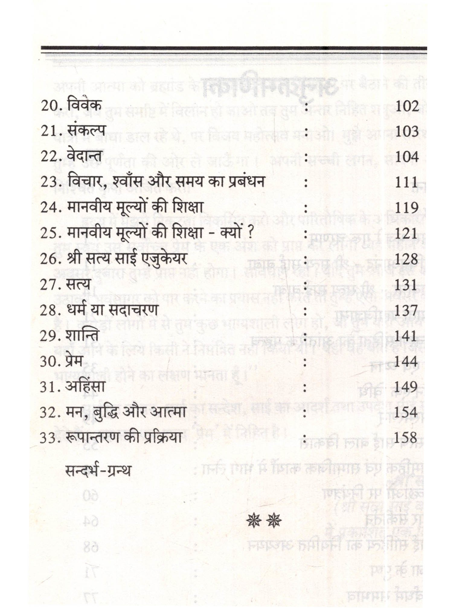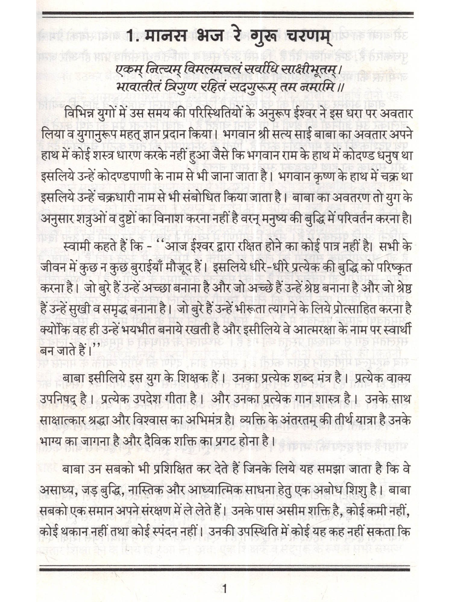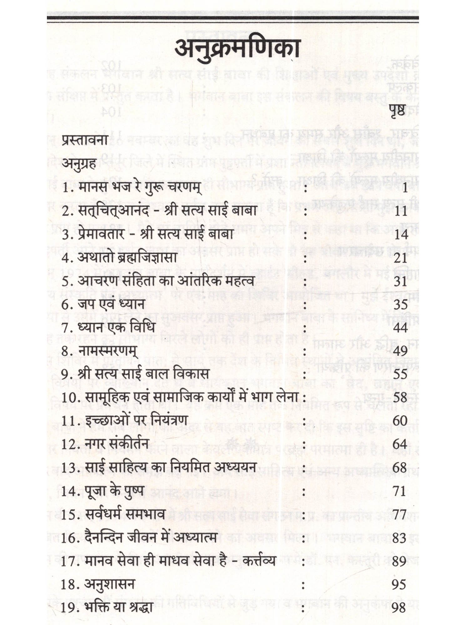 यह संकलन भगवान श्री सत्य साई बाबा की शिक्षाओं एवं मुख्य उपदेशों की रूपरेखा संक्षिप्त में प्रस्तुत करता है। भगवान बाबा इस संकलन की विषय वस्तु के केन्द्र बिन्दु हैं। सन् 1973 के 26 नवम्बर का वह शुभ दिन मेरे जीवन का सबसे शुभ दिन था, जब आन्ध्रप्रदेश के अनन्तपुर जिले में स्थित ग्राम पुट्टपर्ती में प्रशान्तिनिलयम् में मुझे भगवान श्री सत्य साई बाबा के दुर्लभ दर्शन का सहज ही सौभाग्य प्राप्त हुआ। आज जब इतने वर्षों बाद मैं विचार करता हूँ तो अब विश्वास पूर्वक कह सकता हूँ कि प्रथम दर्शन में ही मुझे उनका अनुग्रह प्राप्त हो गया था। मैने घर वापिस होते समय अपने मित्र से कहा था कि अगर हमें पुनः पुट्टपर्ती आने एवं दर्शन लाभ का अवसर प्राप्त हो सके तो यह जीवन सार्थक होगा। सन् 1974 में भगवान बाबा के मार्गदर्शन में व्हाईट फील्ड, बंगलौर में मई माह में 'भारतीय संस्कृति एवं अध्यात्म' पर एक माह का शिविर आयोजित था। मुझे ईश्वर की अनुकम्पा से उसमें भाग लेने का सुअवसर प्राप्त हुआ। भगवान बाबा के सानिध्य में निरन्तर एक माह तक रहने का सौभाग्य बिरले लोगों को ही प्राप्त होता है। इस शिविर में प्रतिदिन प्रातः से सायं तक देश के विभिन्न स्थानों से आमंत्रित विद्वान विभिन्न विषयों पर व्याख्यान देते थे व सायंकाल भगवान बाबा का 'वेद, ब्रह्मन् एवं भारत' विषय पर प्रवचन होता था। यह क्रम एक माह तक नियमित रूप से चलता रहा। भगवान बाबा ने हम सब लोगों को अंदर से यह बात स्पष्ट कर दी कि इस सृष्टि का कर्त्ता, पालनहार नियंता व नियमन करने वाला केवल एकमात्र परब्रह्म परमात्मा ही है। वहाँ से आने के बाद अध्यात्म की समझ बढ़ गई। अब साई साहित्य एवं अन्य अध्यात्मिक ग्रंथों के पठन, चिंतन और मनन में आनंद आने लगा। इस बीच सन् 1974 में इन्दौर में श्री सत्य साई सेवा संगठन म.प्र. का प्रान्तीय अधिवेशन आयोजित किया गया। उसमें भी भाग लेने का अवसर मिला। भगवान बाबा ने इस सम्मेलन की सफलता के लिये आशीर्वाद एवं अनुग्रह के रूप में डॉ. एन. कस्तूरी को भेजा था। इसके पश्चात् मैं संगठन की गतिविधियों से जुड़ गया व भगवान की अनुकंपा से यह क्रम बना हुआ है। इस संगठन की गतिविधियों को हम तीन भागों में विभक्त कर सकते हैं। पहला अध्यात्मिक, दूसरी सेवा सम्बन्धी एवं तीसरी शैक्षणिक जिसमें बाल विकास का कार्यक्रम एवं मानवीय मूल्यों की शिक्षा सम्मिलित हैं। संगठन की गतिविधियों में भाग लेने के कारण मुझे अनेक बार प्रशान्तिनिलयम् जाने का तथा वहाँ पर आयोजित सम्मेलनों एवं प्रशिक्षण शिविरों में भाग लेने का अवसर मिलता रहा। वहाँ पर संगठन से संबंधित सभी गतिविधियों एवं विषयों पर विस्तृत चर्चा एवं विचारों के आदान-प्रदान का अवसर व लाभ मिलता था। अतः इस संकलन में जो विषय वस्तु सारांश में प्रस्त