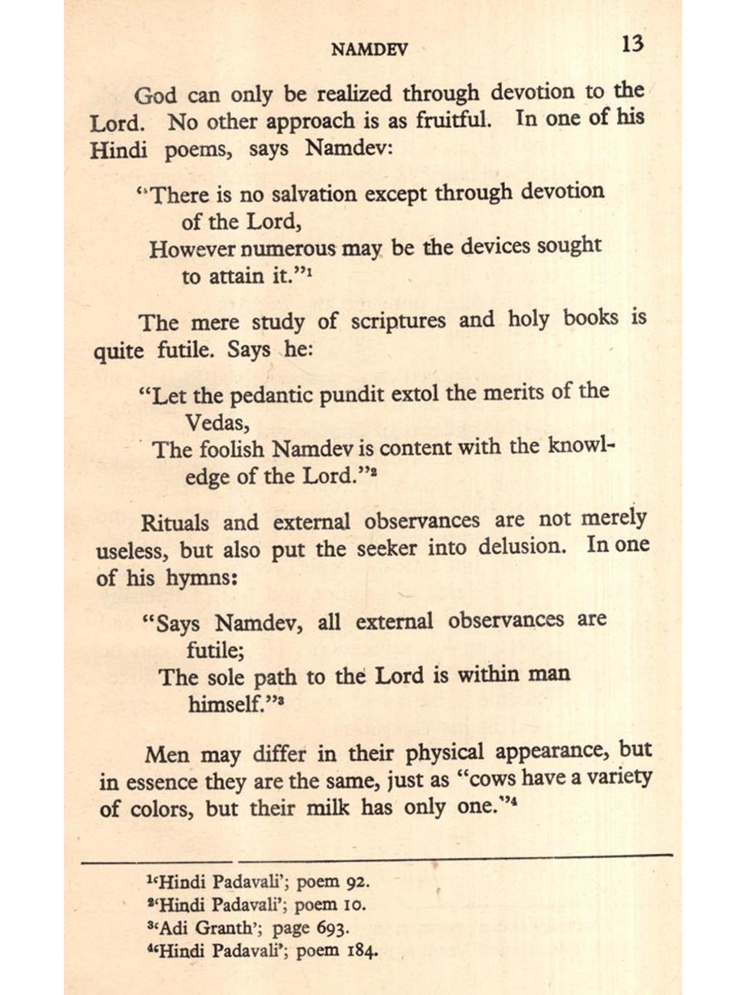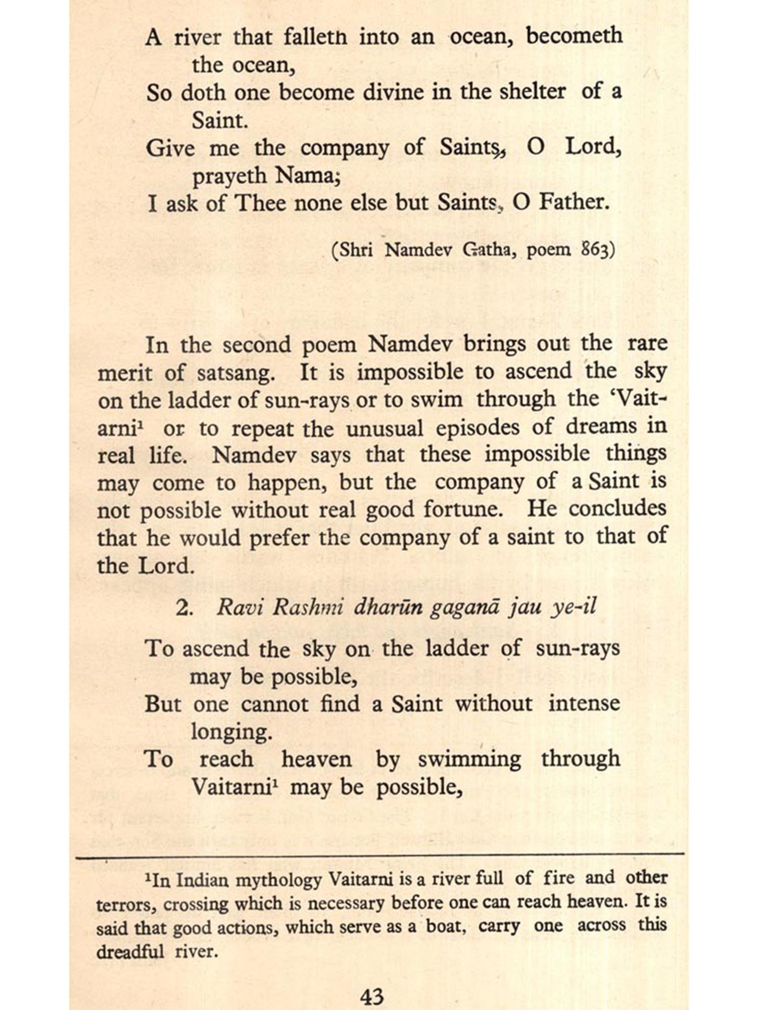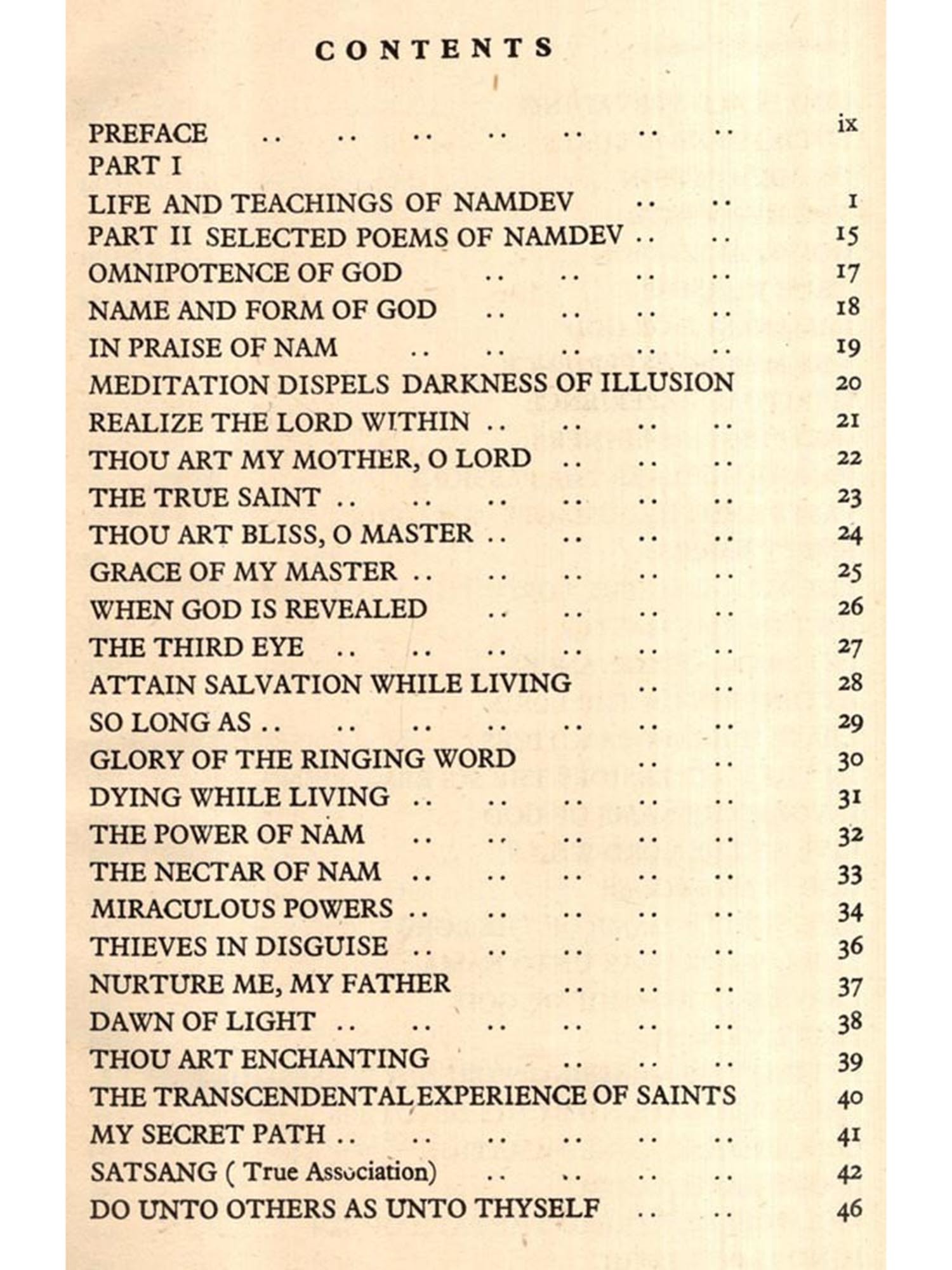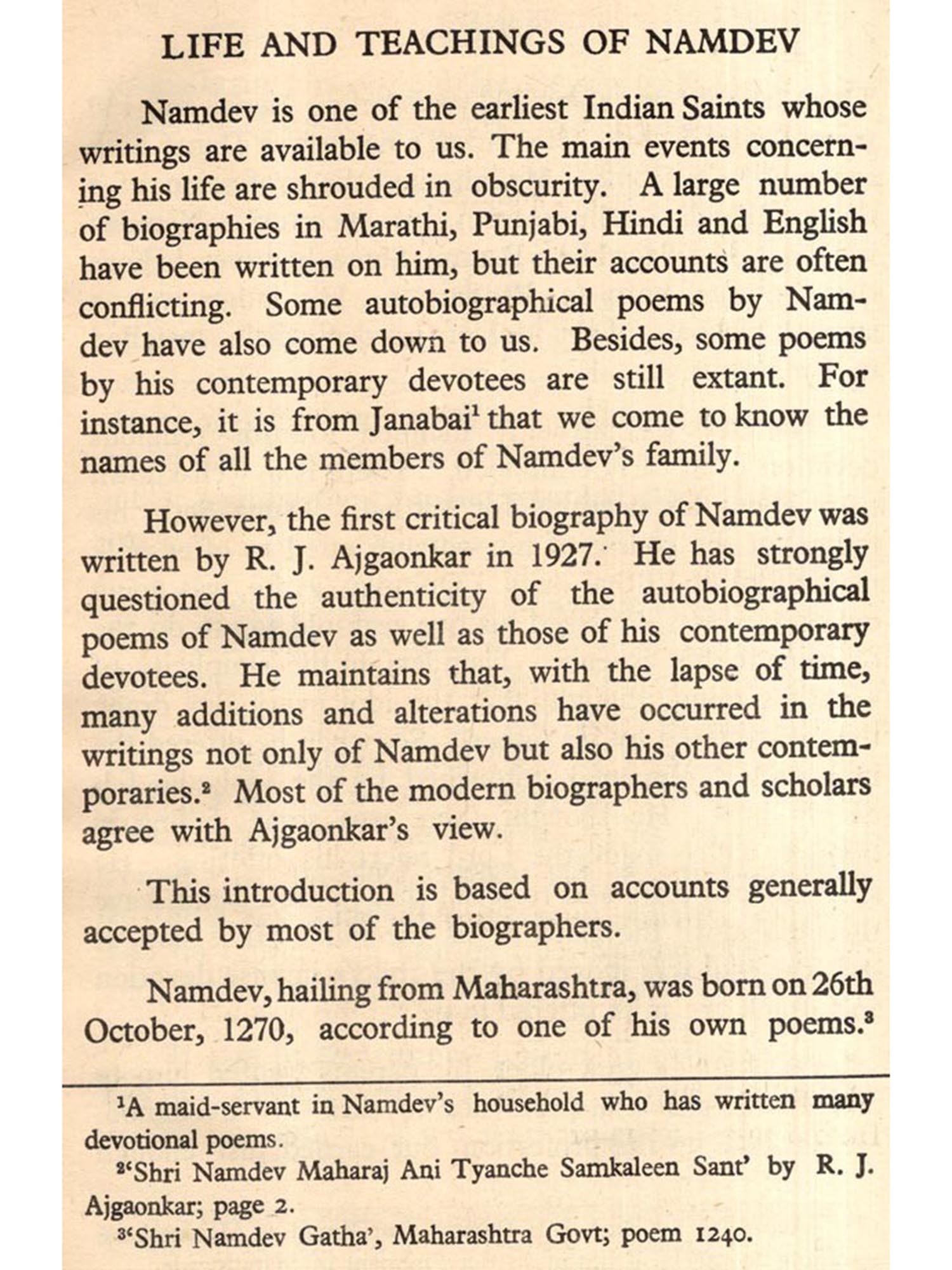 The present monograph on Saint Namdev includes his poems from 'Shri Namdev Gatha", 'Adi Granth' and 'Sant Namdev Ki Hindi Padavali. From the Adi Granth 37 poems out of the total number of 61, from Shri Namdev Gatha 28 out of 2337 and from Hindi Padavali 26 out of 231, have been included in the present selection.