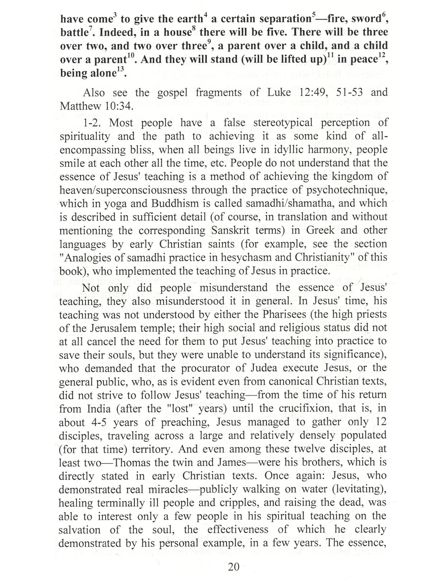 IN Many meditators wonder why there are currently no teachings of Jesus on samadhi/shamatha meditation in Christian texts. This meditation practice is the essence of the teachings of Patanjali and Buddha and allows one to achieve superconsciousness as a result of its many hours of daily, many-year practice. This seems especially strange given that in the texts that have come down to us with the words of Jesus both in the canonical and in the apocrypha-the superconsciousness itself is mentioned, albeit allegorically (like the kingdom of heaven in Thomas or the kingdom of God in other apostles), but the description of the practice of samadhi/shamatha is almost completely absent. A detailed study of the description of the properties of the kingdom of heaven, the primary importance of achieving which Jesus spoke about again and again, allows us to come to the conclusion that it is the very superconsciousness that was designated in words understandable to Jesus' disciples. Buddha also spoke again and again about the primary importance of achieving superconsciousness, which in modern Buddhism in different contexts and for different levels of its achievement can be designated by the terms "consciousness of buddha (enlightened one)", "awakened consciousness", "having reached the levels of jhana/dhyana and especially arupa-ayatana", "nirvana", "sambhogakaya" and even "pure lands" of heavenly worlds. A side effect of achieving superconsciousness is the emergence of superpowers-siddhis, allowing one to do what people call miracles. Both Jesus and Buddha performed many miracles. Both Christianity and Buddhism have preserved numerous references to these miracles. According to the Tipitaka, in 45 years after achieving superconsciousness ("consciousness of buddha"), Buddha performed 3,500 miracles. But if Buddhism has preserved a detailed description of the path to achieving superconsciousness, the key method of which is many-year daily many-hour practice of correct shamatha, then for some reason such a description is absent in Christianity. Just as the New Testament texts completely lack a description of the period of Jesus' life from 14 to 28 years. According to apocryphal sources, which the official church never recognized as authoritative, during these "lost years" Jesus traveled to India, where he studied yoga and Buddhism, after which he returned to Judea capable of performing all sorts of miracles. But all information about this journey, as well as the quite possible words of Jesus in sermons about the direct method of achieving the kingdom of heaven, were either thrown out or distorted by church hierarchs. If we turn to the history of Christianity, then all the original texts with the words of Jesus, recorded by his disciples and followers, remained in the shadow of the then dominant religions and cults for the first three centuries. Both the early Christians and their texts were persecuted and destroyed. And over the next three centuries, when Christianity gradually became the state religion and spread to new territories, all the texts of Jesus' teachings that were available at that time, preserved with varying degrees of reliability after multiple centuries of rewriting, were subjected to strict selection, censorship and editing by the bishops. As a result of all these events, some texts disappeared forever, such as the hypothetical source Q, which will be discussed later. There is no point in looking for references to the samadhi/shamatha psychotechnique in Christian texts recognized as canonical by the bishops. The last remnants of such references, if they were originally in the records made by Jesus' disciples, were removed no later than the 6th century. The bishops had other interests, connected, as the history of the papacy showed, with the unrestrained accumulation of wealth and the unlimited strengthening of their secular power, when, for example, the papacy became a supranational entity with its powerful influence not only on ordinary people, but even on kings. In the conditions of such a struggle, the bishops, of course, had no time for spiritual practices, the results of which, moreover, did not compare with the opportunities for enrichment that religious power provided.