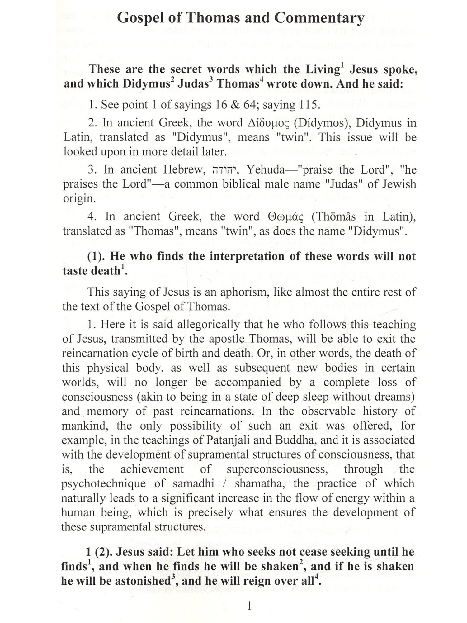 This is perhaps the first commentary on the Gospel of Thomas presented in the context of the practice of samadhi/shamatha meditation. It explores the idea that Jesus spent his "lost years" from the age of 14 to 28 in India, where he studied the Yoga of Patanjali and the Noble Eightfold Path of Buddhism, both of which culminate in samadhi meditation. In both Yoga and Buddhism, the ability to perform miracles is said to arise only as a result of attaining superconsciousness or Buddhahood through the practice of samadhi/shamatha. Jesus demonstrated miraculous powers, yet references to meditation practice were later removed from his teachings. The analysis suggests that Jesus, speaking through parables. explained to his disciples the methodology of samadhi/shamatha practice, including ekagrata (one-pointedness) and its guardian efforts smriti and samprajnata, as well as distractions and weakening of collectedness of the mind, and the concept of reincarnation. Stone cross carved by St. Thomas, found in 1547 and installed in 1551 in St. Thomas Church, St. Thomas Mount, Chennai, India. The inscription around the cross, made in Nagari Palidu language, means "Through cross-suffering the Messiah-Jesus Chris brought salvation to the world".