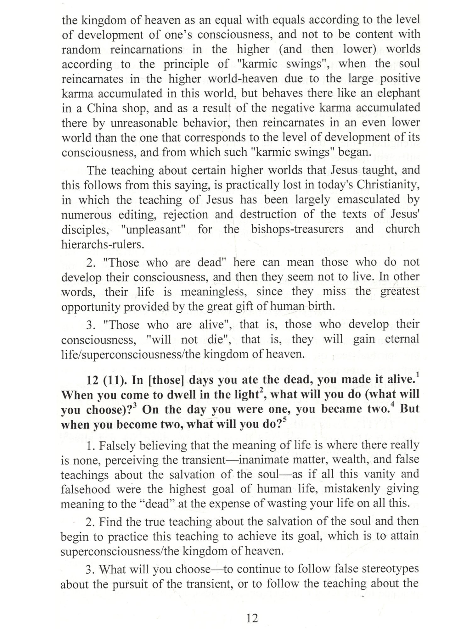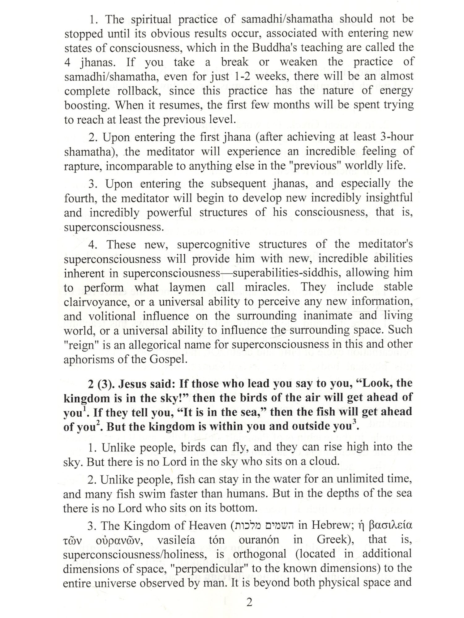 IN Many meditators wonder why there are currently no teachings of Jesus on samadhi/shamatha meditation in Christian texts. This meditation practice is the essence of the teachings of Patanjali and Buddha and allows one to achieve superconsciousness as a result of its many hours of daily, many-year practice. This seems especially strange given that in the texts that have come down to us with the words of Jesus both in the canonical and in the apocrypha-the superconsciousness itself is mentioned, albeit allegorically (like the kingdom of heaven in Thomas or the kingdom of God in other apostles), but the description of the practice of samadhi/shamatha is almost completely absent. A detailed study of the description of the properties of the kingdom of heaven, the primary importance of achieving which Jesus spoke about again and again, allows us to come to the conclusion that it is the very superconsciousness that was designated in words understandable to Jesus' disciples. Buddha also spoke again and again about the primary importance of achieving superconsciousness, which in modern Buddhism in different contexts and for different levels of its achievement can be designated by the terms "consciousness of buddha (enlightened one)", "awakened consciousness", "having reached the levels of jhana/dhyana and especially arupa-ayatana", "nirvana", "sambhogakaya" and even "pure lands" of heavenly worlds. A side effect of achieving superconsciousness is the emergence of superpowers-siddhis, allowing one to do what people call miracles. Both Jesus and Buddha performed many miracles. Both Christianity and Buddhism have preserved numerous references to these miracles. According to the Tipitaka, in 45 years after achieving superconsciousness ("consciousness of buddha"), Buddha performed 3,500 miracles. But if Buddhism has preserved a detailed description of the path to achieving superconsciousness, the key method of which is many-year daily many-hour practice of correct shamatha, then for some reason such a description is absent in Christianity. Just as the New Testament texts completely lack a description of the period of Jesus' life from 14 to 28 years. According to apocryphal sources, which the official church never recognized as authoritative, during these "lost years" Jesus traveled to India, where he studied yoga and Buddhism, after which he returned to Judea capable of performing all sorts of miracles. But all information about this journey, as well as the quite possible words of Jesus in sermons about the direct method of achieving the kingdom of heaven, were either thrown out or distorted by church hierarchs. If we turn to the history of Christianity, then all the original texts with the words of Jesus, recorded by his disciples and followers, remained in the shadow of the then dominant religions and cults for the first three centuries. Both the early Christians and their texts were persecuted and destroyed. And over the next three centuries, when Christianity gradually became the state religion and spread to new territories, all the texts of Jesus' teachings that were available at that time, preserved with varying degrees of reliability after multiple centuries of rewriting, were subjected to strict selection, censorship and editing by the bishops. As a result of all these events, some texts disappeared forever, such as the hypothetical source Q, which will be discussed later. There is no point in looking for references to the samadhi/shamatha psychotechnique in Christian texts recognized as canonical by the bishops. The last remnants of such references, if they were originally in the records made by Jesus' disciples, were removed no later than the 6th century. The bishops had other interests, connected, as the history of the papacy showed, with the unrestrained accumulation of wealth and the unlimited strengthening of their secular power, when, for example, the papacy became a supranational entity with its powerful influence not only on ordinary people, but even on kings. In the conditions of such a struggle, the bishops, of course, had no time for spiritual practices, the results of which, moreover, did not compare with the opportunities for enrichment that religious power provided.