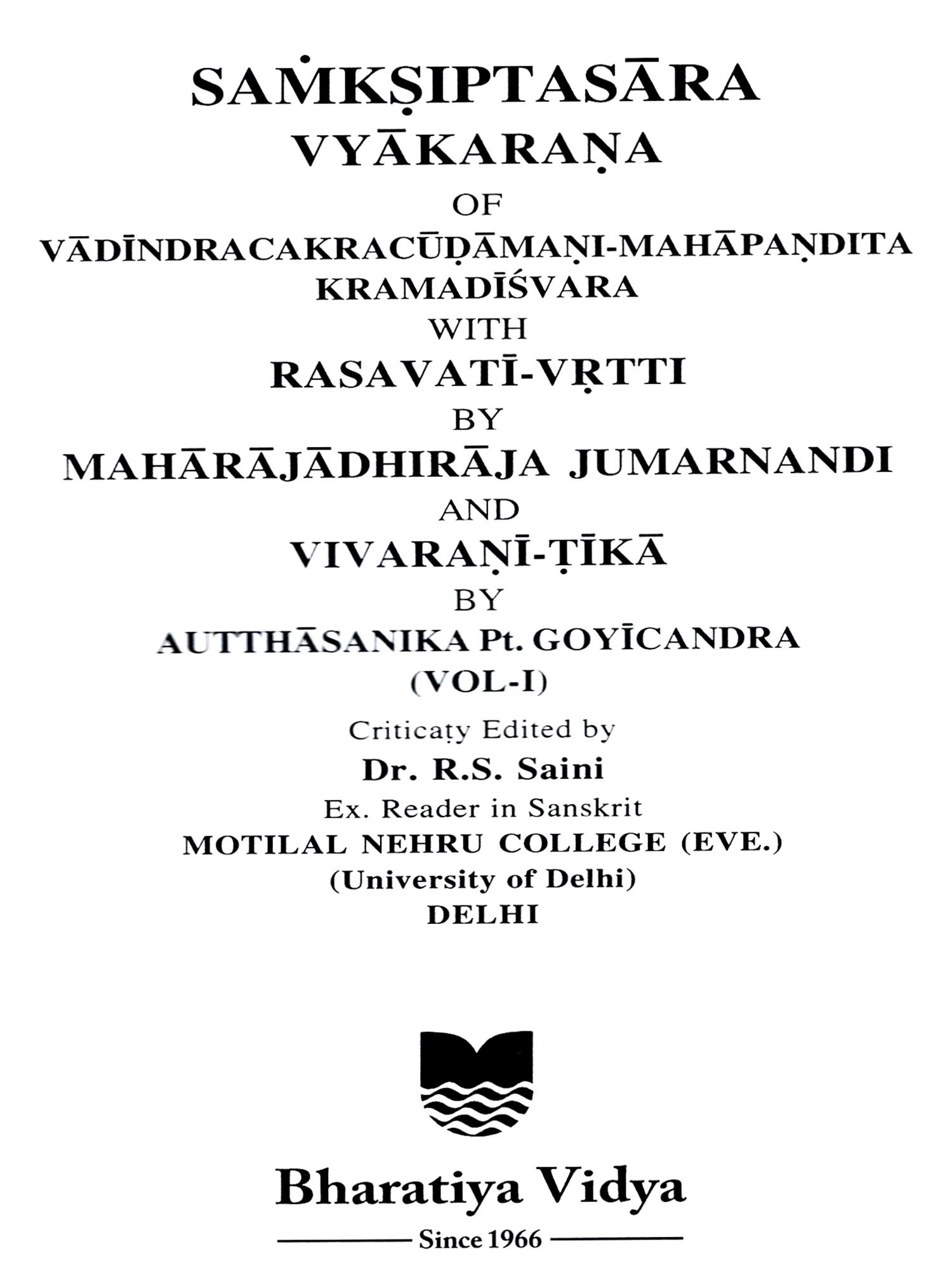 I feel pleasure in congratulating Dr. R.S. Saini who has engaged himself in preparing and editing the texts of the majors Post-Paninan systems along with the authentic commentries there on. He has brought out every good edition of Samksiptasara' Vyakarana of Kramadisvara alongwith its Rasavati-Vrtti by Jumaranandi and Vivarani Tika by Pt. Goyicandra. He has added a scholarly introduction to it. I hope the world of scholars will appreciate and encourage his endeavour so that he may continue giving many more such ware-works from his pen.