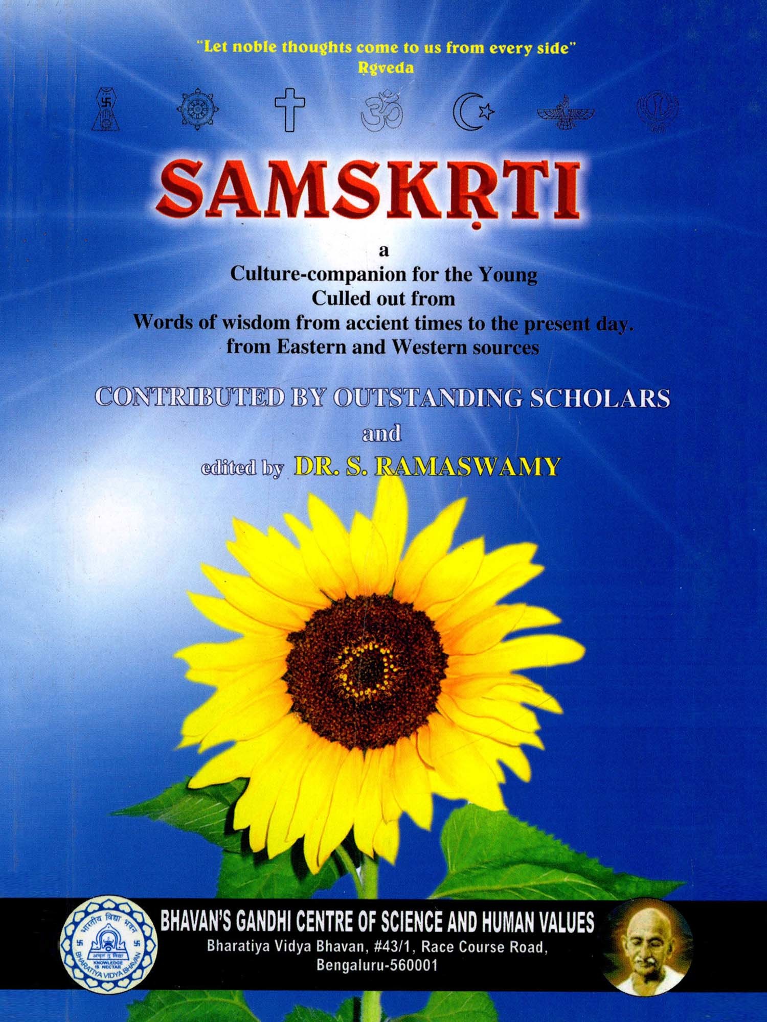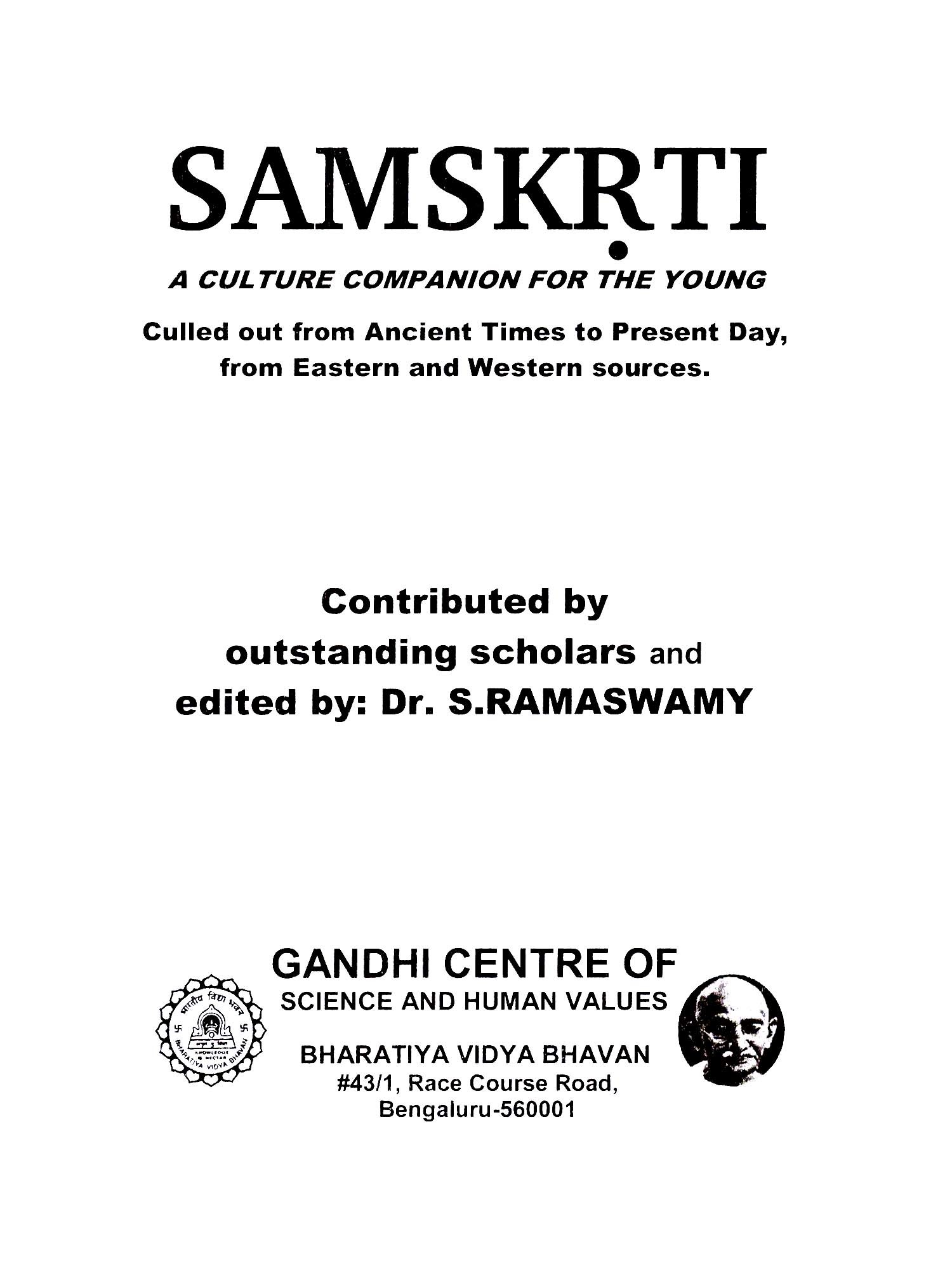 An attempt has been made here to illustrate the Motto of the Bhavan "Let thoughts come to us from every side". From this message from the times of the Rgveda to the brink of this millennium, "noble thoughts" from a wide variety of sources have been collected here by many scholars of repute in the fields of their special interests. Speaking of the "Highest Common Factor" as the essence of what is called "Perennial Philosophy", Aldous Huxley says, "More than twenty-five centuries have passed since that which has been called Perennial Philosophy was first committed to writing." In the small space of this volume an attempt has been made to present "Perennial Wisdom and Culture," culled from the both eastern and western sources from ancient times to the modern. Such being the case, some thoughts are inevitably repeated which strengthens the case for universal Human Values. There is no question of "originality" in a book like this as it contains only quotations. Necessarily, some editing has taken place and any anthology is ultimately personal. The various scholars who have contributed to SAMSKRTI have naturally chosen their own favourite quotations. In the interest of convenience some of the passages in poetry have been paraphrased into prose. SAMSKRTI means "Culture", Mathew Arnold, in his 'Culture and Anarchy" says "The great aim of culture is the aim of setting oursleves to ascertain what perfection is and to make it prevail". Culture is simply an awareness and practice of the best that has been thought and said in the world which helps in the dissemination of "Sweetness and Light." Gandhiji said, "Culture is the foundation, the primary thing. It should show in the smallest deail of your conduct and personal behaviour, how you sit, how you talk, how you walk, how you dress, etc. Inner culture must be reflected in your speech, the way in which you treat your visitors and guests and behave towards one another and your teachers and elders." It is only appropriate that Bhavan's Gandhi Centre of Science and Human Values is bringing out this volume.