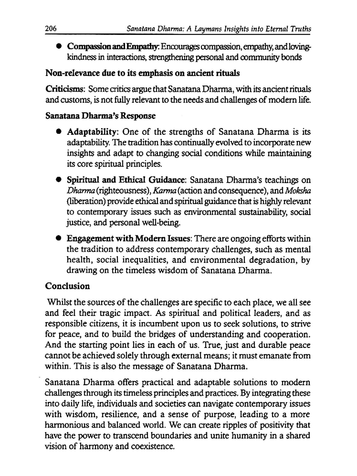 In its concluding chapter, the book addresses the contemporary relevance of Sanatana Dharma, tackling common criticisms and misconceptions. The author includes insights from a questionnaire distributed to respondents, providing a broader perspective on how this ancient tradition is perceived today.