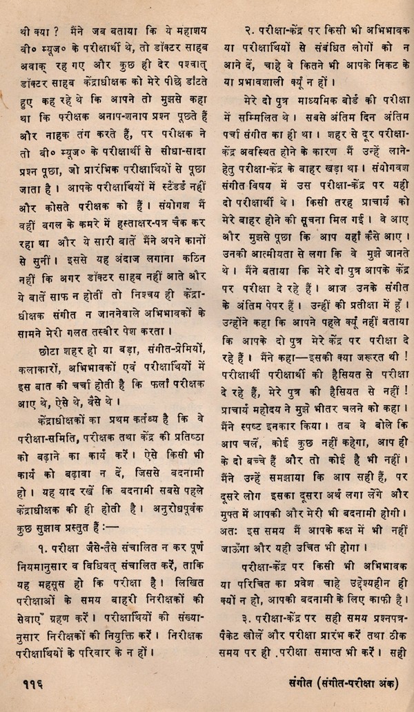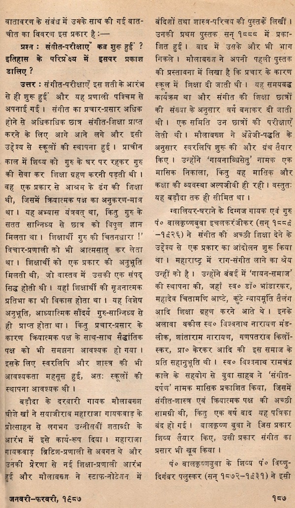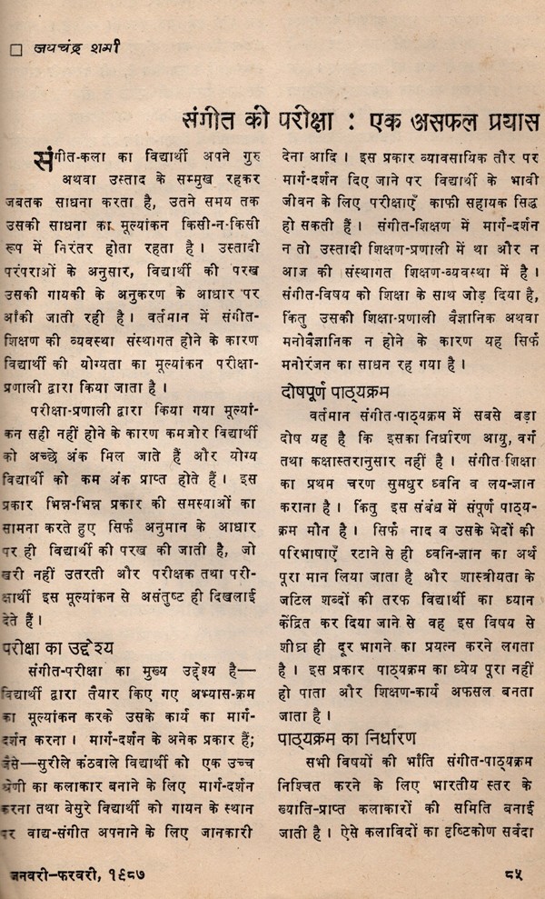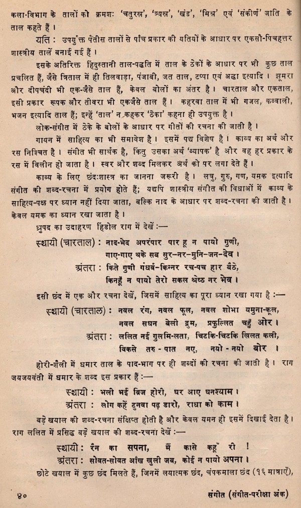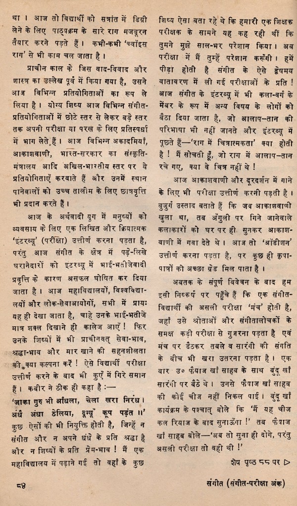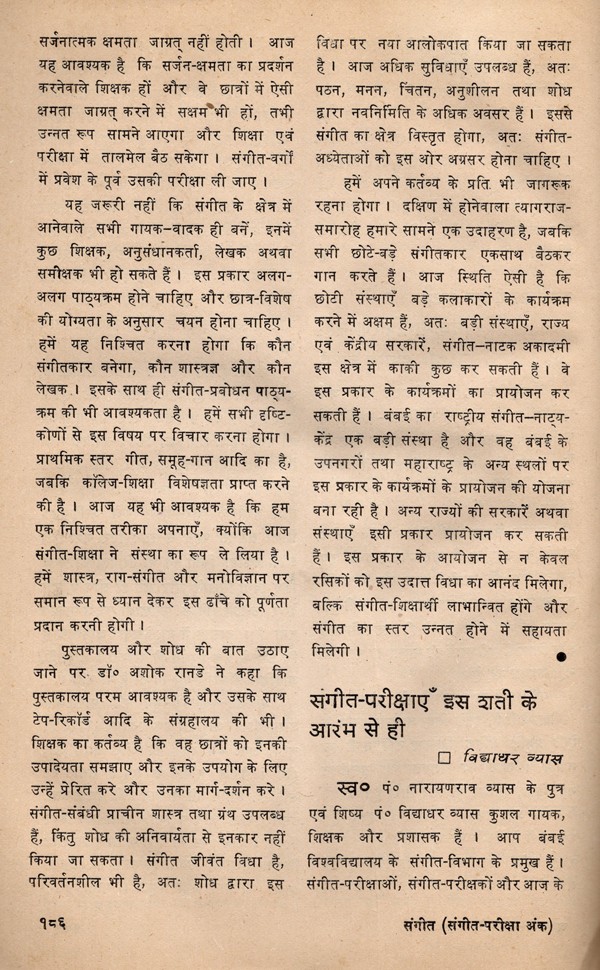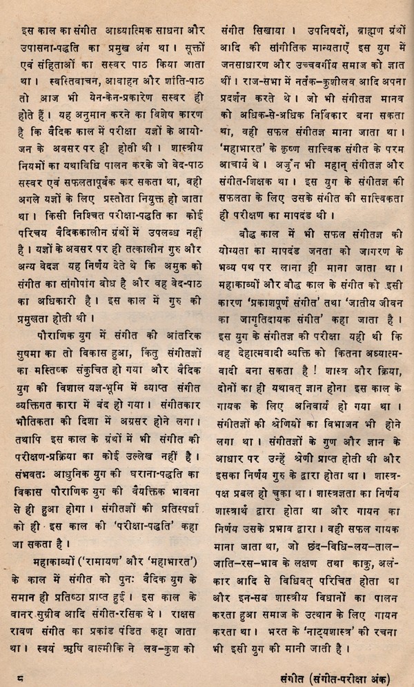 भातखंडे जी और पतुस्कर जी ने यह कभी सोचा भी न था कि संगीत के प्रति उनकी आस्या हजारों संगीत-विद्याथियों, संगीत-शिक्षकों और संगीत-संस्थाओं को जन्म देगी । पाश्चात्य संगीत में दीर्घ काल से संगीत की विभिन्न विधाओं में परीक्षाए चल रही हैं, परंतु भारतीय संगीत की परीक्षा प्रणाली का इतिहास अधिक पुराना नहीं है। संगीत को मोक्ष का साधन समझनेवाले भक्त संगीतकार समाज से अलग रहकर अपनी साधना में रत रहे और उसे मनोरंजन का साधन समझनेवाले उसमें चमत्कारों की सृष्टि करते रहे, परंतु जो न भक्त थे और न भोगी, वे भावनाप्रधान संगीत के मर्मज्ञ होकर अपने रत्तसिक्त संगीत से संसार को सुख देते रहे, जिनमें प्रायः लोक-संगीत, सुगम संगीत और फिल्म-संगीत के साधक रहे ।