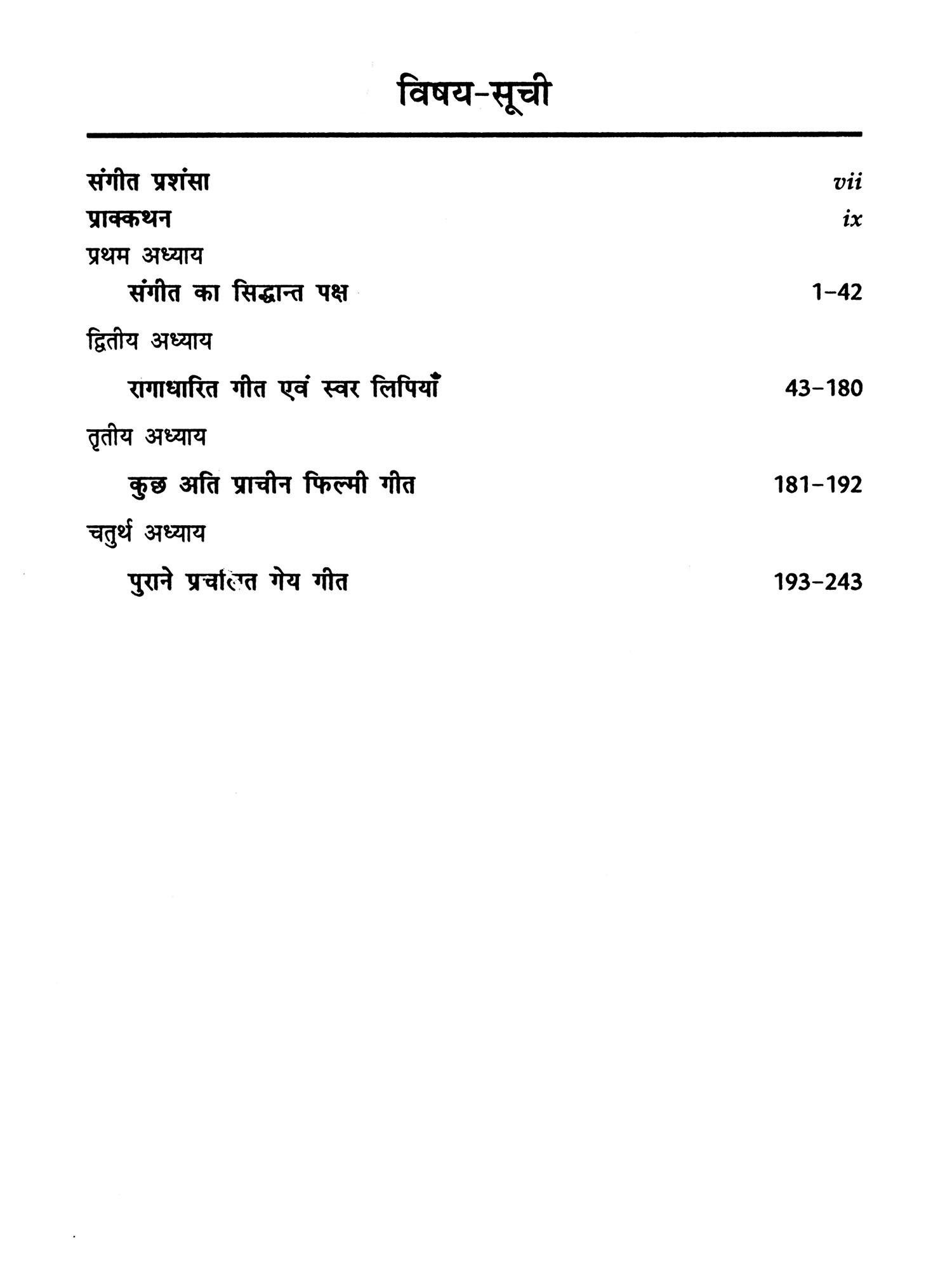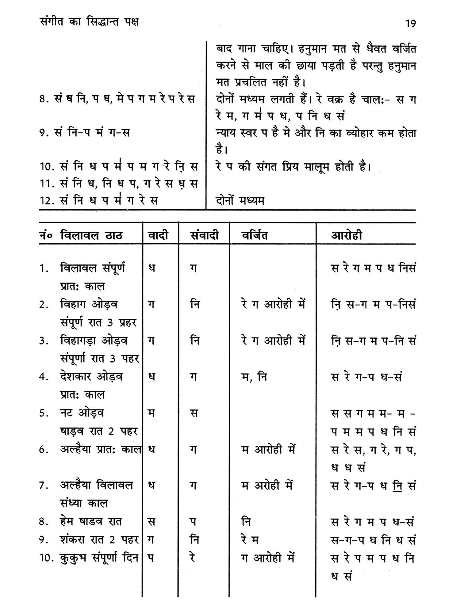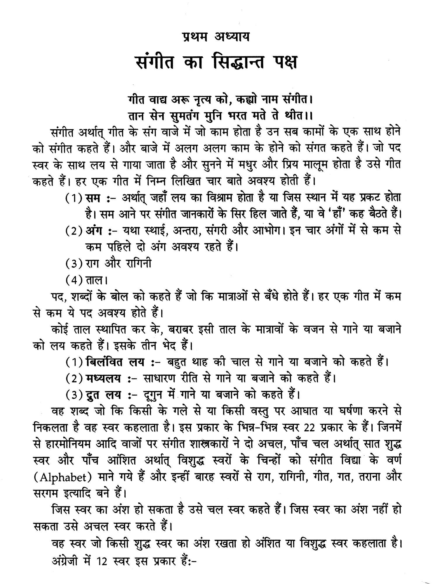 प्रथम अध्याय में पहले संगीत की महत्ता एवं प्रशंसा के विषय में कुछ प्रचलित वचन संकलित किए गये हैं। तदुपरान्त संगीत के सिद्धान्त पक्ष की विवेचना है। इसके अन्तर्गत संगीत की परिभाषा, स्वरों के विभिन्न पक्षों का विचार, ताल, विभिन्न तालों की गति और मात्रा का विचार, राग रागनियों के सम्बन्ध में विचार, सातों स्वरों को कविस्था, ताल, कूटताल, दशठाट तथा उनके आधार पर रागों का विशेष विवरण और वर्गीकरण तथा परिभाषा आदि विवेचित है।