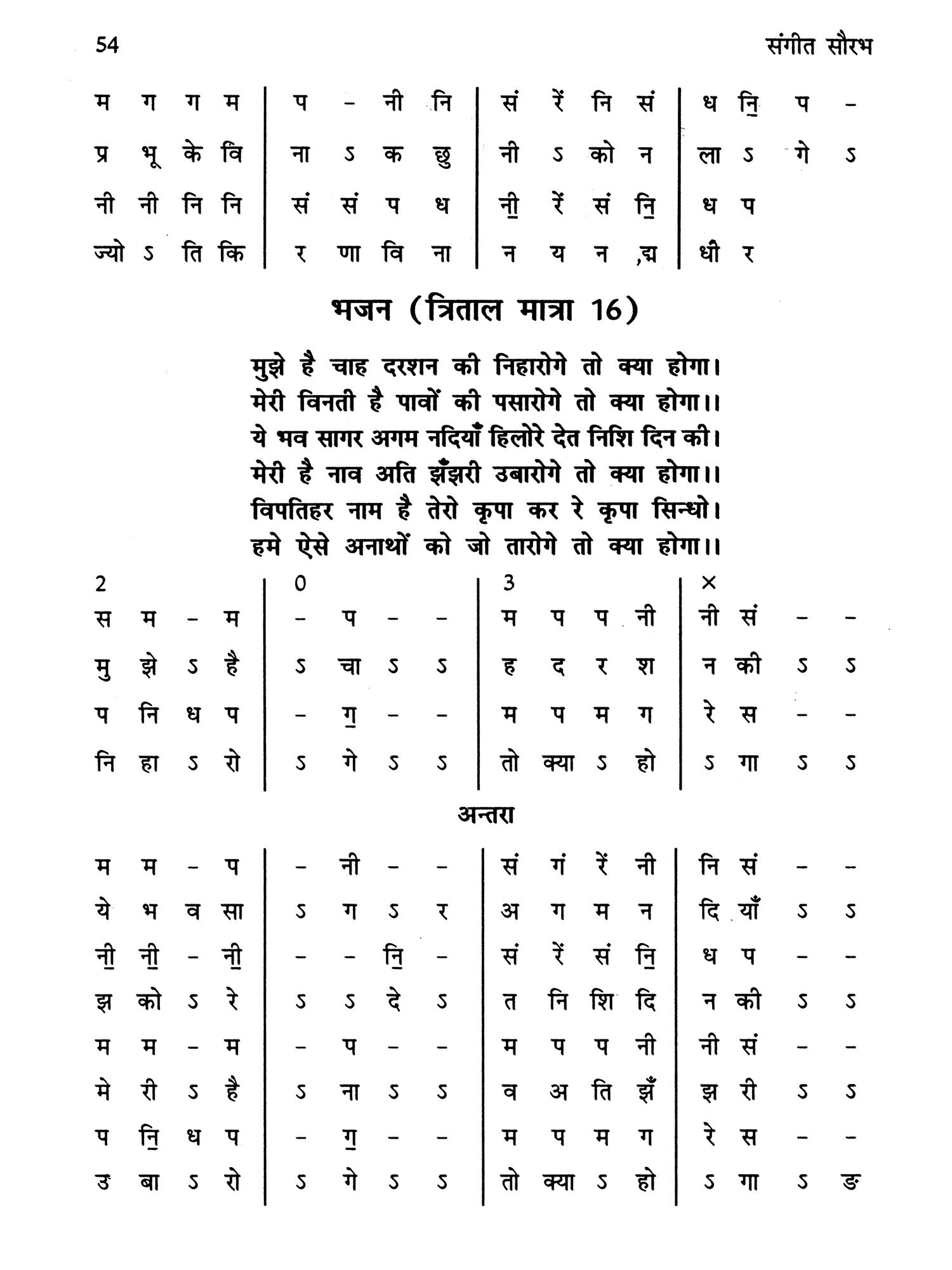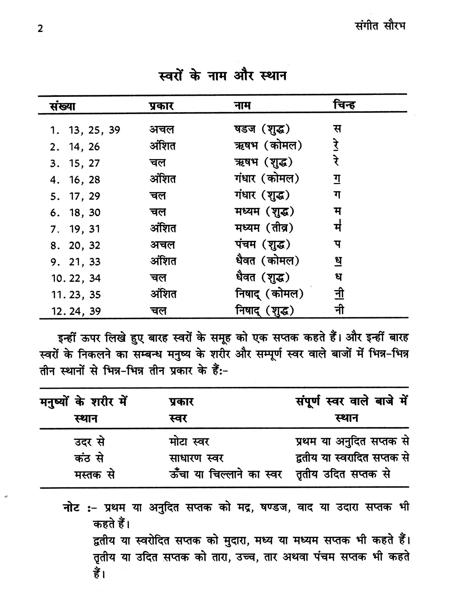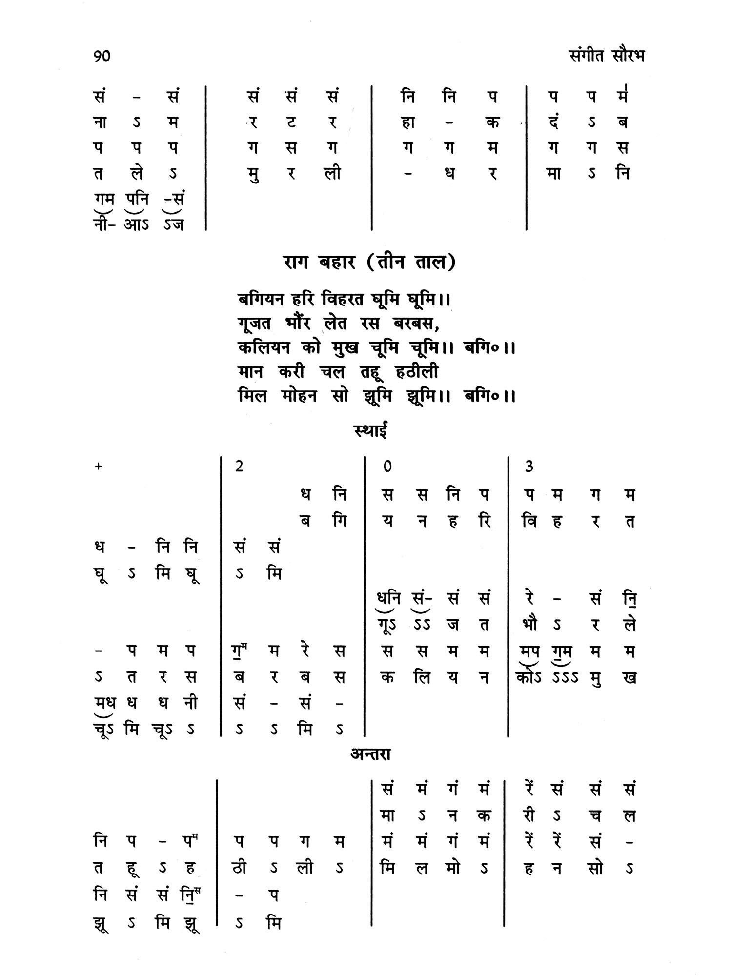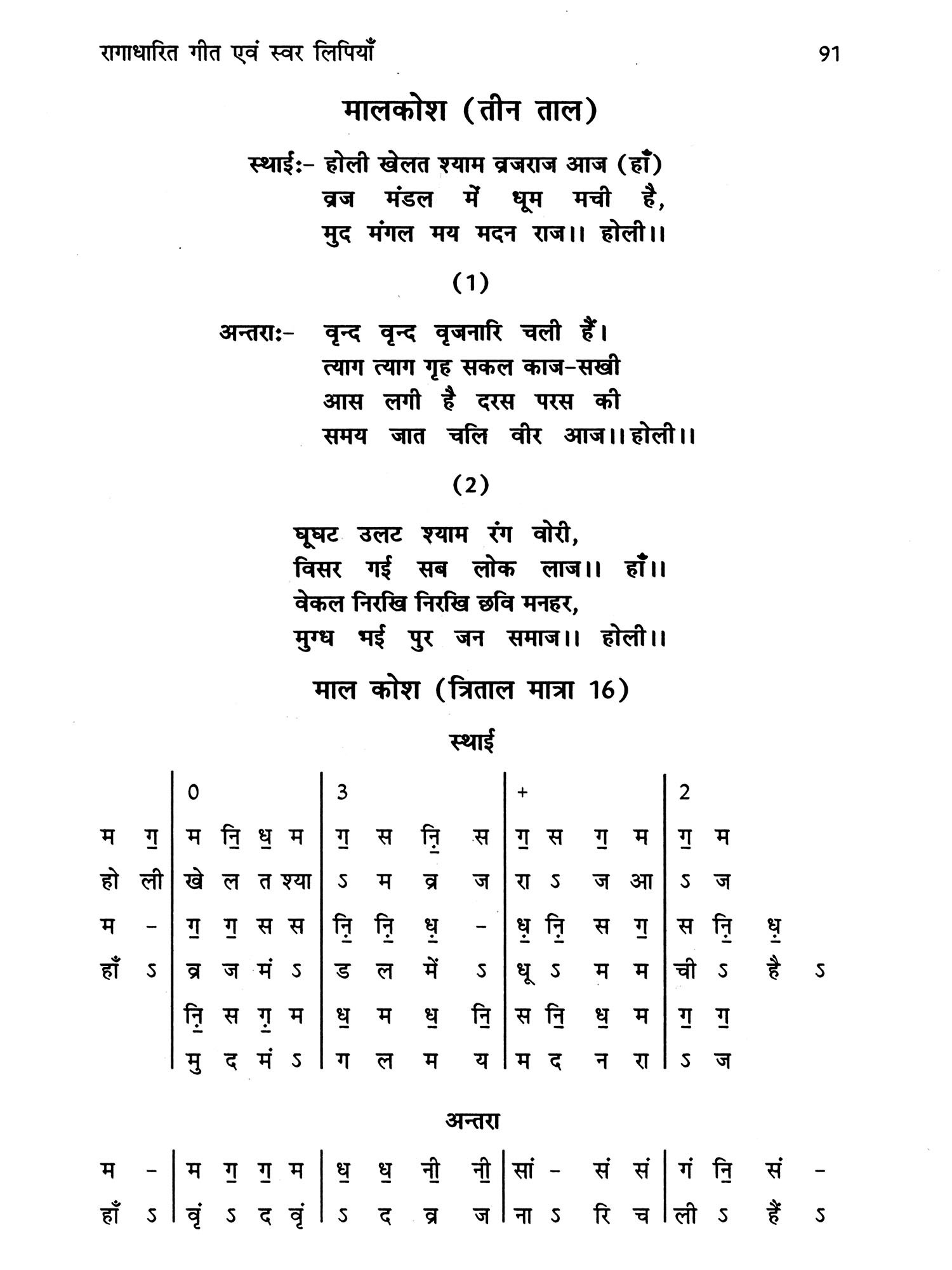 प्रथम अध्याय में पहले संगीत की महत्ता एवं प्रशंसा के विषय में कुछ प्रचलित वचन संकलित किए गये हैं। तदुपरान्त संगीत के सिद्धान्त पक्ष की विवेचना है। इसके अन्तर्गत संगीत की परिभाषा, स्वरों के विभिन्न पक्षों का विचार, ताल, विभिन्न तालों की गति और मात्रा का विचार, राग रागनियों के सम्बन्ध में विचार, सातों स्वरों को कविस्था, ताल, कूटताल, दशठाट तथा उनके आधार पर रागों का विशेष विवरण और वर्गीकरण तथा परिभाषा आदि विवेचित है।