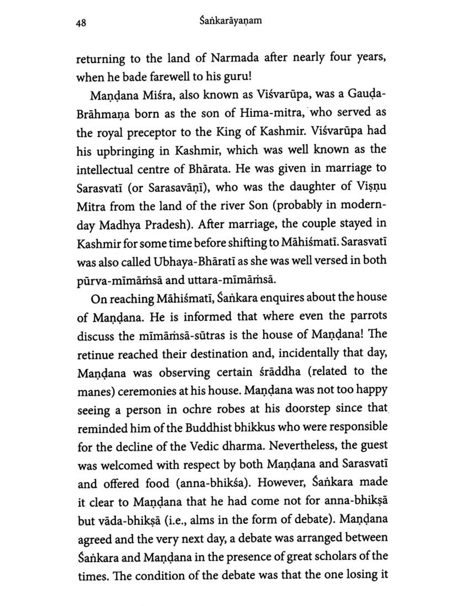 Rāmāyaņa is the journey of Rama; on the same note, Sankarayanam is the journey of Adi Sankarācārya. Sankara is one of the most prolific minds that Bharat has ever produced. Äcārya was indeed a multifaceted personality of the highest order, and there is hardly any aspect of Sanatana-dharma that he did not influence. We have several biographies that have been written, and will be written, on such a popular personality. However, what I found different and refreshing in Sankarāyaņam by Subramanian (Subbu) Chidambaran, is that he has tried to create a seamless blend of storytelling and research while presenting the journey of the Acārya. Subramanian Chidambaran, an ardent devotee of Adi Sankarācārya, has penned the journey with śraddhā and bhakti, after listening to many discourses, and digesting the content of various books and monographs. Yet, this work is backed by a strong and unbiased research, at times even questioning the narratives that are popular amongst the masses, which lends it the required credibility.