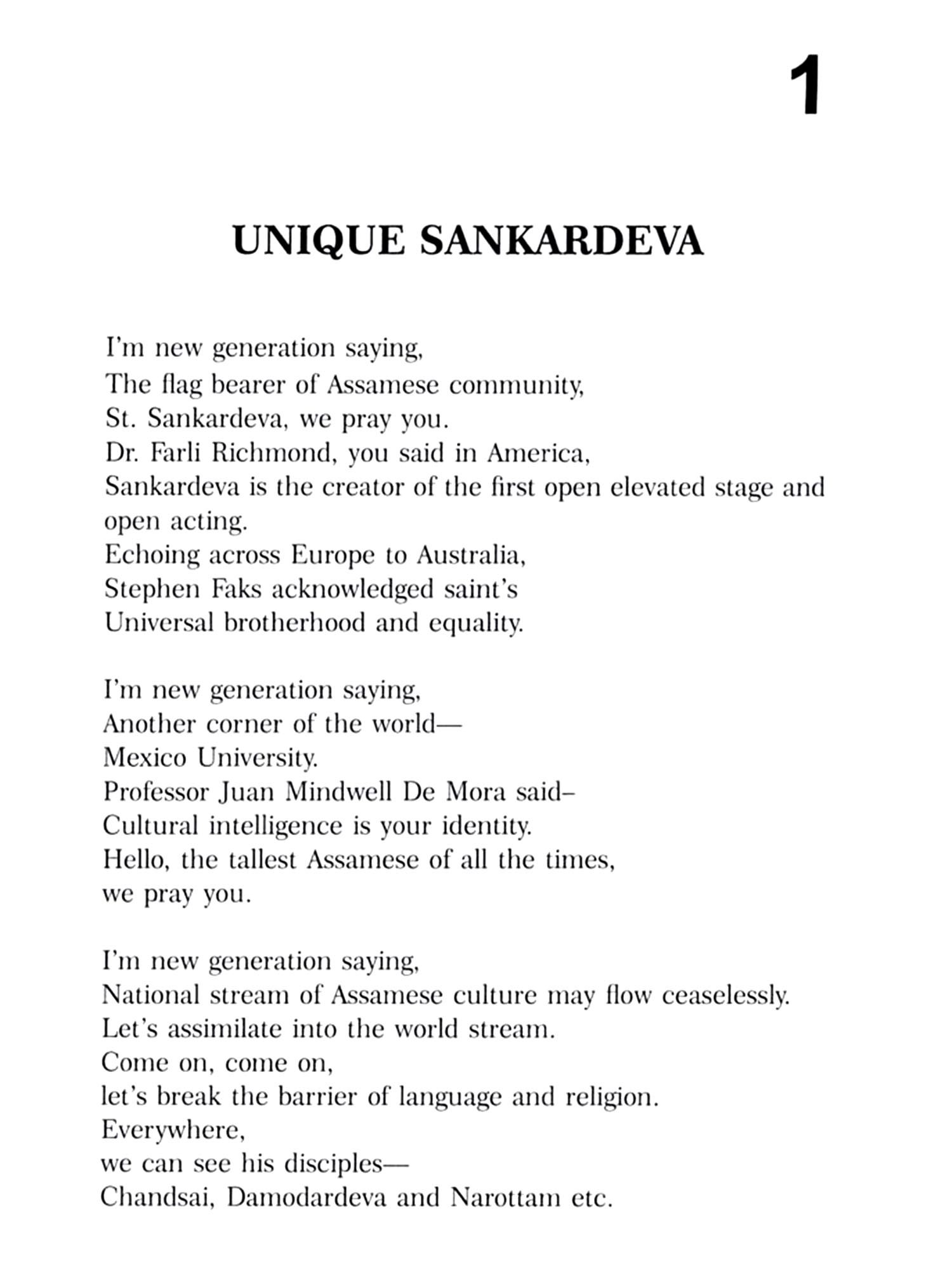A collection of articles about the philosophy, culture and history related to Sankardeva with a special focus on his activities. This is written by noted writer and bhaona artist of Assam, Arup Saikia, and published by Aayu Publications, New Delhi.