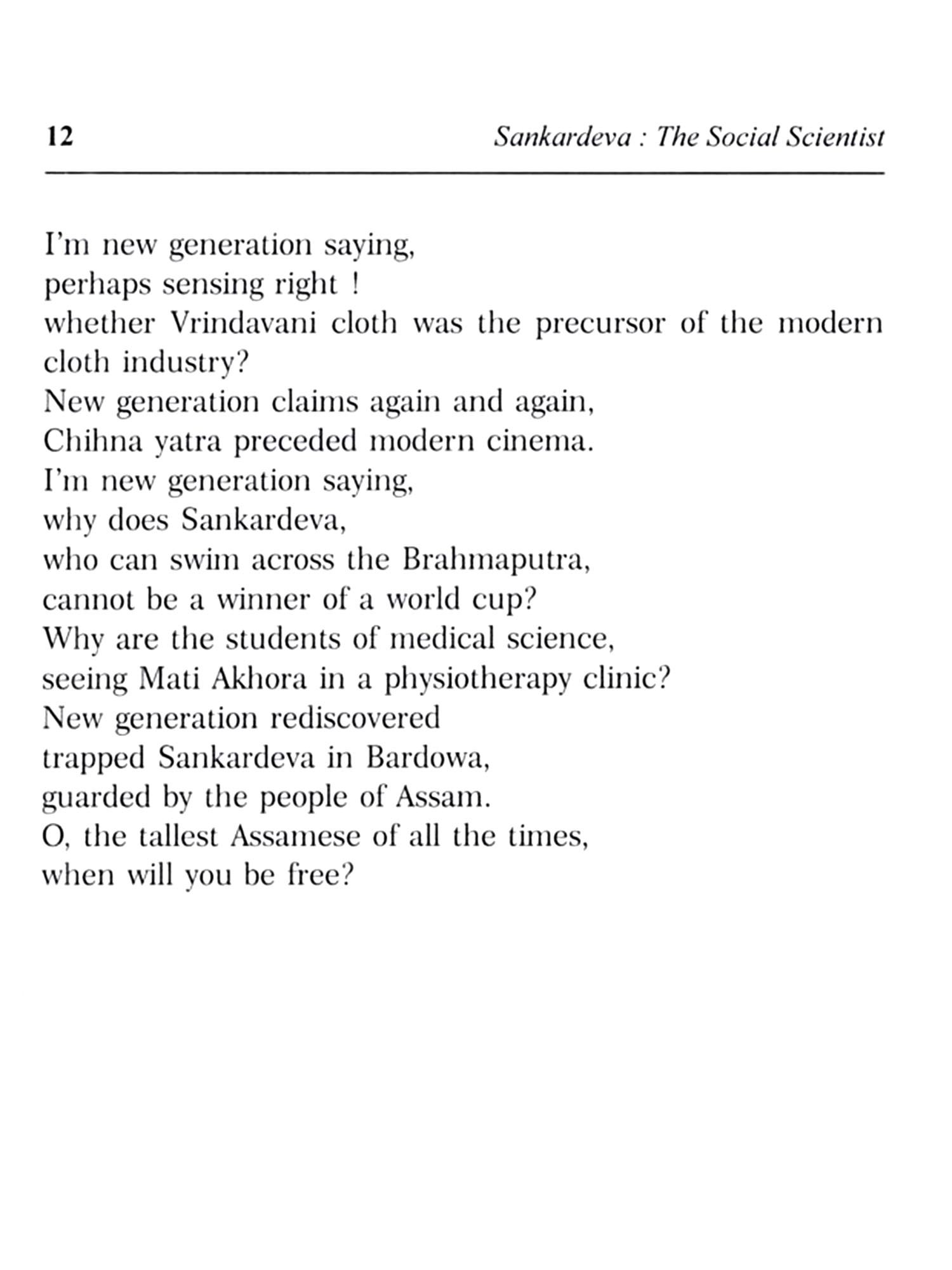 It isn't exaggerated to say that the Neo-Vaishnavite revolution Assam builds Assamese as a community. Medieval Assamese saint Sankardeva is the prime motivational character behind the movement. Majority of Assamese or Indian still unfortunately look at Sankardeva as a person of religion. The multifaceted qualities of Sankardeva are necessarily expressed above religion in the perspective of Assam. He has a Pan-Indian personality and was in charge of Assam. To initiate and gain ground for the Bhakti movement, Sankardeva had to face many adversaries. The strategic technique, socio-political manoeuvre he applied in multi-ethnic/lingual/religious Assam is the main theme of the book. The deep religious outlook is overlooked here. The religion was just an effective weapon or means to an end for him.