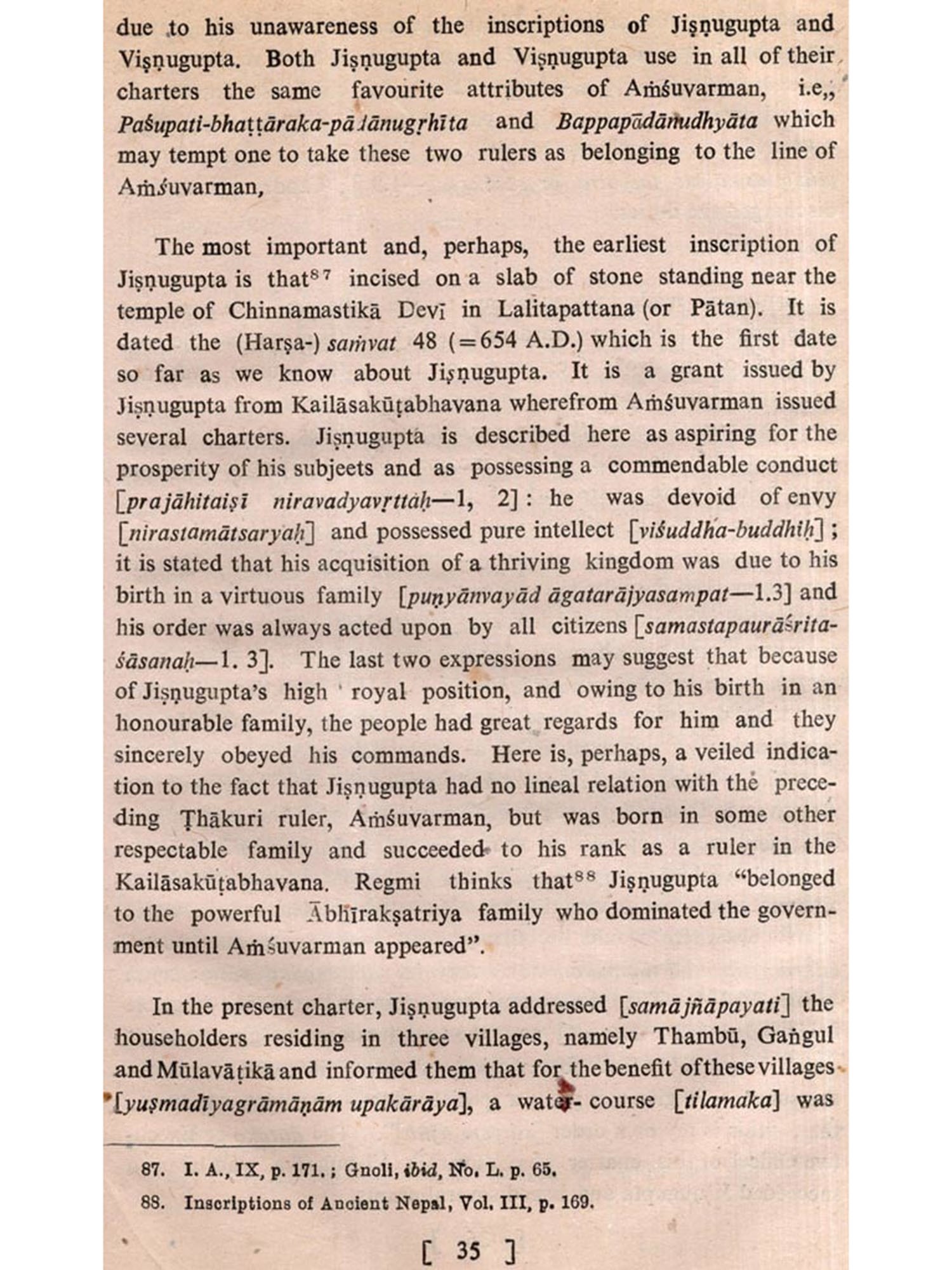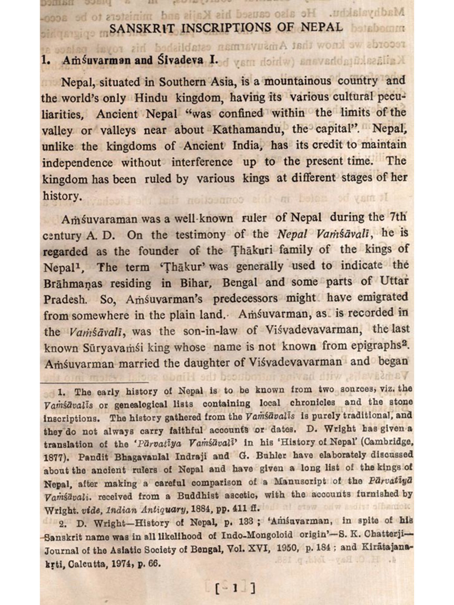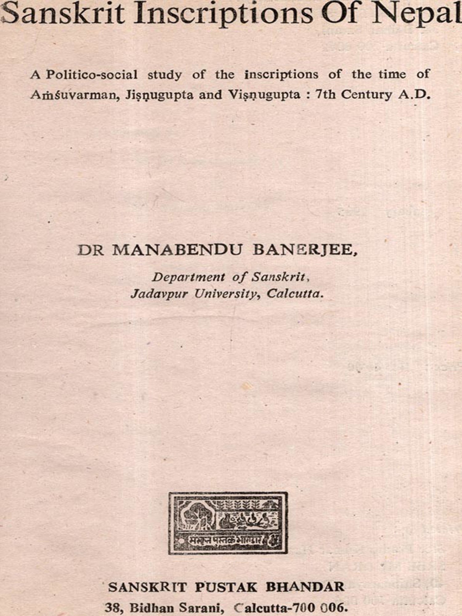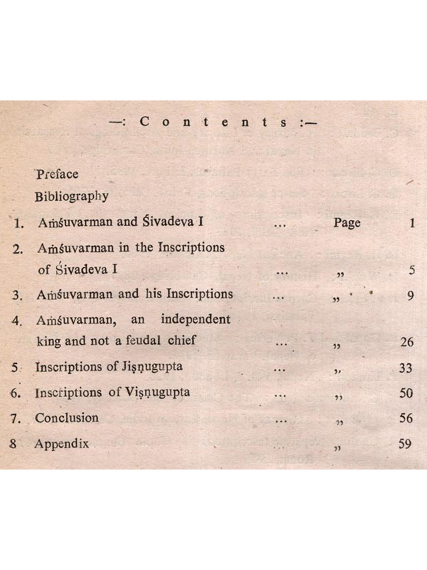 Since a distance of several centuries is the dividing line between. Nepal of the 7th century A. D. and the contemporary era, one cannot but lean heavily on a huge mass of Sanskrit inscriptions, found in Nepal, if one has to have an idea about the politico-cultural history of Nepal during the period under reveiew. The author has selected some important inscriptions having direct bearing on and pertaining to the activities of Amsuvarman, Jişnugupta, and Vişnugupta and it is hoped that this study will feed, if not enlighten, many a mind about the state of affairs and especially the trends of progress in Nepal of that time. The inscriptions discussed in this booklet have been collected from the esteemed works of Bhagavanlal Indraji, G. Buhlar, Raneiro Gnoli and C. Bendall. The author has gainad a great deal from the valuable treatment and comments made by D. R. Regmi in his 'Ancient Nepal' and 'Inscriptions of Ancient Nepal' (in 3 volumes) and by Professor Radhagovinda Basak in his 'History of North-Eastern India.'