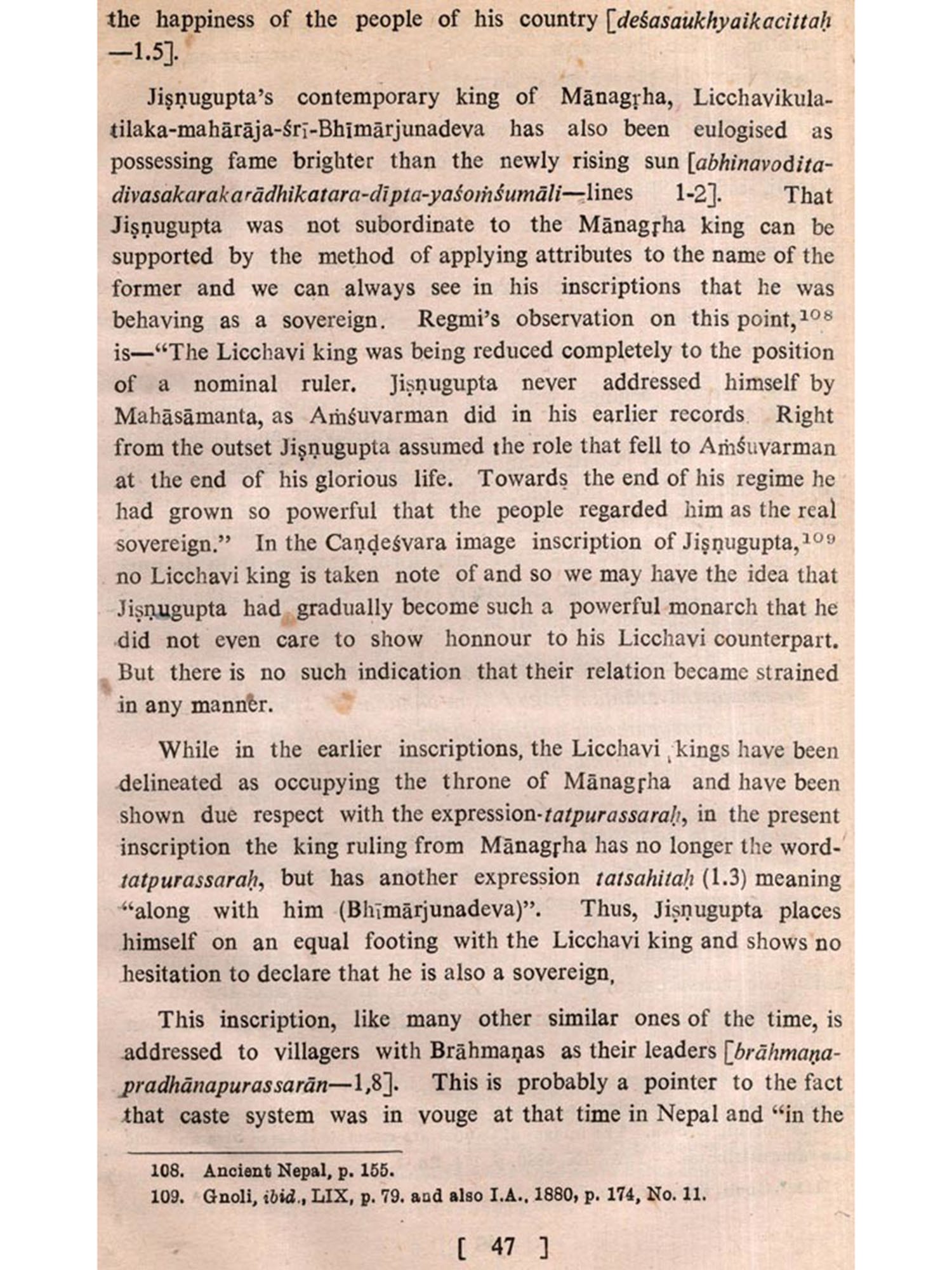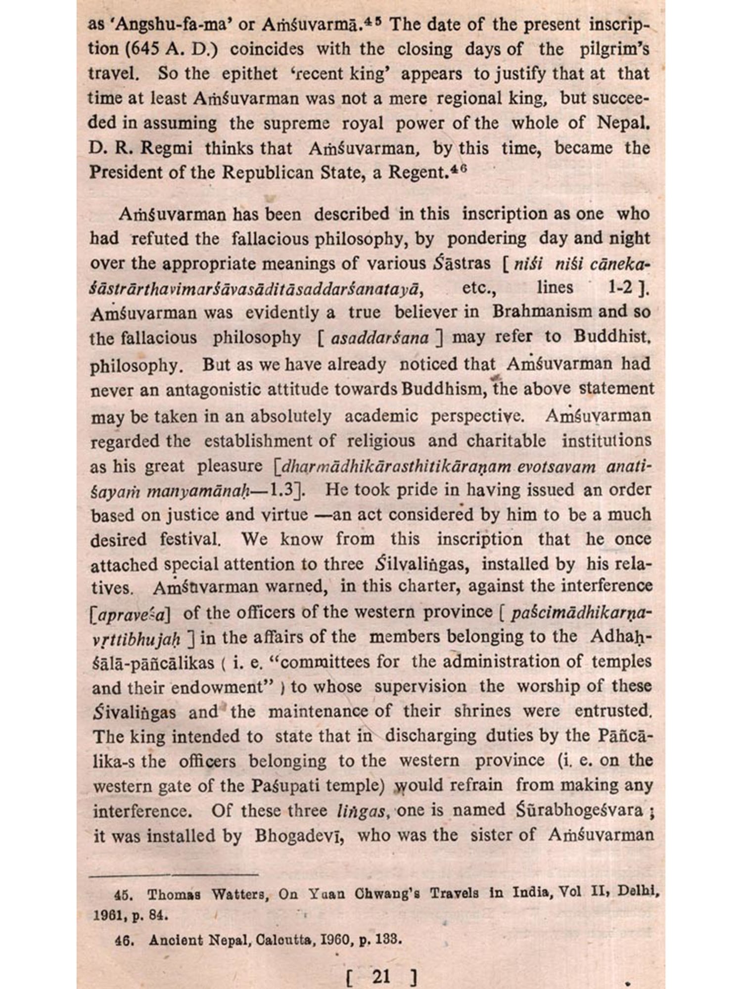 This dissertation is no path-breaking, scholastic work but a humble, yet insightful study into the politico-social and religious condition of Nepal under the regency of Amsuvarman and his followers, Jişnugupta and Vişnugupta all of whom ruled during the 7th century A. D. Despite the fact that they did not belong to the well-known royal Licchavi line and reigned only over a part of the country, they undoubtedly had left, within a short span of their governance, a memorable chapter of their efficiency in ruling, if not statecraft.