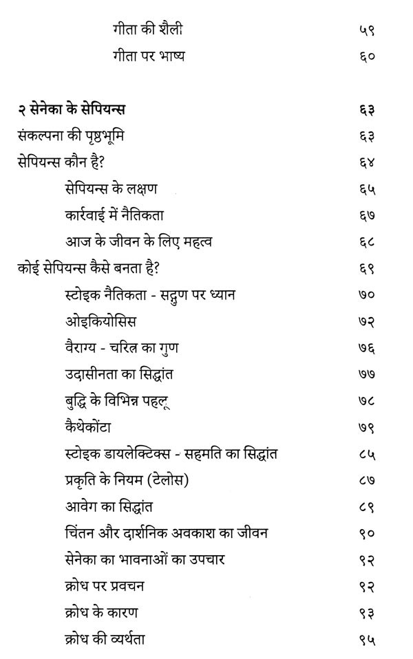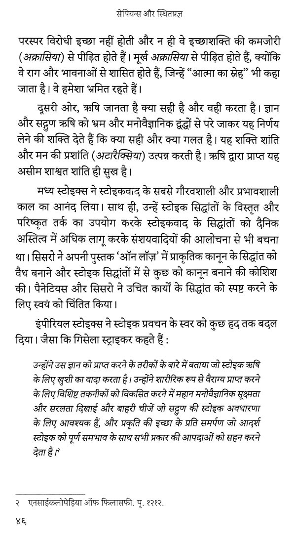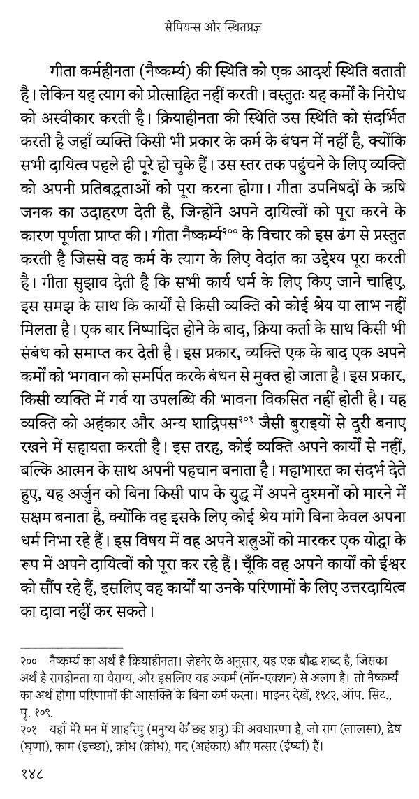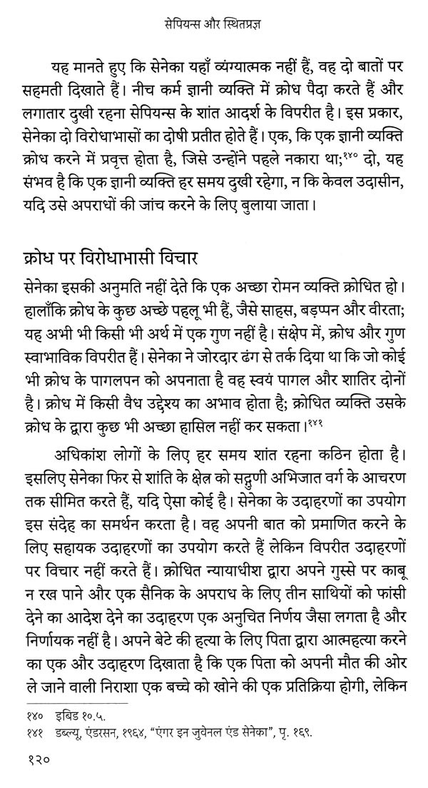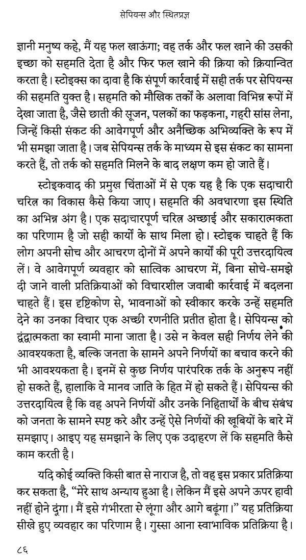 सेपियन्स और स्थितप्रज्ञ स्टोइक सेनेका और भगवद्गीता में एक ज्ञानी व्यक्ति की अवधारणा का अध्ययन करती है। हालांकि गीता और सेनेका की रचनाएँ कम से कम दो शताब्दियों के अंतर पर और एक महाद्वीप के अंतर पर लिखी गई थीं, फिर भी एक अच्छे जीवन की सिफ़ारिश करने में उनमें बहुत समानता है। यह पुस्तक बताती है कि कैसे एक ज्ञानी व्यक्ति सगुण और ज्ञान दोनों से संपन्न होता है, नैतिक होता है, सही निर्णय लेता है और कायों की जिम्मेदारी लेता है। एक ज्ञानी और गुणी व्यक्ति हमेशा सुख का आनंद लेता है, क्योंकि सुख यह जानने में होता है कि उसने सही समय पर सही काम किया है। सेनेका और गीता दोनों ही एक सदाचारी और प्रभावी जीवन जीने के लिए बौद्धिक कठोरता और ज्ञान की मांग करते हैं। वे कैसे ज्ञानी बनें, इसके लिए दिशानिर्देश प्रदान करते हैं। दोनों प्रणालियाँ एक ऋषि से भावनात्मक रूप से स्वस्थ और राग रहित होने की मांग करती हैं। इससे मानसिक शांति और संतुलन और अंततः शांति और सुख मिलते हैं। इन समानताओं का सर्वेक्षण करते समय, यह अध्ययन इन विचारों को लागू करने के तरीकों में भी अंतर पाता है। गीता की तत्वमीमांसा ऋऋषि को ध्यान का अभ्यास करने के लिए बाध्य करती है, जबकि स्टोइक्स के अनुसार ऋषि को एक तर्कसंगत व्यक्ति होना चाहिए जो किसी भी स्थिति का विश्लेषण और बौद्धिककरण करने के लिए प्रतिबद्ध हो। यह तुलनात्मक अध्ययन प्राचीन पश्चिमी और प्राचीन भारतीय दर्शन दोनों के छात्रों के लिए रुचिकर होगा। स्टोइकवाद के अभ्यासकर्ताओं और गीता के अनुयायियों को रुचि की एक बहुत ही अलग परंपरा में निकट-संबंधित विचारों की उपस्थिति का पता लगाना चाहिए, जबकि शायद कुछ अलग-अलग नुस्खों को कार्रवाई के लिए प्रेरित करना चाहिए।