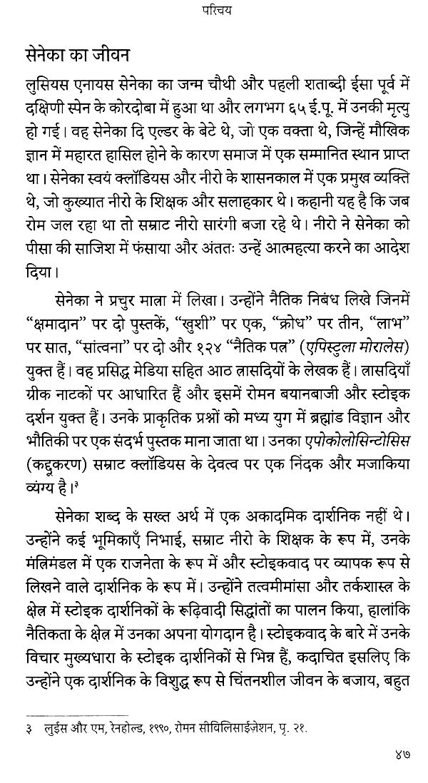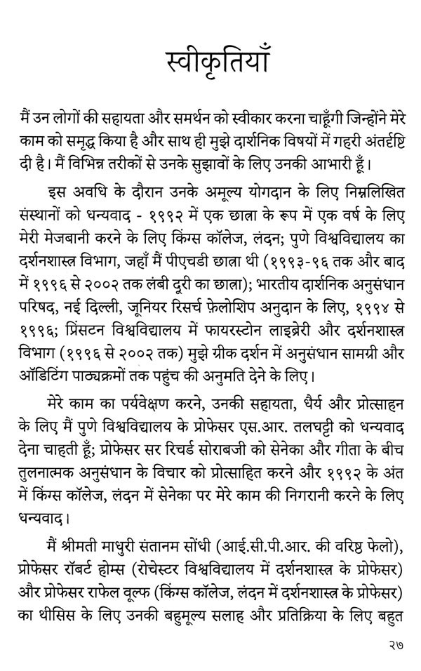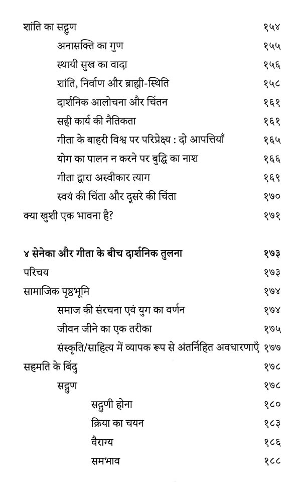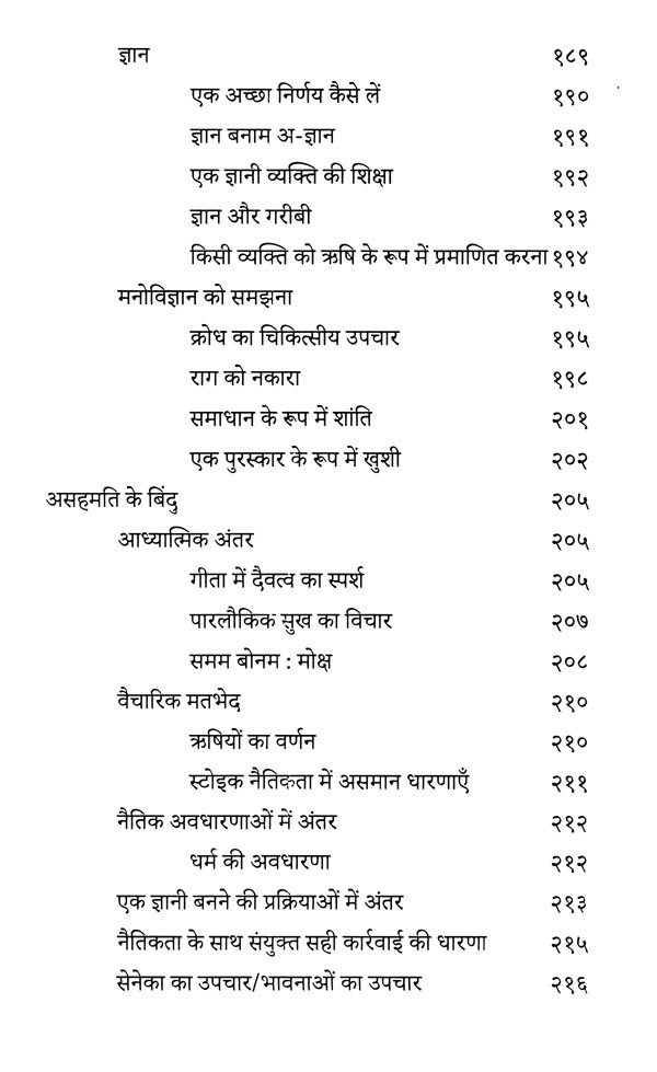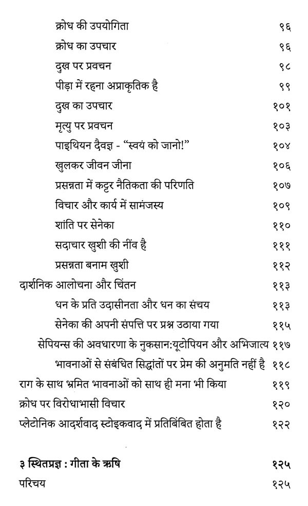 सेपियन्स और स्थितप्रज्ञ स्टोइक सेनेका और भगवद्गीता में एक ज्ञानी व्यक्ति की अवधारणा का अध्ययन करती है। हालांकि गीता और सेनेका की रचनाएँ कम से कम दो शताब्दियों के अंतर पर और एक महाद्वीप के अंतर पर लिखी गई थीं, फिर भी एक अच्छे जीवन की सिफ़ारिश करने में उनमें बहुत समानता है। यह पुस्तक बताती है कि कैसे एक ज्ञानी व्यक्ति सगुण और ज्ञान दोनों से संपन्न होता है, नैतिक होता है, सही निर्णय लेता है और कायों की जिम्मेदारी लेता है। एक ज्ञानी और गुणी व्यक्ति हमेशा सुख का आनंद लेता है, क्योंकि सुख यह जानने में होता है कि उसने सही समय पर सही काम किया है। सेनेका और गीता दोनों ही एक सदाचारी और प्रभावी जीवन जीने के लिए बौद्धिक कठोरता और ज्ञान की मांग करते हैं। वे कैसे ज्ञानी बनें, इसके लिए दिशानिर्देश प्रदान करते हैं। दोनों प्रणालियाँ एक ऋषि से भावनात्मक रूप से स्वस्थ और राग रहित होने की मांग करती हैं। इससे मानसिक शांति और संतुलन और अंततः शांति और सुख मिलते हैं। इन समानताओं का सर्वेक्षण करते समय, यह अध्ययन इन विचारों को लागू करने के तरीकों में भी अंतर पाता है। गीता की तत्वमीमांसा ऋऋषि को ध्यान का अभ्यास करने के लिए बाध्य करती है, जबकि स्टोइक्स के अनुसार ऋषि को एक तर्कसंगत व्यक्ति होना चाहिए जो किसी भी स्थिति का विश्लेषण और बौद्धिककरण करने के लिए प्रतिबद्ध हो। यह तुलनात्मक अध्ययन प्राचीन पश्चिमी और प्राचीन भारतीय दर्शन दोनों के छात्रों के लिए रुचिकर होगा। स्टोइकवाद के अभ्यासकर्ताओं और गीता के अनुयायियों को रुचि की एक बहुत ही अलग परंपरा में निकट-संबंधित विचारों की उपस्थिति का पता लगाना चाहिए, जबकि शायद कुछ अलग-अलग नुस्खों को कार्रवाई के लिए प्रेरित करना चाहिए।