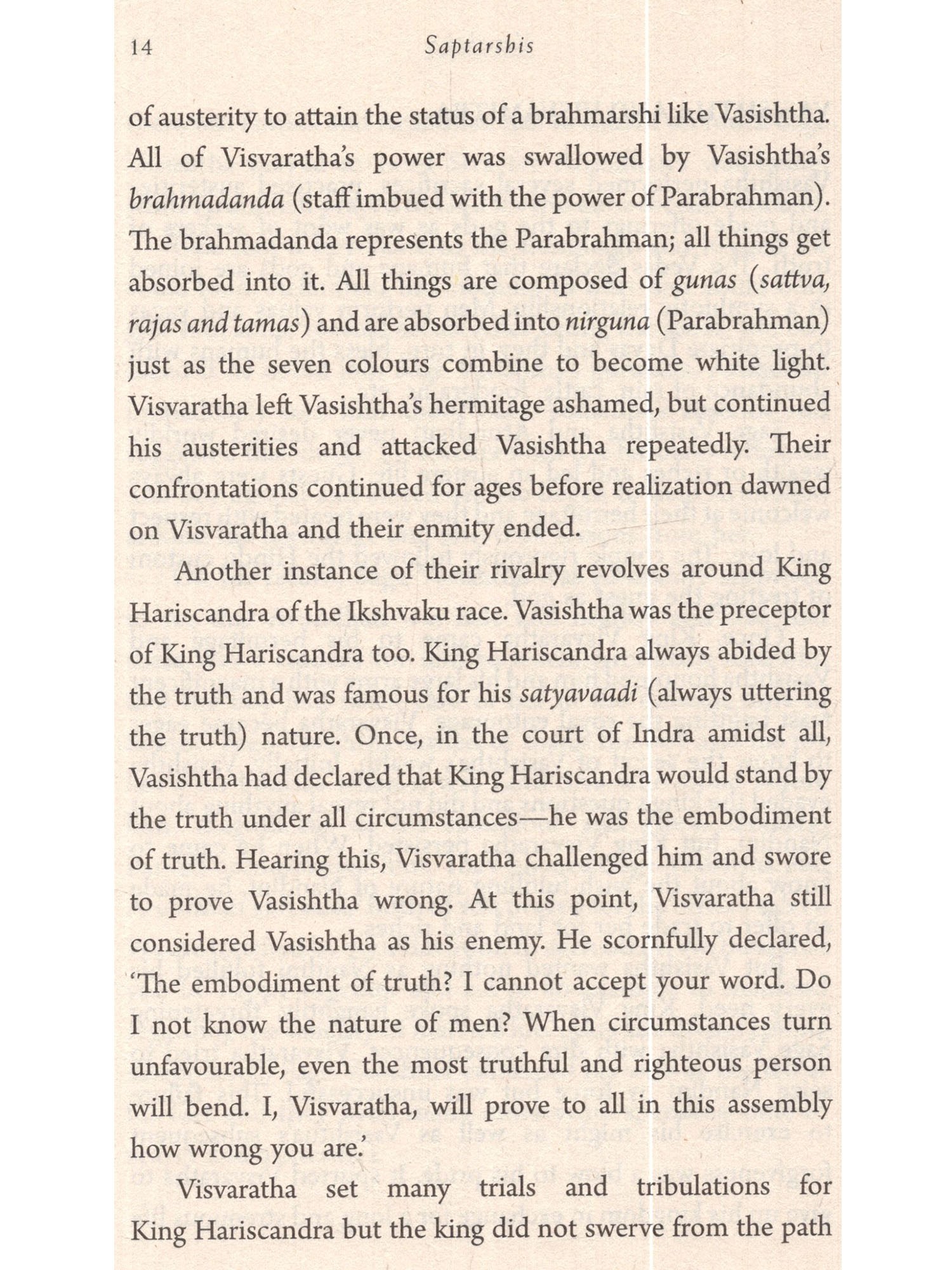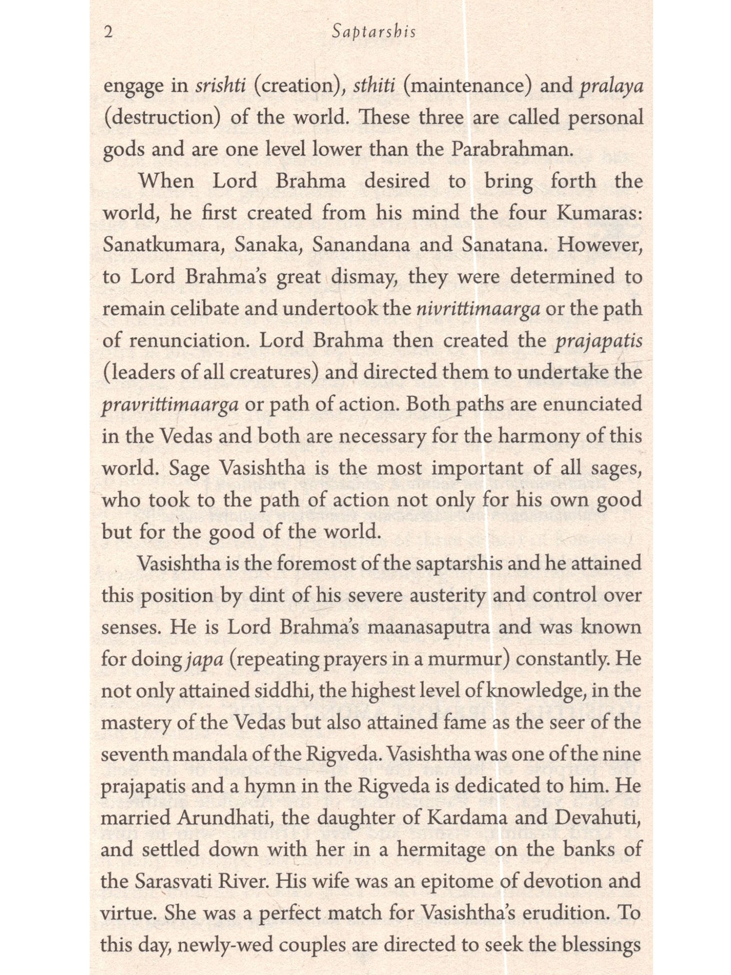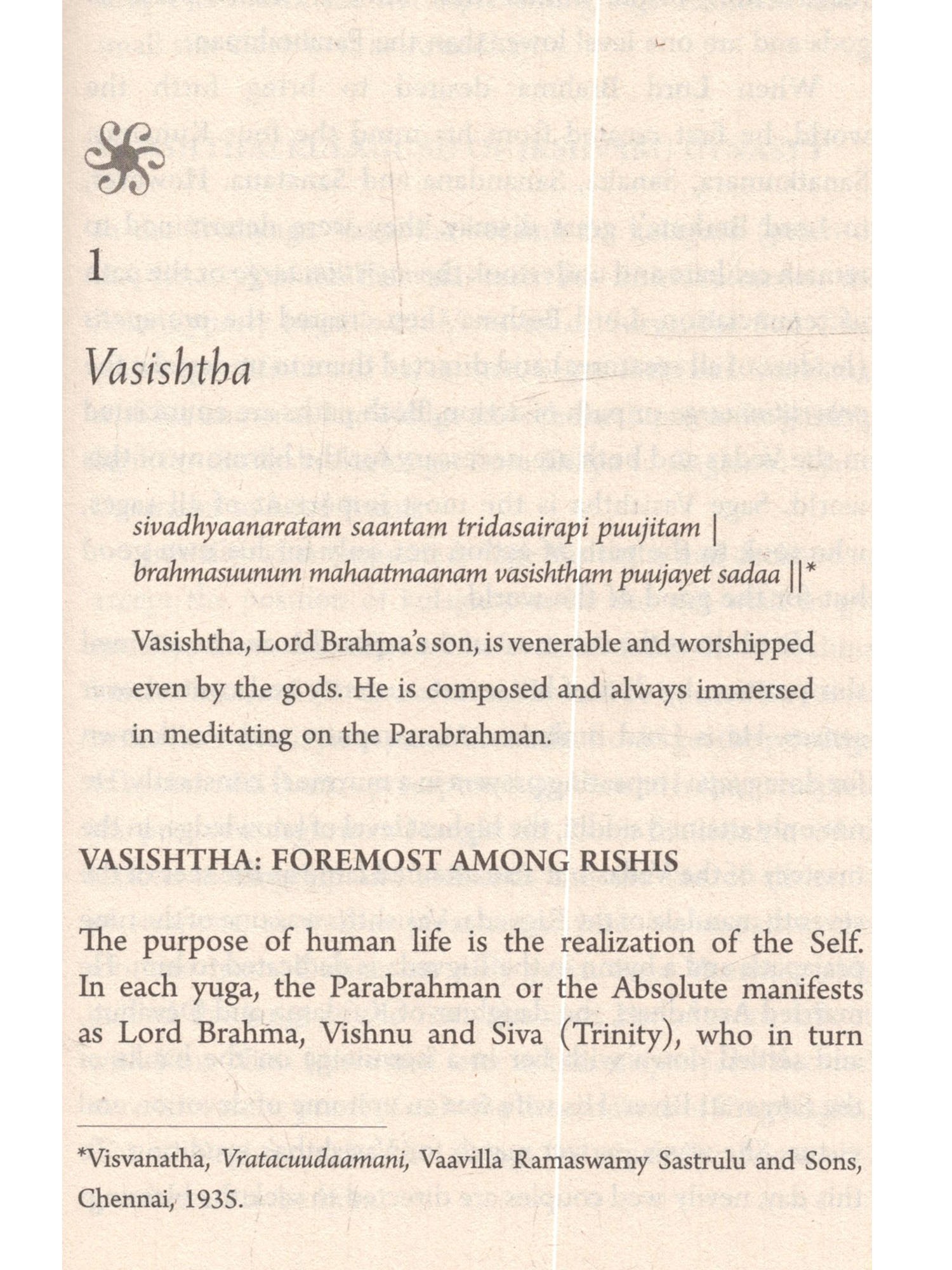 The Makings of a Rishi The Vedas are known to be apaurusheya (not of human creation). They were revealed by Lord Brahma to certain persons who had attained spiritual knowledge by practising severe austerities. Thus, these persons came to be known as rishis. Since Vedic mantras were revealed to them, they were called mantradrashtaarah (seers of Vedic hymns). Bhrigu, Kavya, Prachetasa, Gritsamada, Nabha, Angirasa, Bharadvaja, Gargya, Kanva, Vamadeva, Kakshivanta, Kasyapa, Vatsara, Raibhya, Atri, Valgutaka, Vasishtha and Kundina were such rishis. In the Rigveda, each mandala (book) is known to have been revealed to a particular rishi or his family. These mandalas are known as 'family books. The rishi of the second mandala was Gritsamada; of the third mandala, Visvamitra; of the fourth, Vamadeva. Similarly, Atri, Bharadvaja, Vasishtha and Kanva are the seers of the fifth, sixth, seventh and eighth mandalas, respectively. The mantras of the first, ninth and tenth mandalas were contributed by various rishis. Sometimes, these rishis are also known as mantrakritah (composers of mantras) and mantrapatayah (masters of mantras) as the revealed mantras were later transmitted by them to their students who learned through sravana (hearing). A person is not born a rishi; a person has to attain the status of a 'rishi. He generally belonged to the brahmavarna (people of knowledge) as they were known in those days and obtained the status of rishi by tapas (austerity). The word 'rishi' means a person who is continuously on the move to know rta, the ultimate truth. The knowledge obtained in this process is utilized by them for the well-being and happiness of humanity at large. All branches of learning owe their allegiance to these great souls. The Vishnu Purana declares a rishi as one who knows Parabrahman (Supreme Spirit) abiding in the cavity of one's own heart. Such a person attains all his desires while being in Parabrahman. A rishi is a person who has overcome asuric (demonic) qualities like anger, lust, greed, jealousy, arrogance, pride, ignorance and selfishness and has developed daivii (divine) attributes described in the Bhagavad Gita Verse 16.1-3. Some of the daivii qualities are purity of mind, charity, self-control, study of scriptures, austerity, uprightness, non-violence, truth, renunciation and forgiveness. A good definition of a rishi is available in the verse.