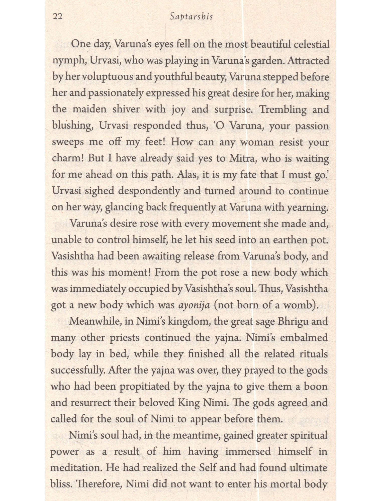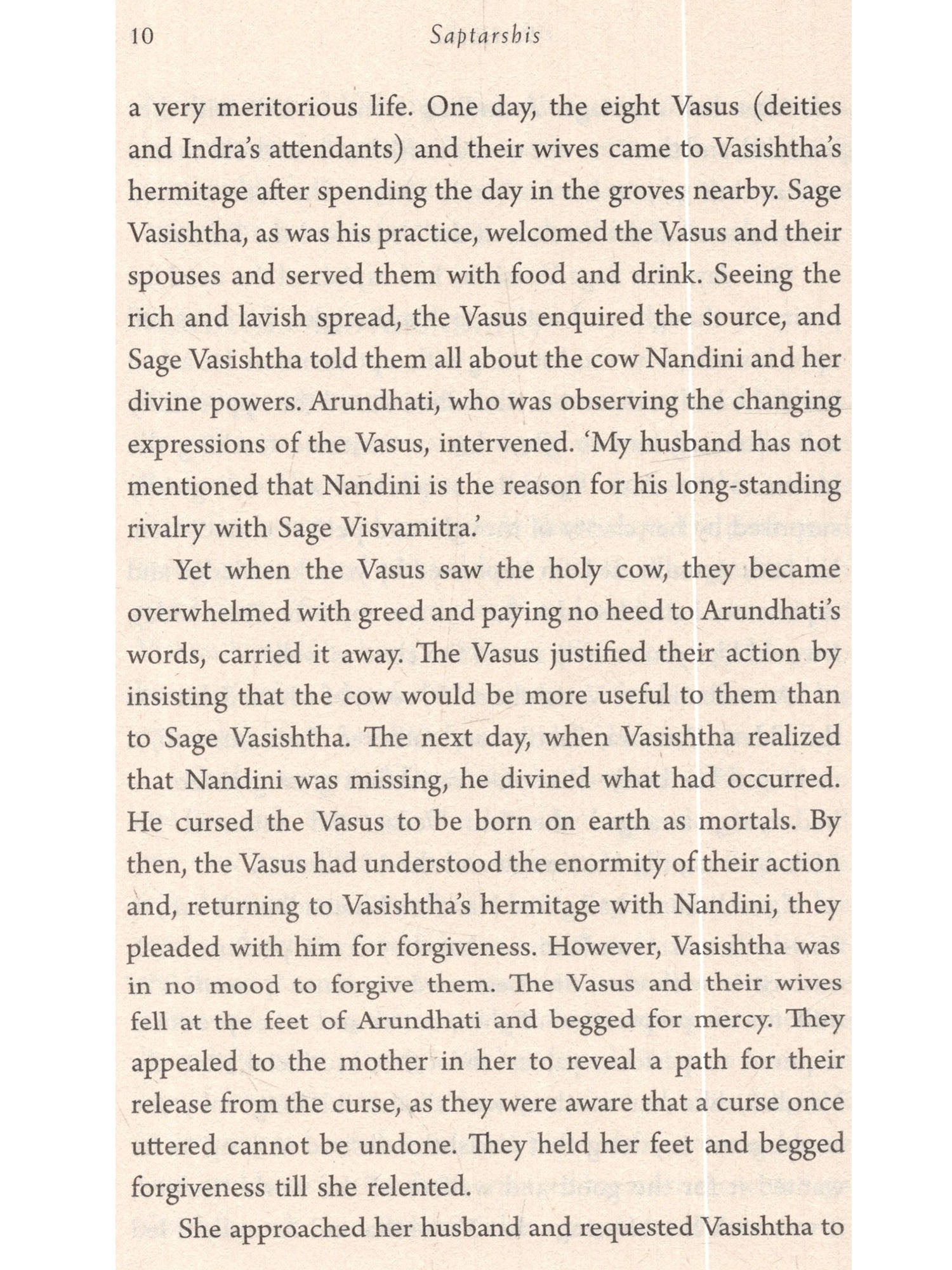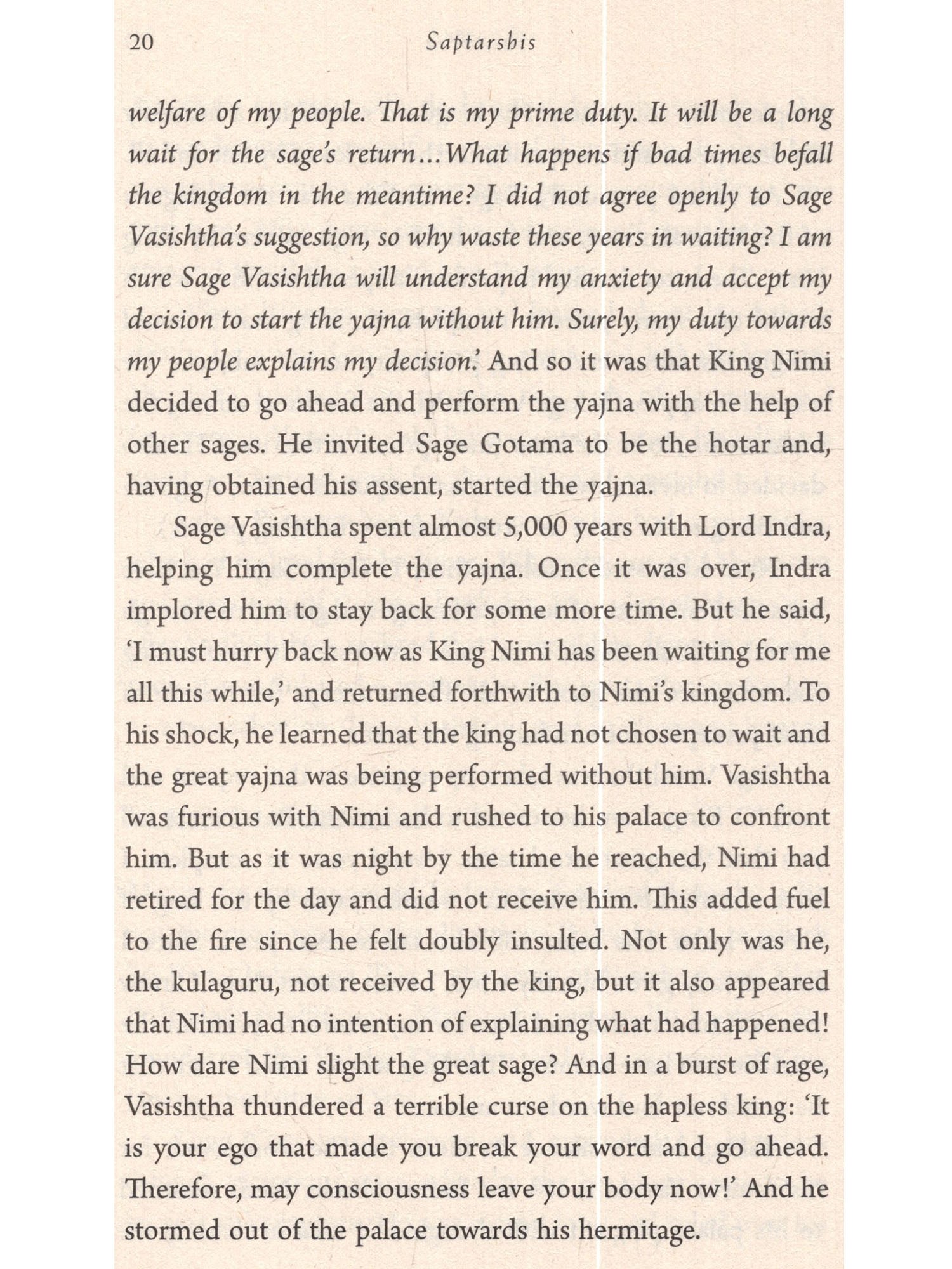 How could Sage Vasishtha attribute such an action to him? He lost control of his senses and, in turn, took water in his palm. Madayanti, who was watching in horror, approached him in one swift movement and held his hand. When Mitrasaha turned his face towards her, she shook her head. 'No, my Lord! What is it you are doing? Sage Vasishtha is our kulaguru. Mitrasaha felt ashamed and sprinkled the water on his own feet. At once, his feet became spotted with black marks, and having changed into a demon, he left the palace?