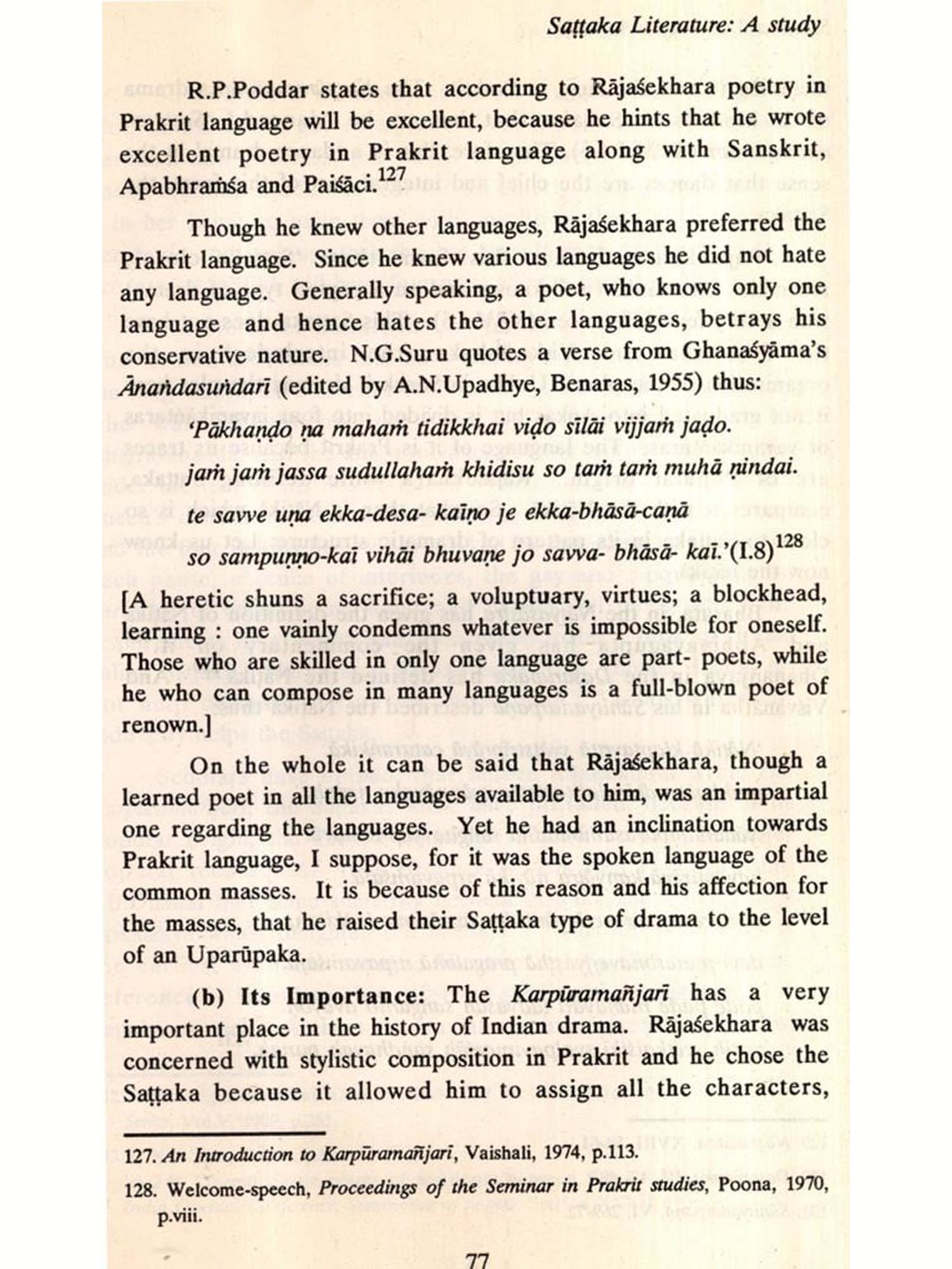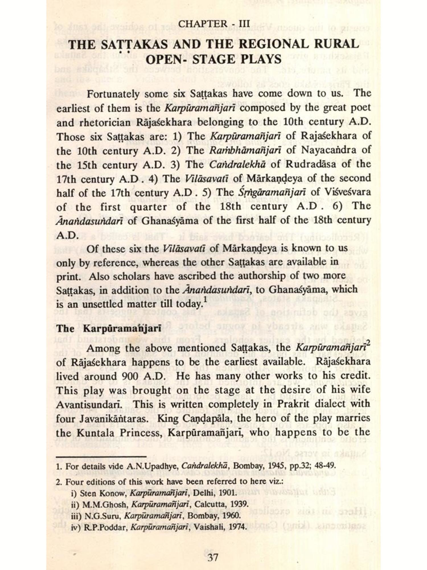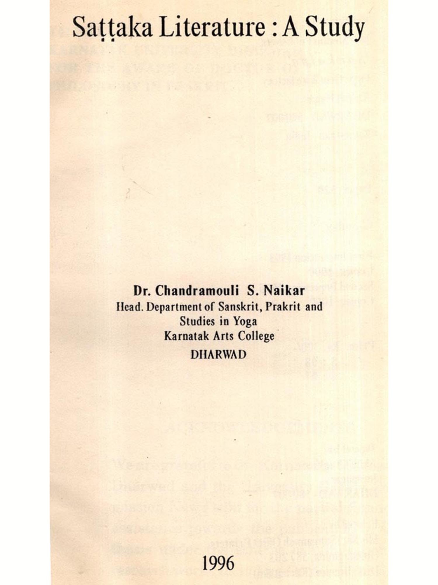 The Sattaka is a literary cast in Prakrit evolved through centuries from the early dramatic entertainment. The Sattakas, though found in small number, roused considerable interest among Prakrit and oriental scholars, when Prof. Sten Know, as inspired by his teacher Prof. R.Pischel, brought out a critical edition of the Karpuramanjari Sattaka in 1900 A.D., as Vol. IV of the Harvard Oriental Scrics. Eminent scholars like Dr. M.M.Ghosh, Dr. A.N.Upadhyc, Prof. N.G.Suru, Dr. R.P.Poddar etc. brought out critical editions of the available five Sattakas with their respective studies; and reputed scholars like Professors Sylvain Lévi, A.B.Keith, R.V.Jahagirdar, I.Shekhar etc. put forth their critical views and opinions on the problems connected with the Sattakas. Now Dr. C.S.Naikar has come forward to present in this book a co-ordinated, critical study of the Sattakas as a whole unit and, thus, fills up such long felt desideratum.
