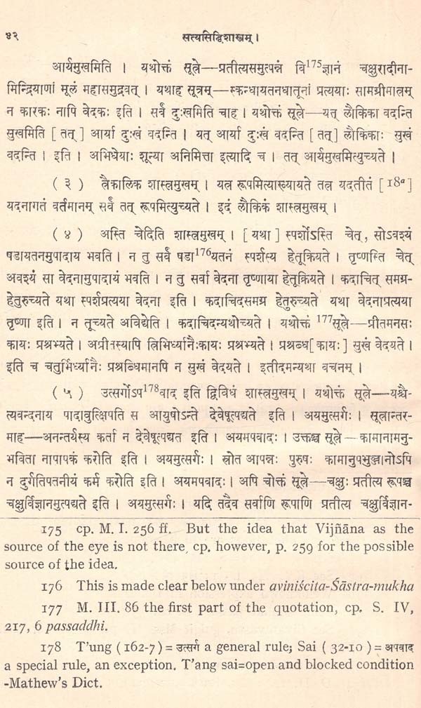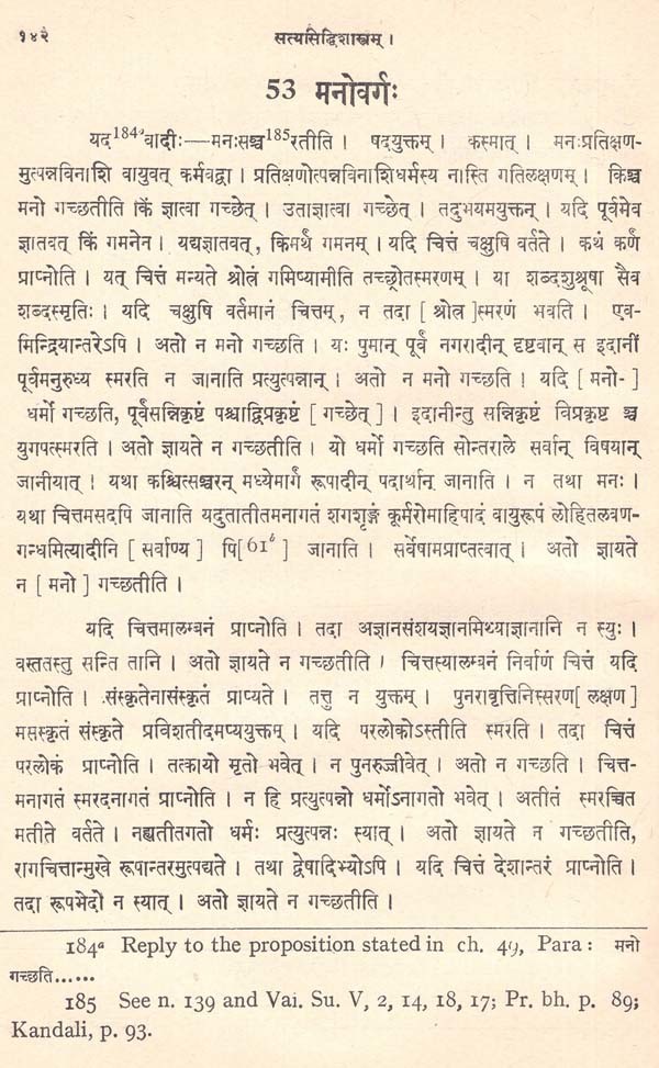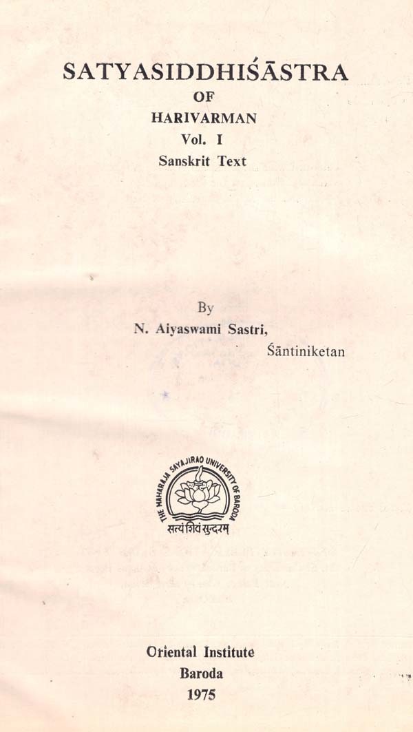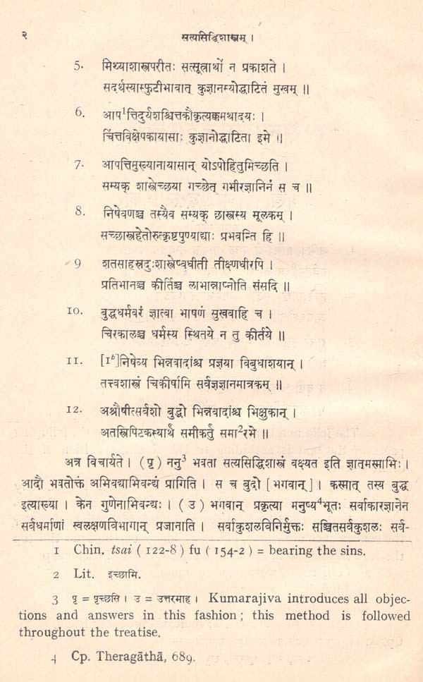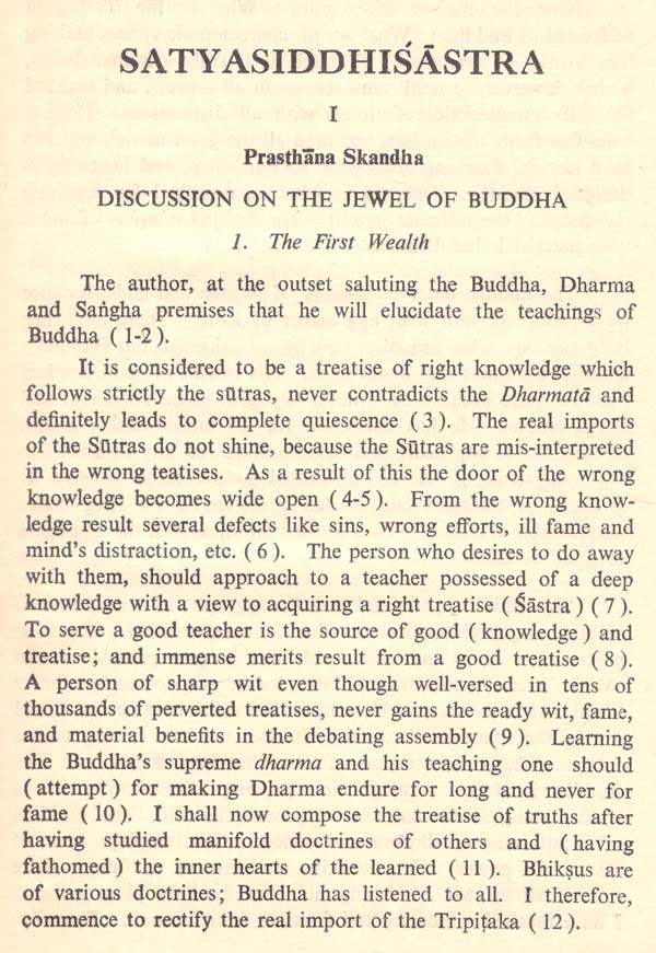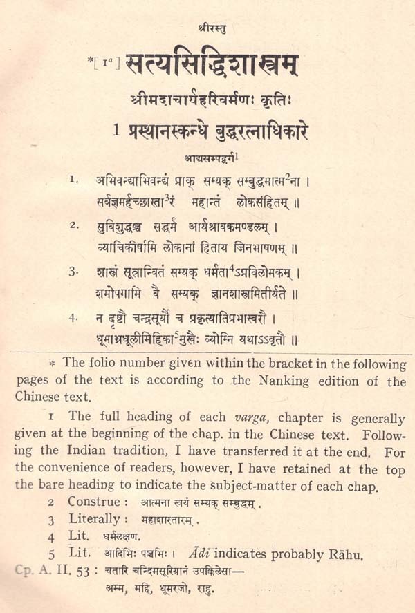 Acarya Harivarman's SATYASIDDHI has been evaluated by Orientalists as one of the priceless treasures in Indian literature. Since the original Sanskrit of this invaluable treatise has been perished forever leaving behind an imperfect replica into Chinese translation we have to fall back upon this translation for an appraisal of its entire contents. The Chinese translation was made by Kumara- jiva in 412 A.D. and fortunately has been preserved in the collection of Chinese Tripijaka (v. Nanjio No. 1274). The present Sanskrit rendering from the only Chinese translation of the treatise was undertaken by the present writer as a part of research work under the scheme of Cultural Fellowship sponsored by the Nationalist Government of China in 1945 under the auspice of the Visva Bharati. The Chinese text that I have used here is one published by the Sutra Engraving Institute, Nanking corresponding to the Taisho Edition, Vol. 32, No. 1666, pp. 239 ff.