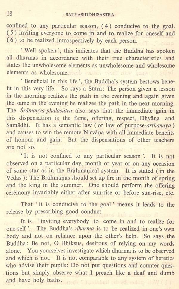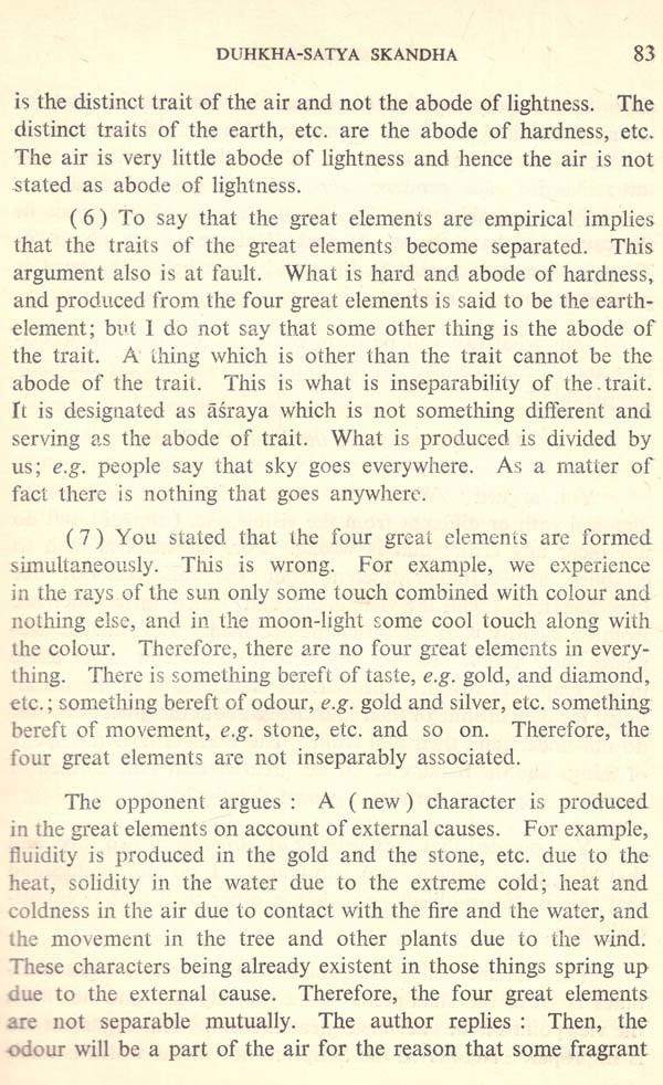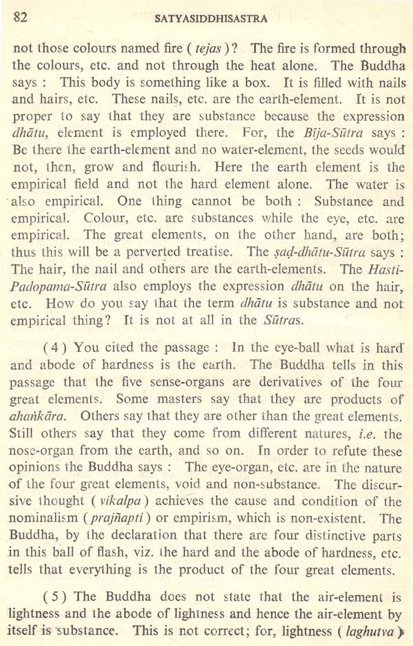 In the very beginning, Harivarman claims that his treatise is of right know- ledge and follows strictly the spirit of the Sutras. Harivarman appears as a strong critic of those that to him appear as not confirmed and sanctioned by the scriptures. The author's unique contribution to Buddhism lies in his masterly exposition of the theory of elements.