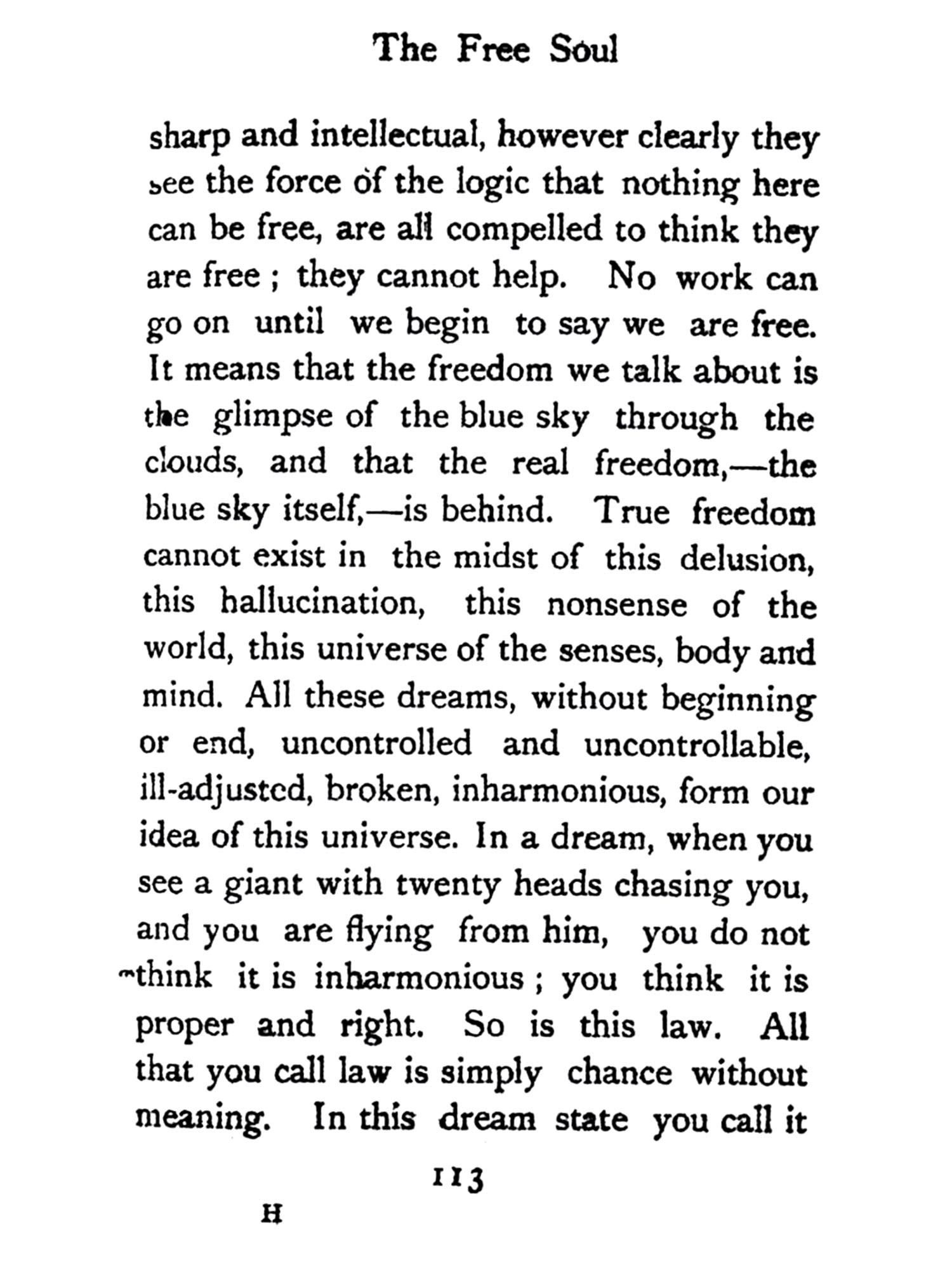 The great question of all questions at the present time is this: Taking for grant-ed that the known and the knowable are bounded on both sides by the unknowable and the infinitely unknown, why struggle for that infinite unknown? Why shall we not be content with the known? Why shall we not rest satisfied with eating, drinking, and doing a little good to society? This idea is in the air. From the most learned professor to the prattling baby, we are told to do good to the world, that is all of religion, and that it is useless to trouble ourselves about questions of the beyond. So much is this the case that it has become a truism.