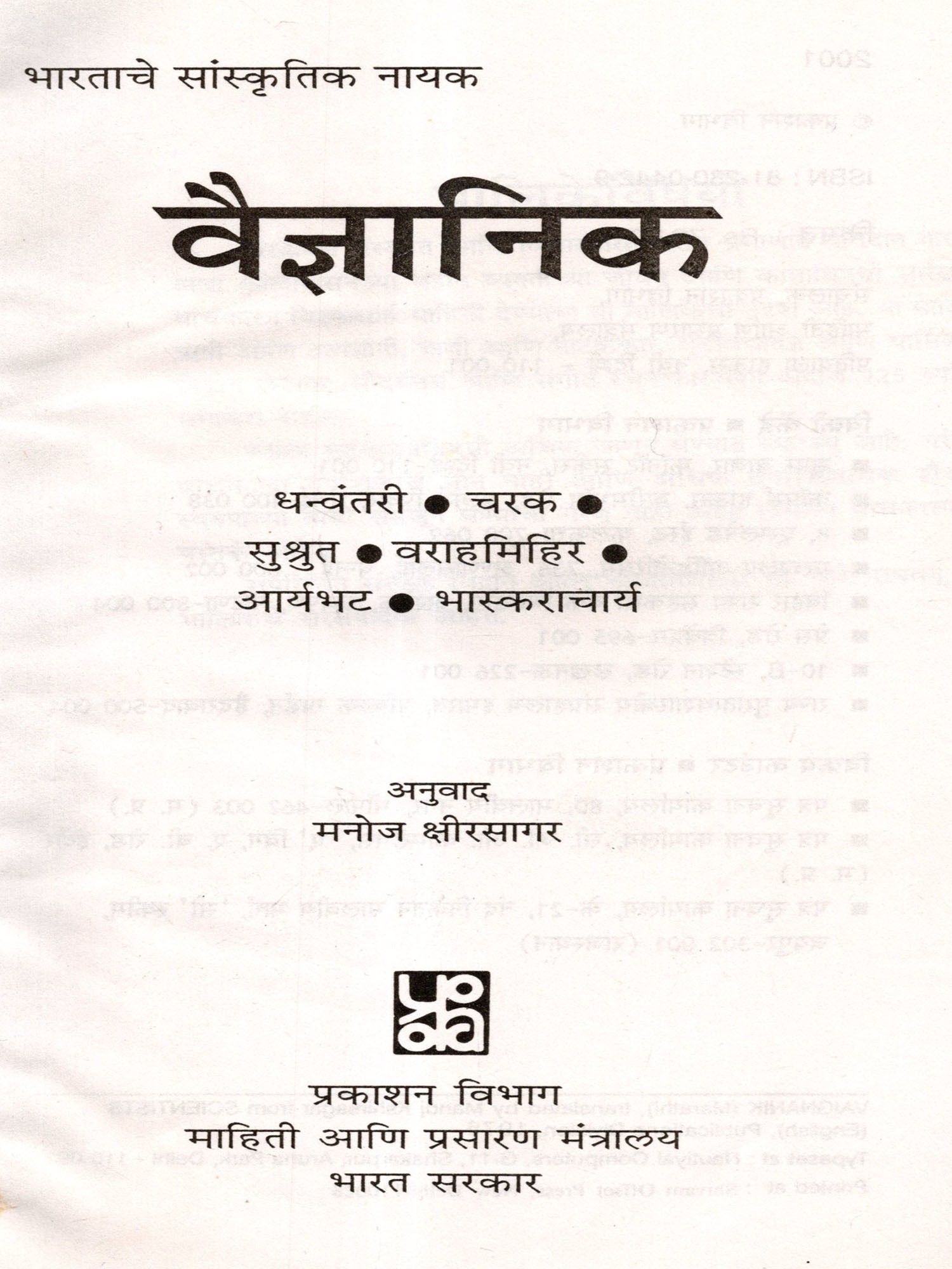 वैज्ञानिक: Scientist- Dhanvantari, Charaka, Sushruta, Varahamihira, Aryabhata, Bhaskaracharya (Marathi)