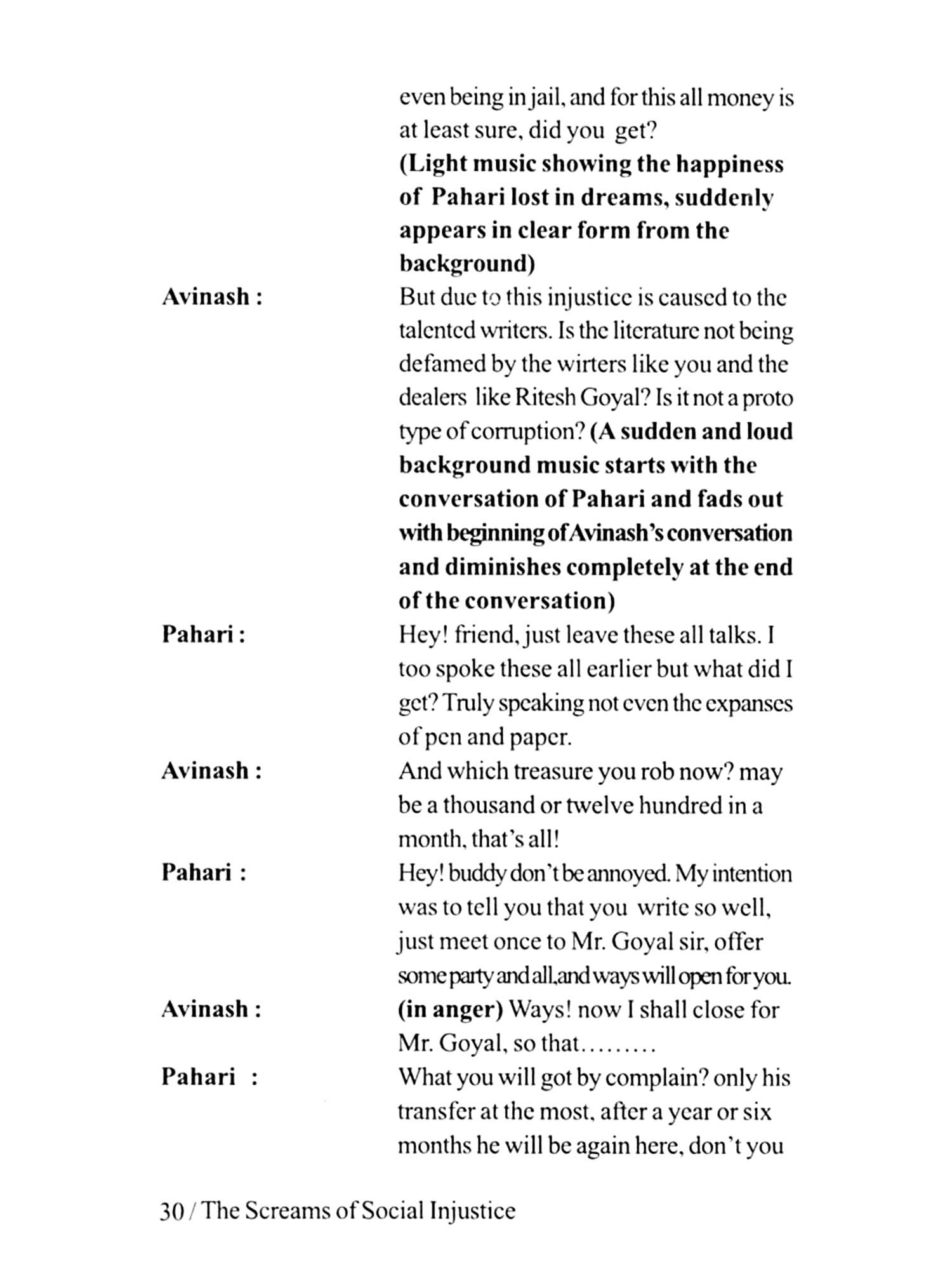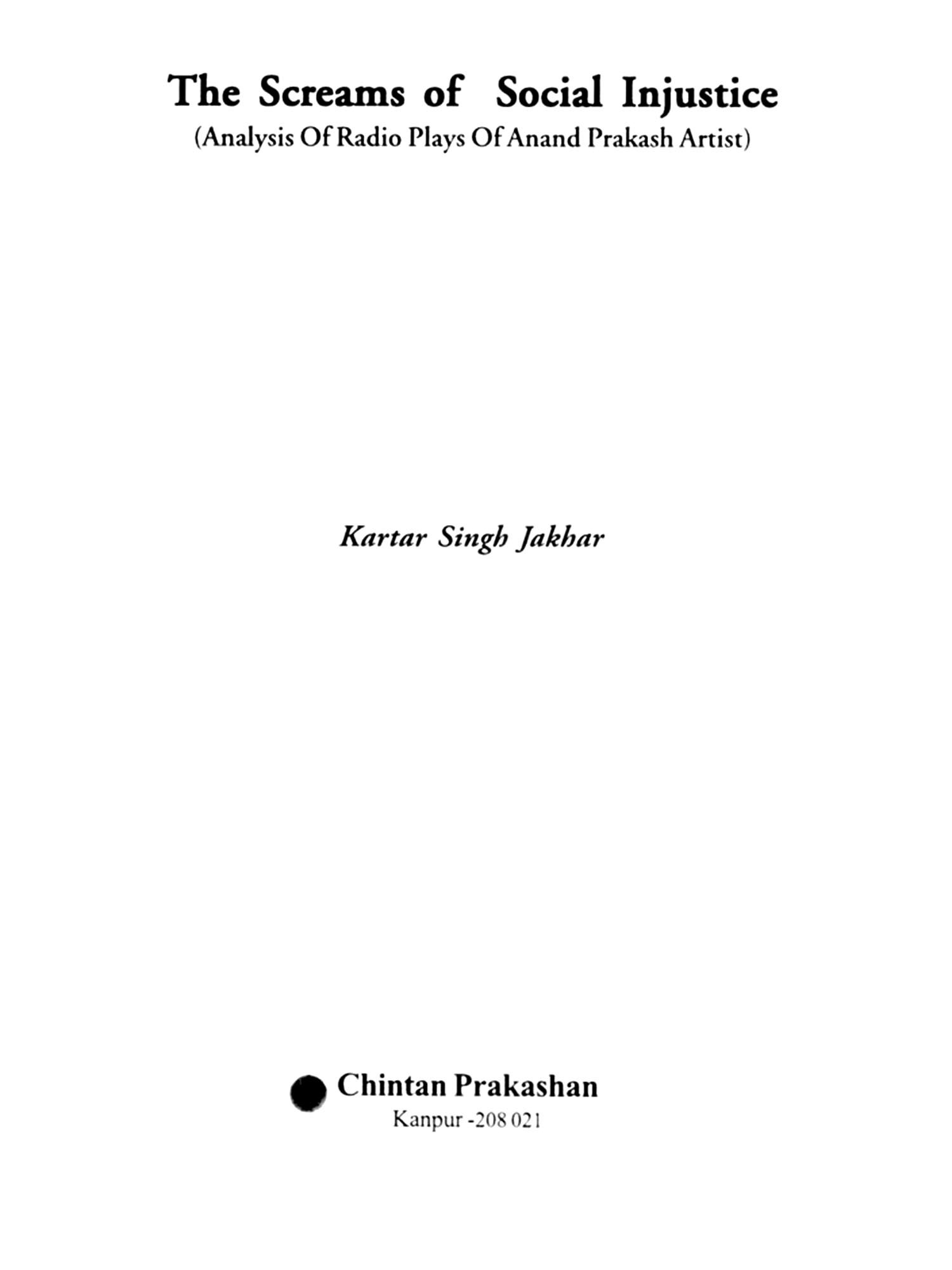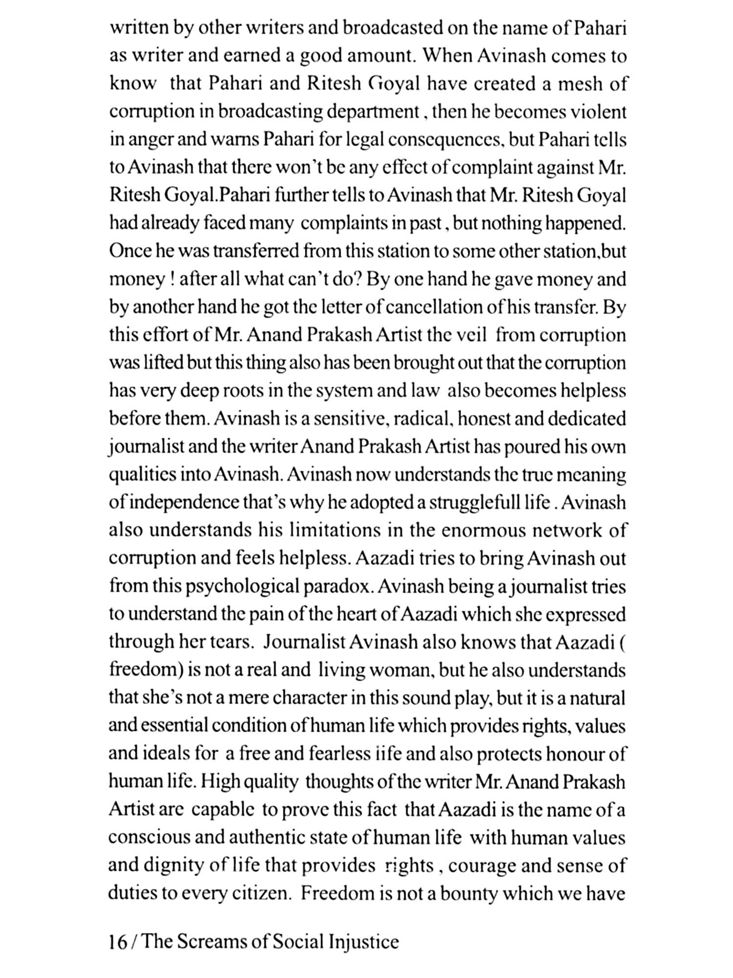 It is a matter of great proud and privilege to share this with the readers that after reading the book 'Aazadi ke Aansu' a collection of five radio plays written by Sh. Anand Prakash Artist I was constantly feeling a kind of revolution of thoughts in my mind because of a great impact of the force of literature of social issues raised by the writer. The whole series of the plays in 'Aazadi ke Aansu' is deeply involved in finding out the solution of the basic social issues like corruption, freedom of press and individual thoughts, illiteracy in slum areas, sexual harassments of girls, gender discrimination and greed and hunger for wealth. So to give an outer shape and space to my internal thoughts and impact, I decided to translate the book 'Aazadi Ke Aansu' in English with the new title "The Screams of Social Injustice" which is in your hands right now.