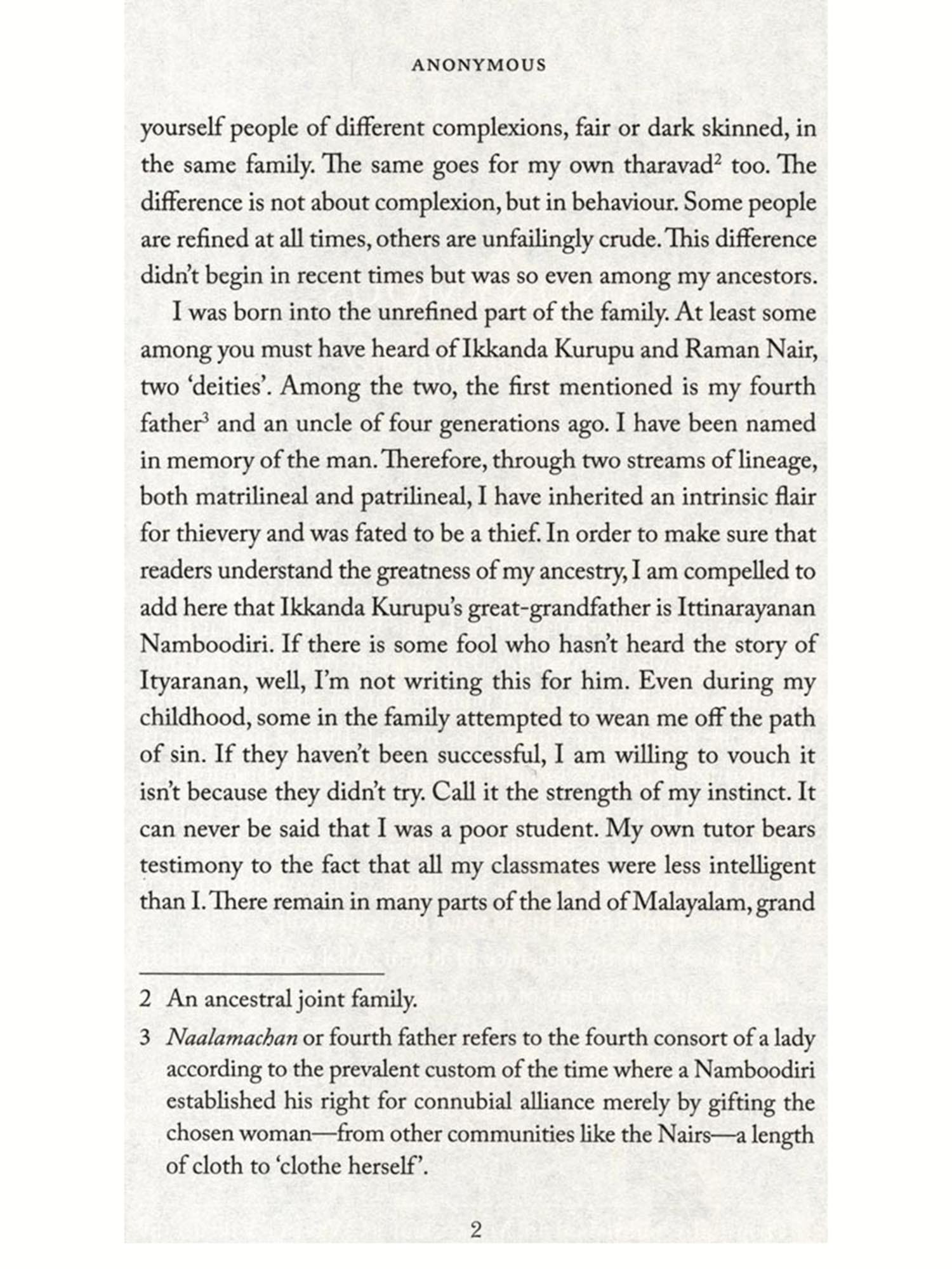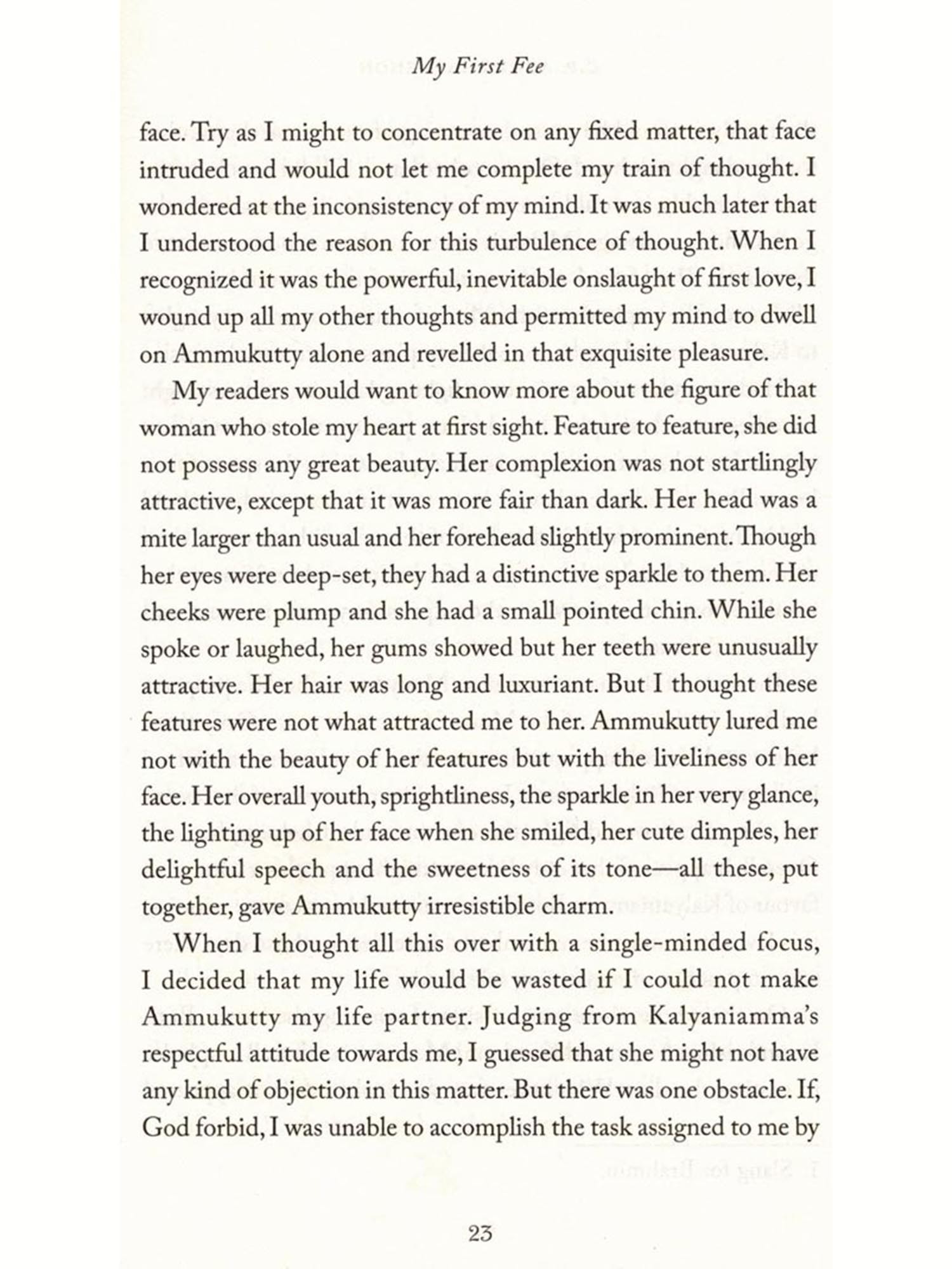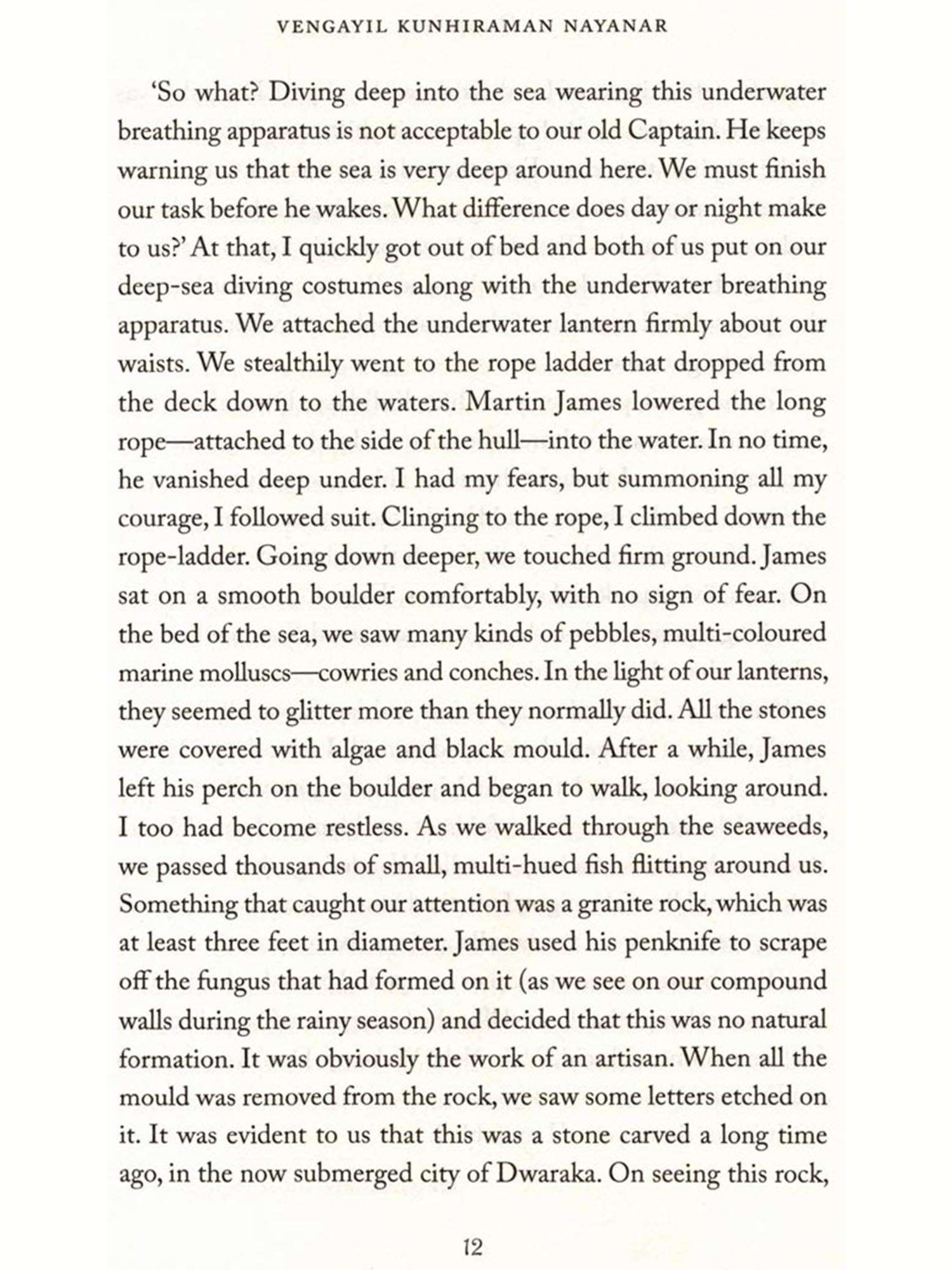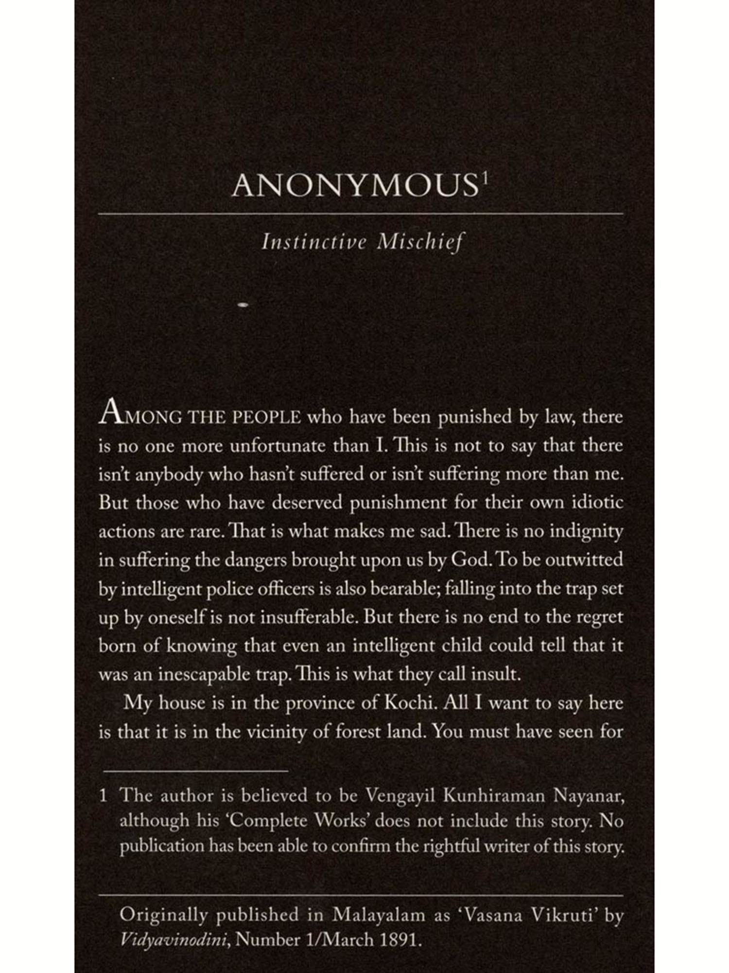 THE EVOLUTION OF Malayalam short stories can be traced back to the period between the concluding years of the nineteenth century and the early part of the twentieth century, arising from the initiative of contemporary publishers and those lovers of language who could relate to Western literature. Modern prose, especially literary prose, came into being only in the nineteenth century. The efforts of the Christian missionaries should be remembered with gratitude because they were the pioneers of liberal education and the translation of religious and moral texts into Malayalam, which had an impact on the popular imagination. There are a few who believe that the first short stories in Malayalam were the stories published for children by Kerala Varma Valiyakoil Thamburan (1845-1914). Those stories were compiled and published under the title Keralavarma Kathakal (1983). The distinctive features of those stories were their small format and allegorical content. Such publications that emerged during that inceptual period did have a tale-to-tell in each, but lacked the form and character of the short story of modern literature. The first true-to-character short story of Malayalam is 'Vasana Vikruti'-published as Instinctive Mischief' in this collection, originally published in 1891. It is believed that this story was written by Vengayil Kunhiraman Nayanar. However, researchers now say that the publisher of the story, the literary magazine Vidyavinodini, did not print his name as the author. The compilation of Nayanar's stories titled Kesari, published before his demise, does not include this story. The foreword to this compilation was written by C.P. Achutha Menon, the editor of Vidyavinodini. Were the story written by Vengayil Kunhiraman Nayanar, he might have indeed indicated it. 'Vasana Vikruti' exhibits all the distinctions now deemed mandatory for short stories. It is about the folly of a thief. The man, who fell into the trap of the police-thanks to his own folly-decides that he is not suited for his occupation and goes on a pilgrimage to Kashi. The story is written in first person as narrated by the thief who is discharged after serving a six-month sentence in jail. 'Dwaraka' (1993) by Vengayil Kunhiraman Nayanar (1860-1914) is considered to be the first ever 'fantasy tale' in Malayalam. The author, in his dream state, wears a watertight submersible suit and descends into the ocean where the ancient city of Dwaraka sank, along with a fellow officer of his ship. It is only when he is jolted awake by someone that the protagonist realizes that it was only a vivid dream. As reality and illusion intermingle in this story, it can be termed fantasy.