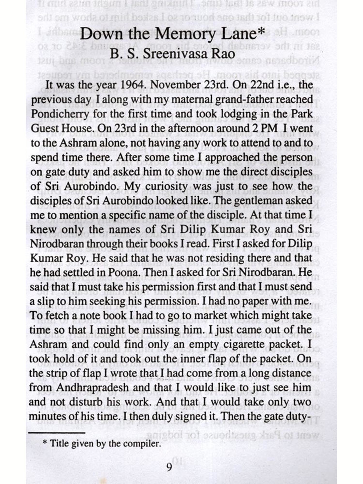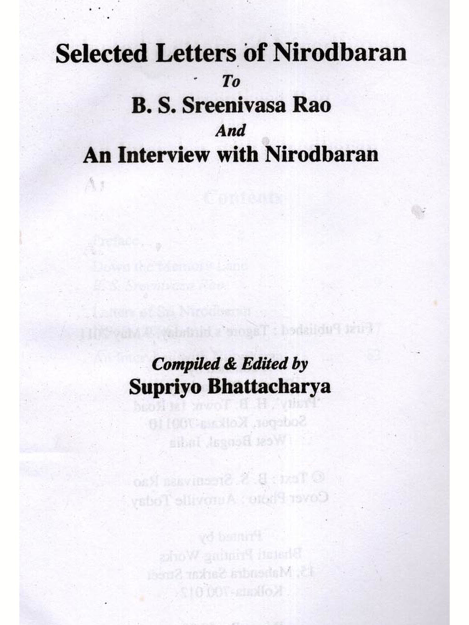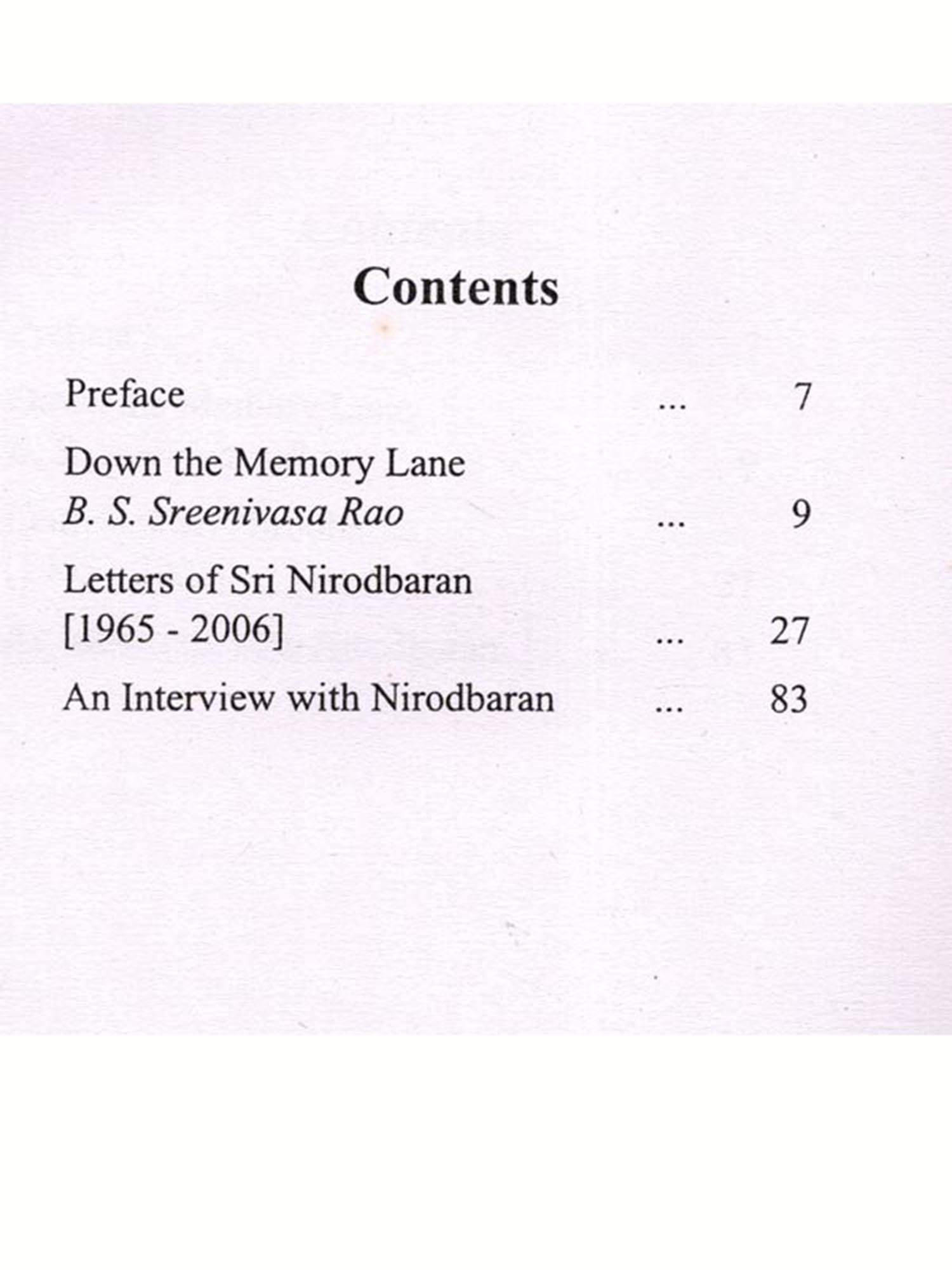 I am happy that I was given an opportunity to compile these letters of Sri Nirodbaran to B. S. Sreenivasa Rao (a retired senior government official residing in Hyderabad, Andhra Pradesh) written over a span of almost four decades. These letters were handed over to me by our dear late Banidi (niece of Nirodbaran) with a request to get them published as they would be of great use and interest to all fellow-travellers on the path. I immediately went through the letters and then rang up Sreenivasa, requesting him to send the original letters and a few photos and also an article narrating his reminiscences of Nirodbaran and supplying some background information to the letters. He readily complied with my request. On the basis of all the materials that I received form him, I made a selection of the letters and slightly edited the article that he had written at my request. In fact, I have kept it intact, retaining his language and style as far as possible, making only some minor corrections. I am indeed grateful to him for all the trouble that he had taken for the preparation of this book. His son who had worked hard with him for this purpose also deserves our grateful thanks.