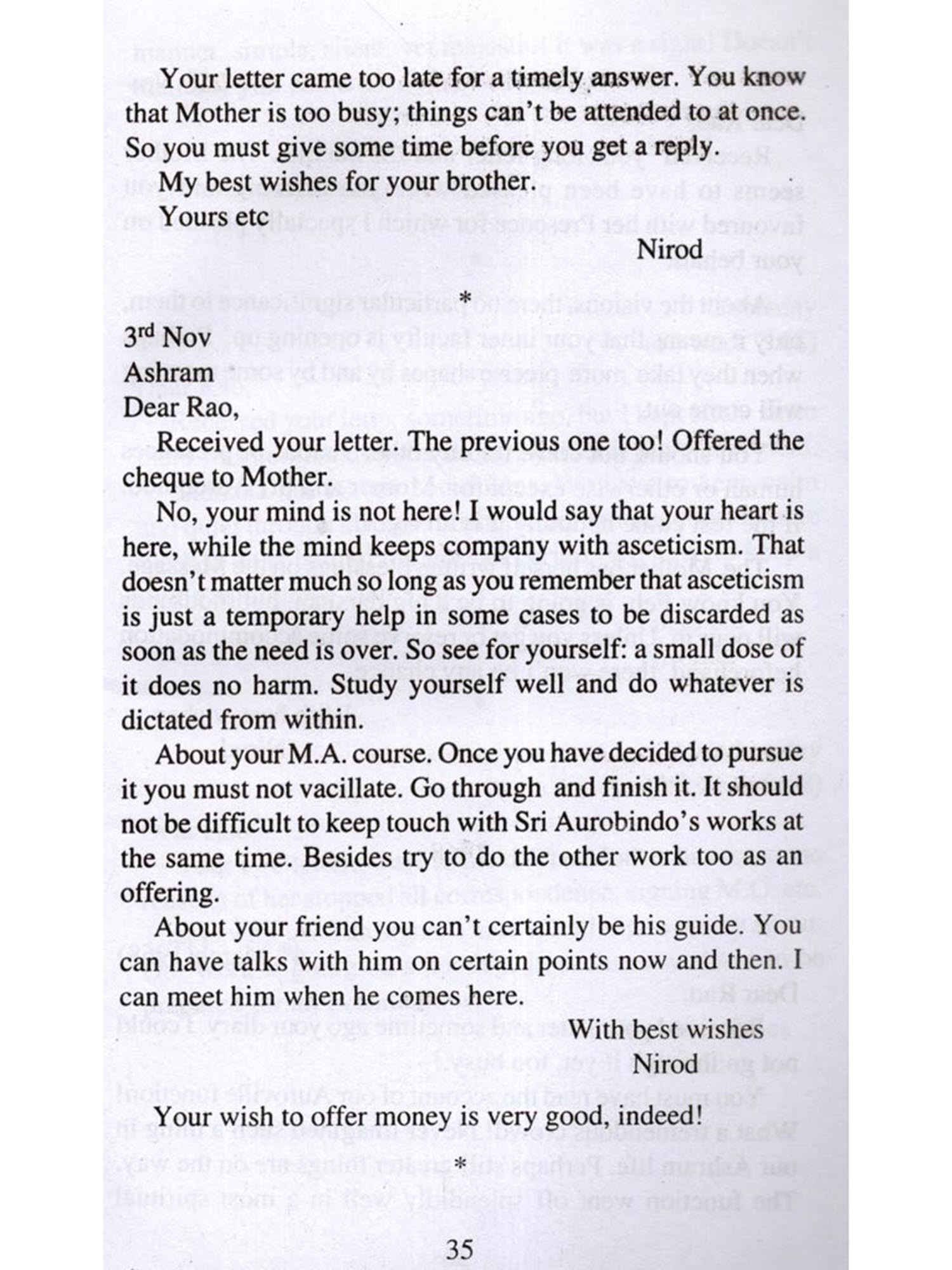 Our only regret is that Banidi who first gave me these letters and a copy of the interview for getting them published and took so much interest in any work connected with her uncle Nirodbaran is no more. Her love for her uncle has been a deep inspiration to me for this work.