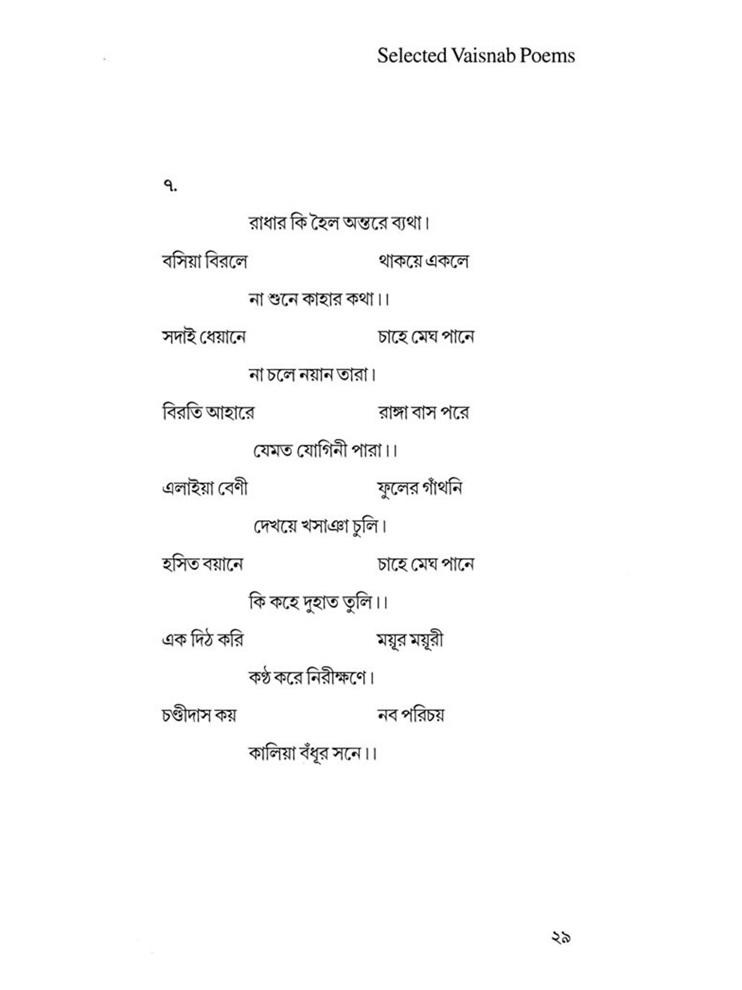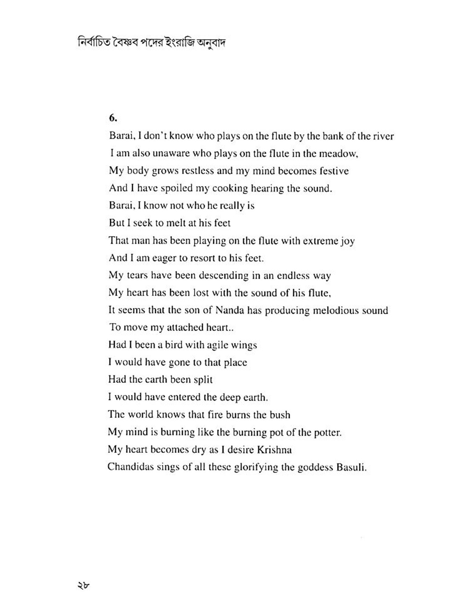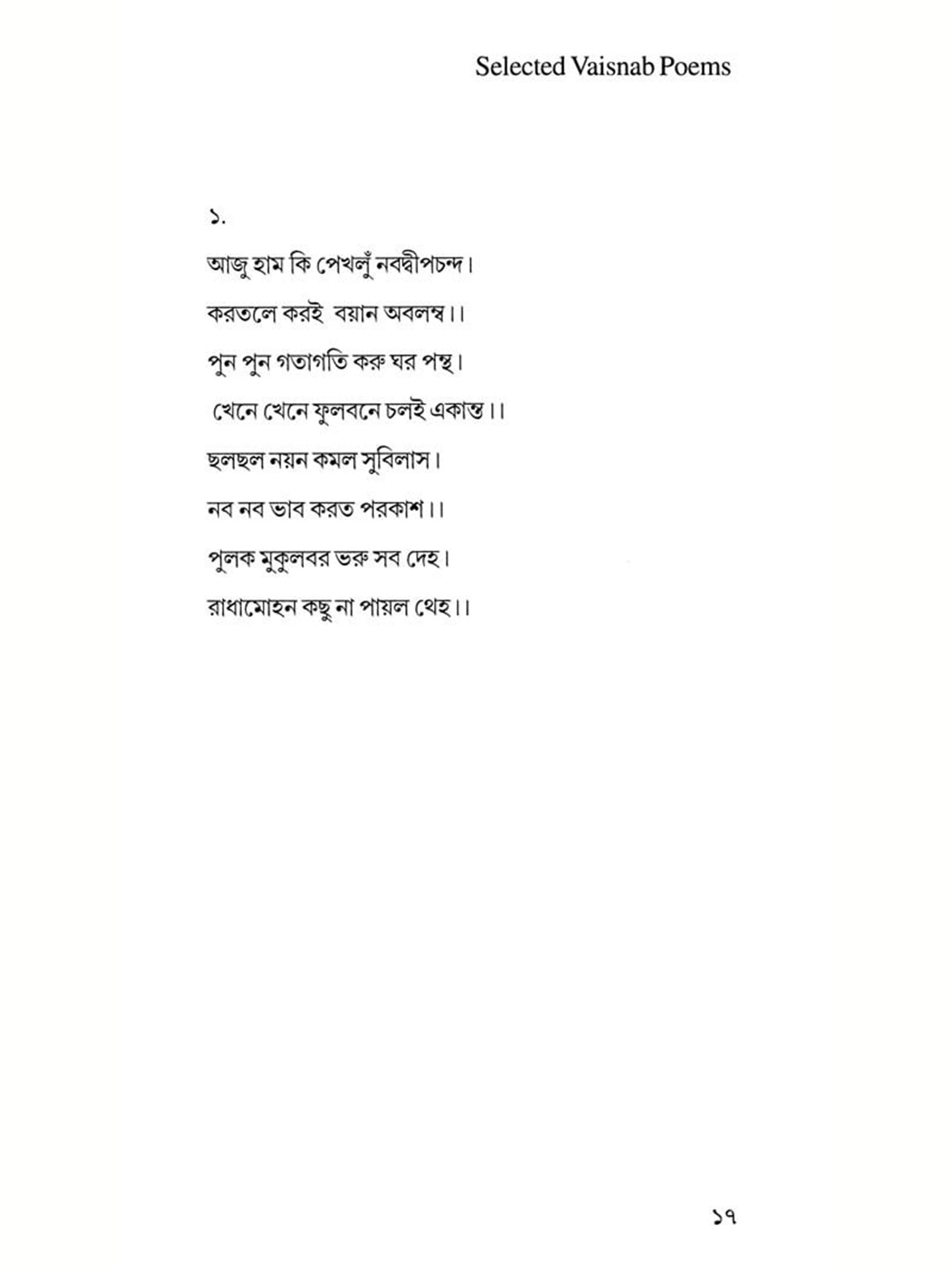 The Vaisnab poets wrote a number of poems or songs which were divine and as well as earthly. They express a devotee's deep aspiration for truth and the ultimate reality. At the same time, these songs are related to human life and human love. R. N. Tagore appreciated these songs highly and the modern readers can enjoy these poems as they remain eternally relevant to human existence. These songs are basically religious but essentially human. Dinubandhu Ghosh having certain poetical sensitivity has tried to translate these Bengali songs into English. It is really difficult to translate them as they are rich in poetical flavour and bright in poetical sensibility. And translation has its own limitations.