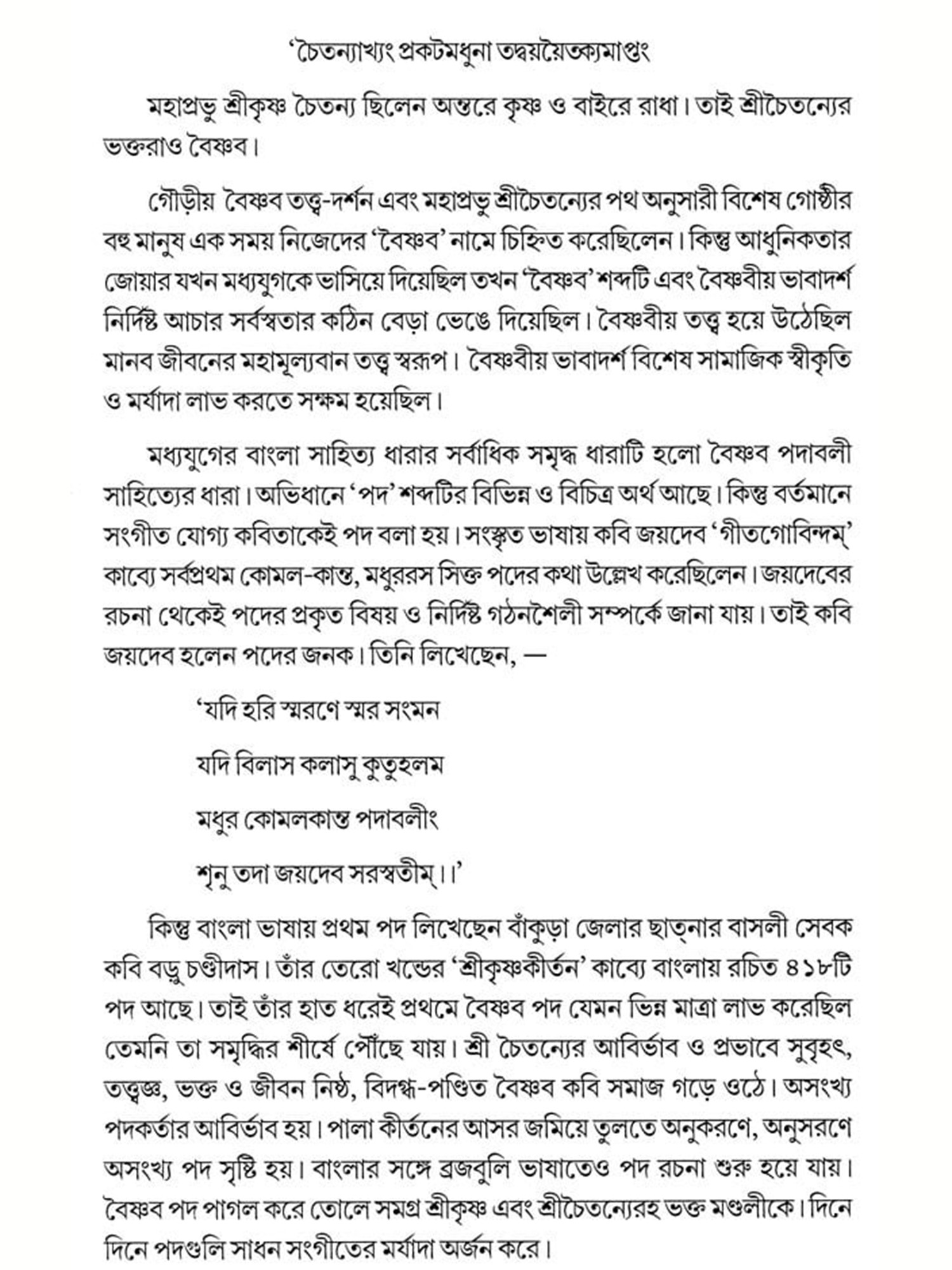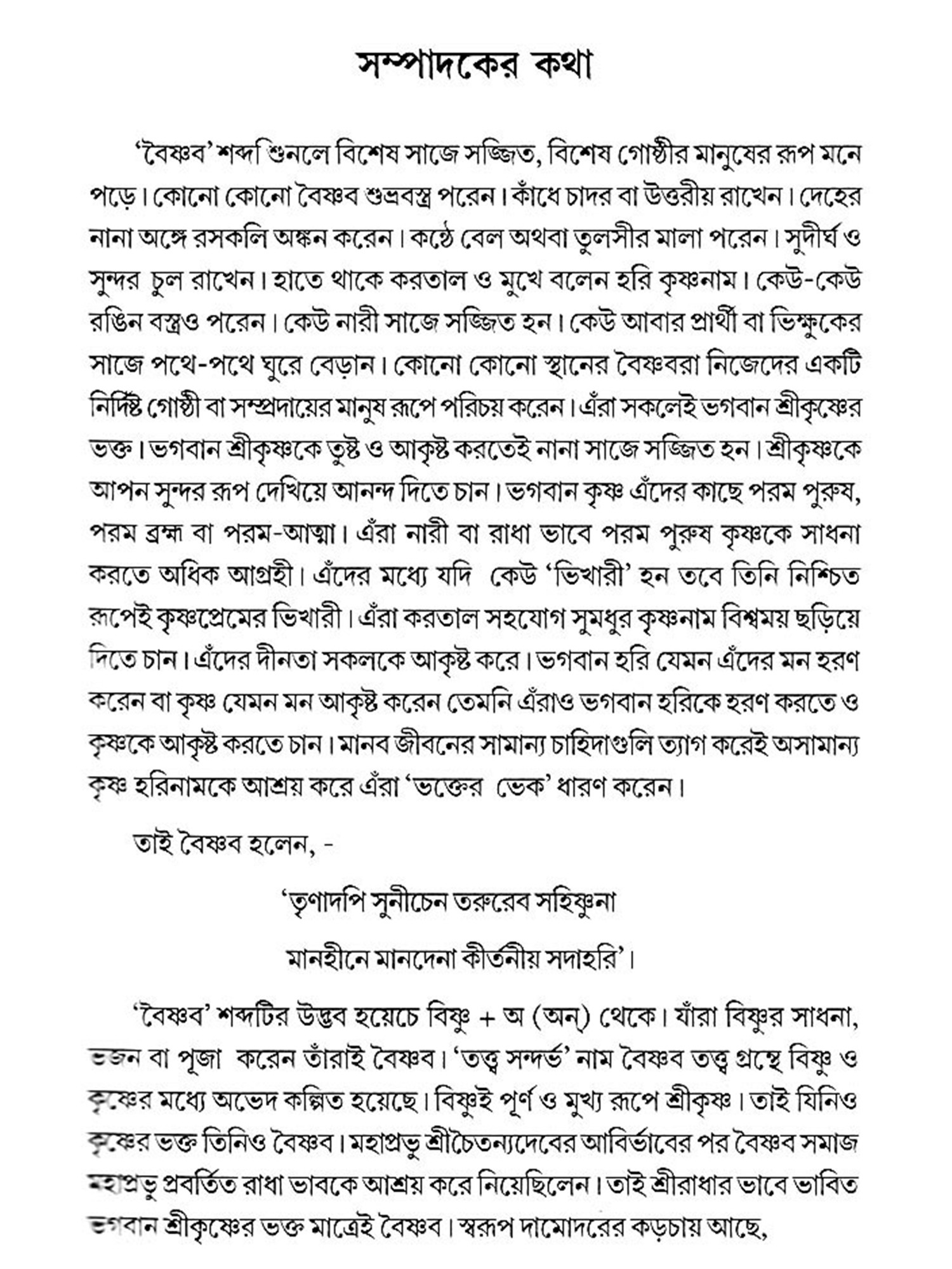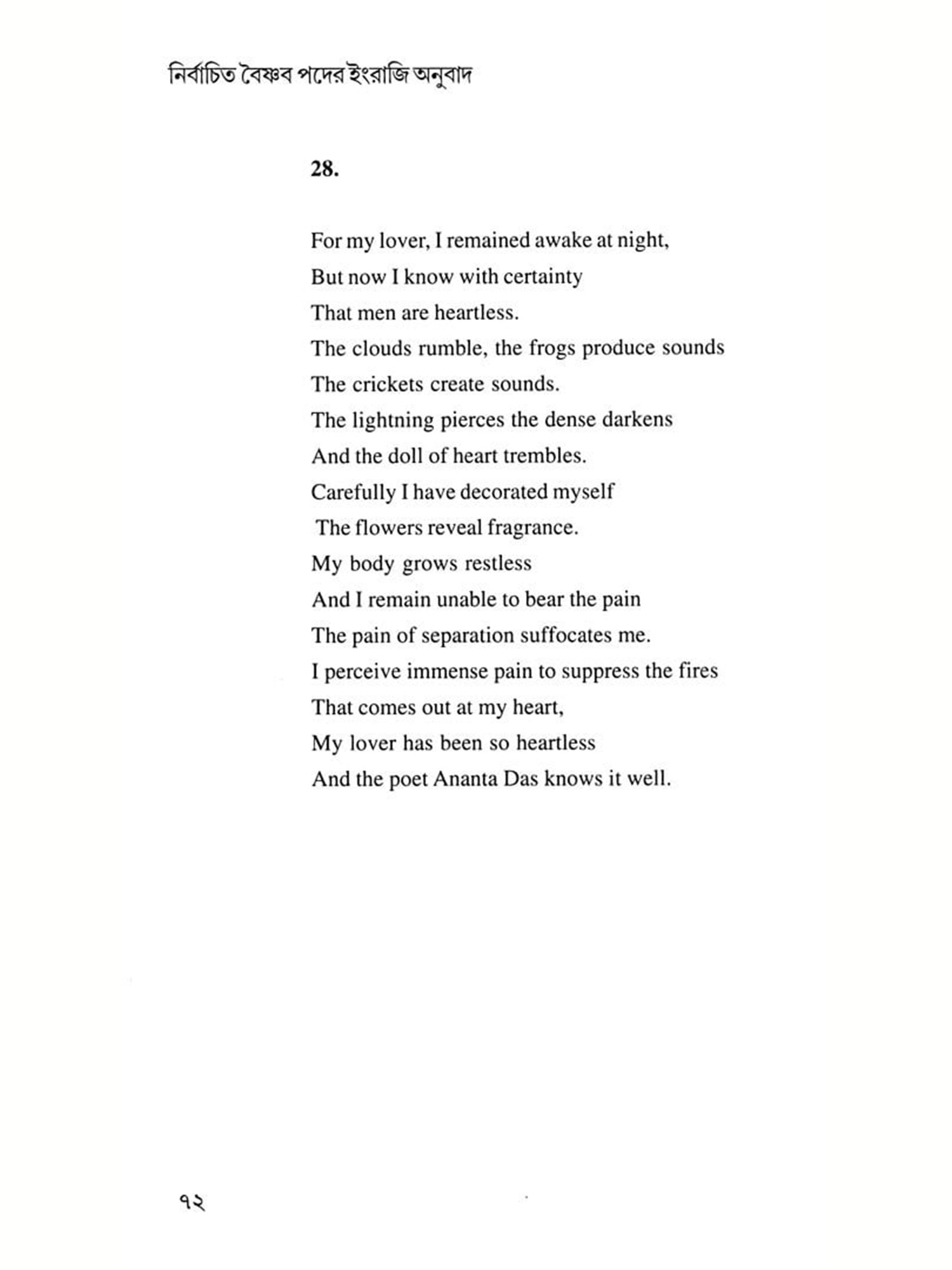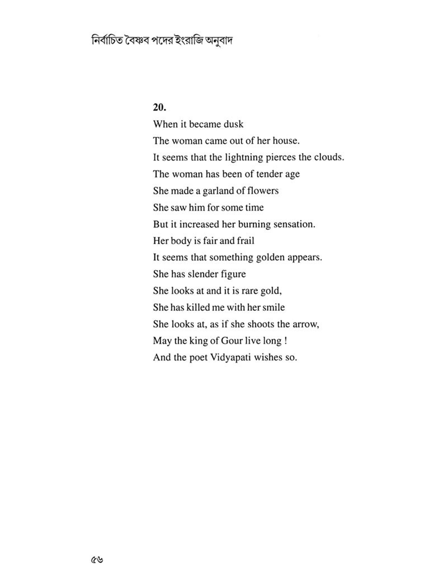 The Vaisnab poets wrote a number of poems or songs which were divine and as well as earthly. They express a devotee's deep aspiration for truth and the ultimate reality. At the same time, these songs are related to human life and human love. R. N. Tagore appreciated these songs highly and the modern readers can enjoy these poems as they remain eternally relevant to human existence. These songs are basically religious but essentially human. Dinubandhu Ghosh having certain poetical sensitivity has tried to translate these Bengali songs into English. It is really difficult to translate them as they are rich in poetical flavour and bright in poetical sensibility. And translation has its own limitations.