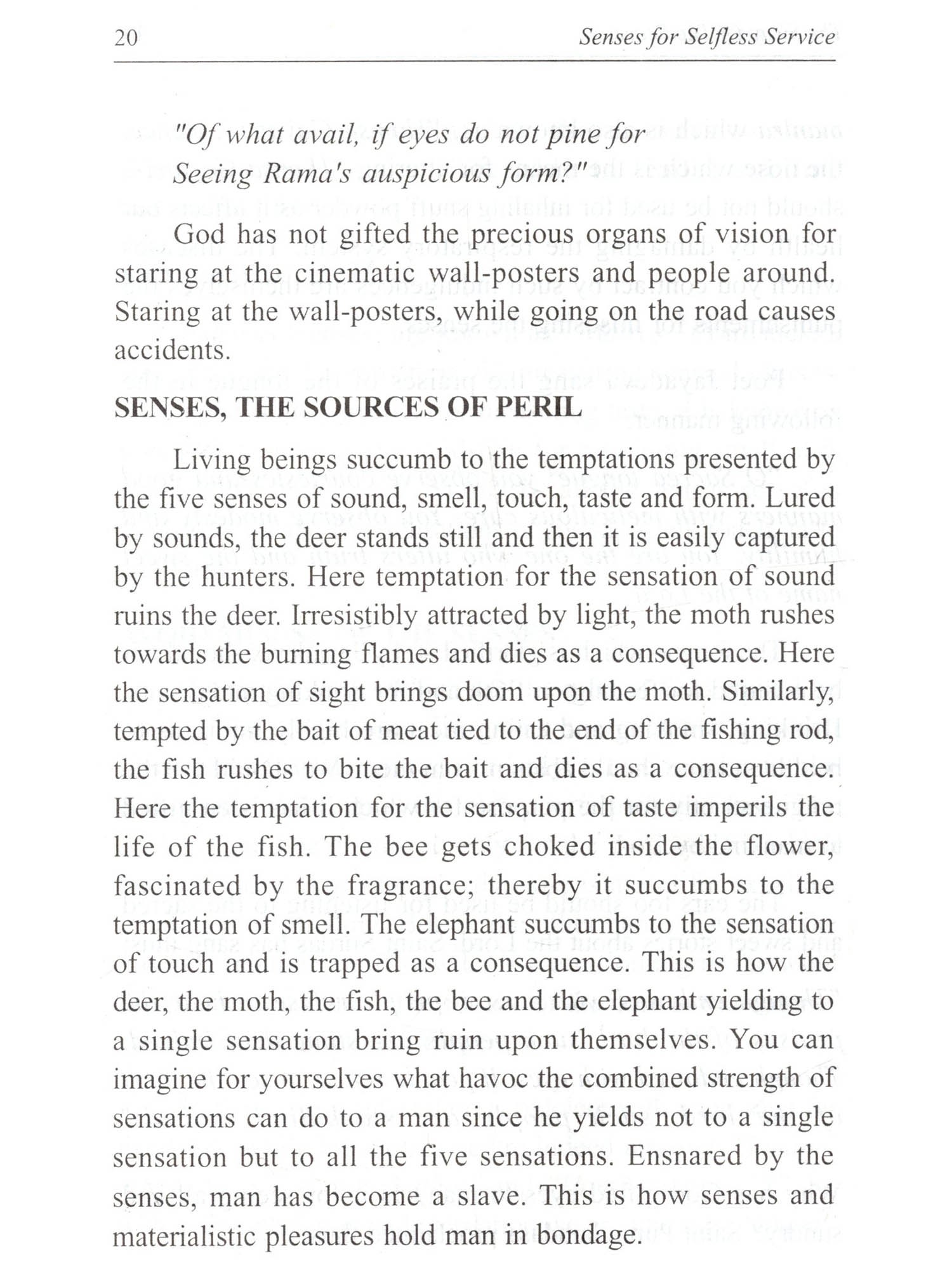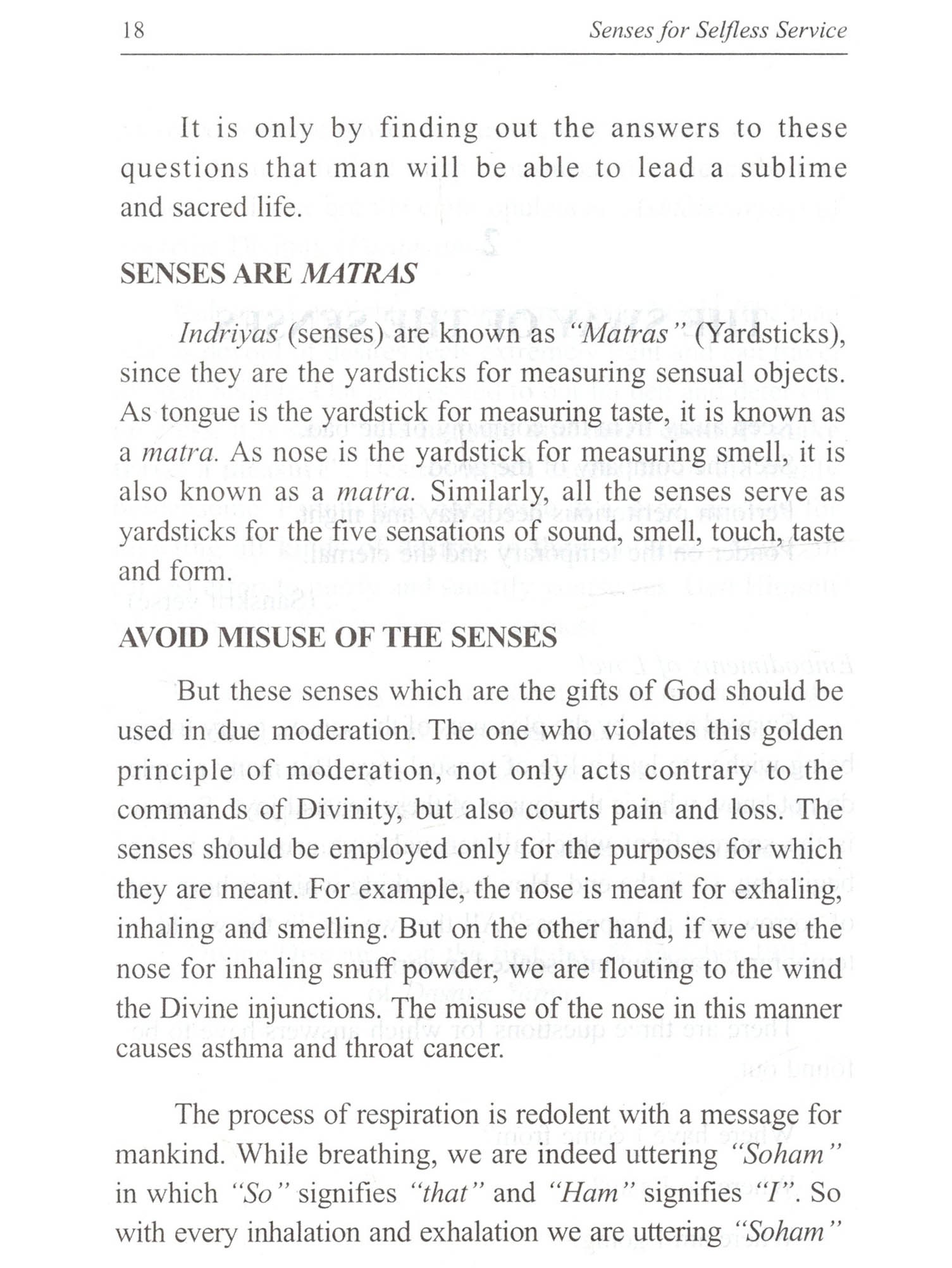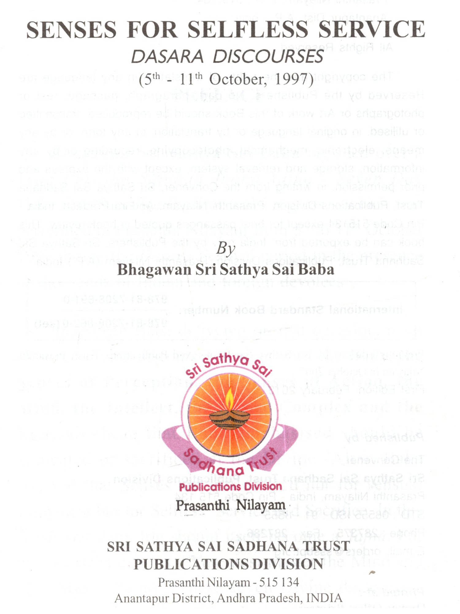 Bhagawan Sri Sathya Sai Baba presided over a Veda Purusha Sapthah Jnana Yajna Seven Day Vedic Fire-Sacrifice for Spiritual Progress which was performed in Prasanthi Nilayam from 5th to 11th October 1997 during the Dasara Festival period in the presence of thousands of Indian and foreign devotees Bhagawan Baba delivered on that occasion, a set of seven divine discourses dealing with the Body, the Senses of Perception, the Senses of Action, the Mind, the Intellect, the Desire Complex and the Ego; all these that Baba emphasised should be dedicated or sacrificed at the Divine Altar. Baba stressed that Senses are gift of God not for sensual enjoyment but for Selfless Service and Sacrifice. In this sense, our daily life should itself become a Yajna. For this, as Baba exhorts, "You must master the Mind and be a Master Mind". These seven Divine discourses, brought together in this book titled SENSES FOR SELFLESS SERVICE, constitue in effect the seven steps to spiritual enlightenment; they represent the seven stages of consciousness: Self Awareness, Self Confidence, Self Knowledge, Self Surrender, Self Sacrifice, Self Satisfaction and Self Realization. This is the secret of the seven day Yajna.