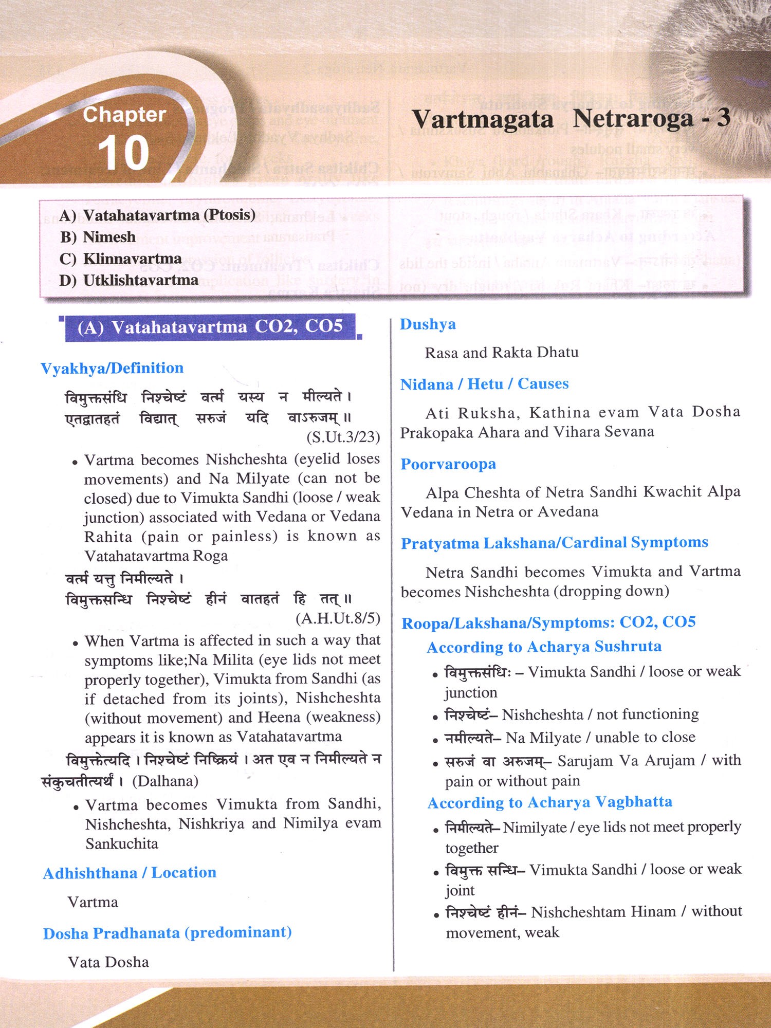 Curriculum for 3 Professional B.A.M.S. (prescribed by NCISM) vital orientations from Bruhatrayi, Laghutrayi, and books related to Shalakya Tantra have been collected. This Book encloses all the topics from the syllabus in chapter wise manner in a very simple dialectal with illustration.