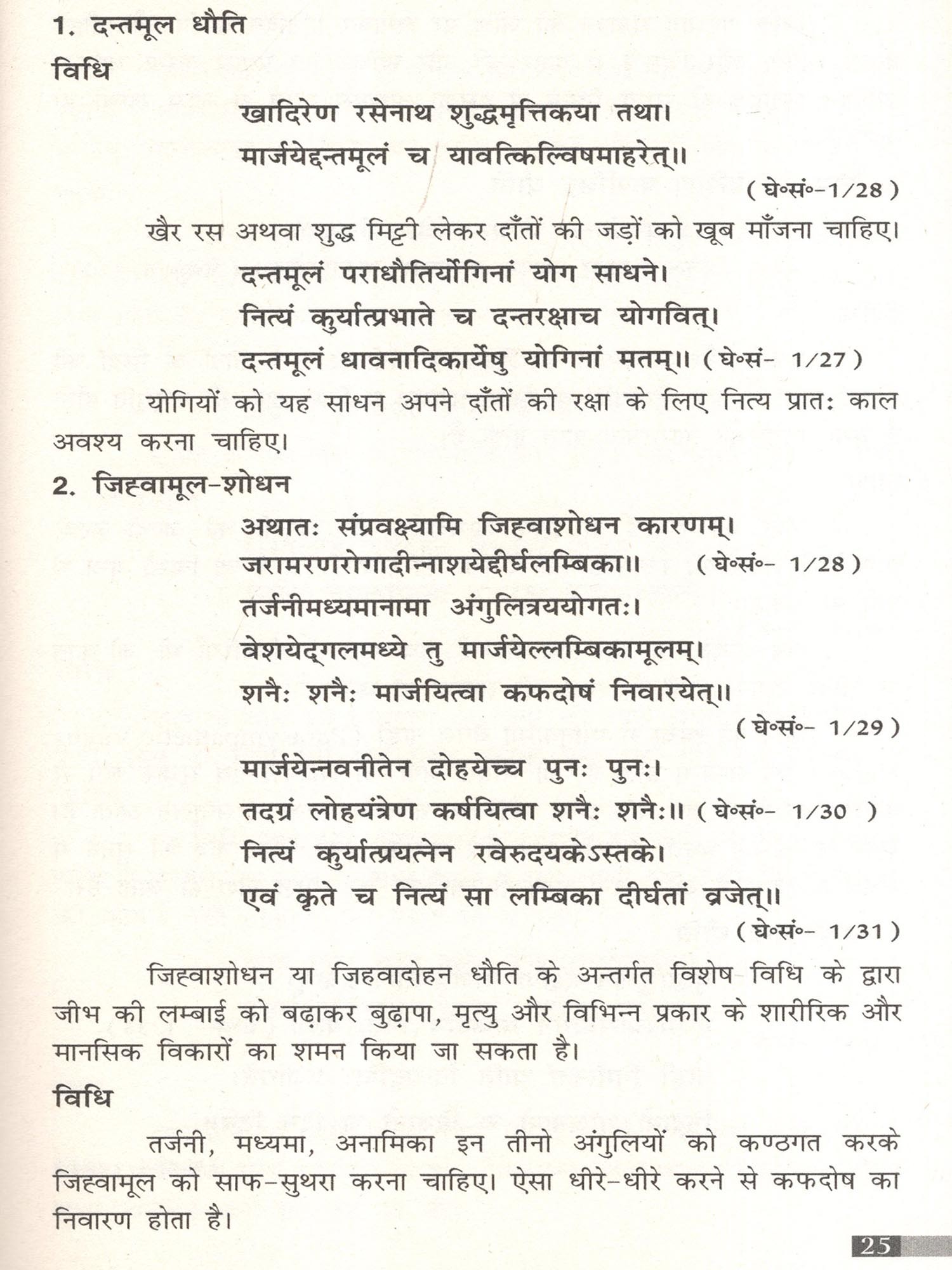 महर्षि घेरण्ड योग-साधना में सर्वप्रथम शरीर की शुद्धि को आवश्यक मानते हैं और उसके लिए वे धौति, वस्ति, नेति, नौलि, त्राटक तथा कपालभाति इन छः क्रियाओं का वर्णन करते हैं जिनके द्वारा एक योगी शरीरस्थ विकारों को दूर कर निर्मल शरीर को प्राप्त कर आगे की योगयात्रा को सुगम बनाता है।