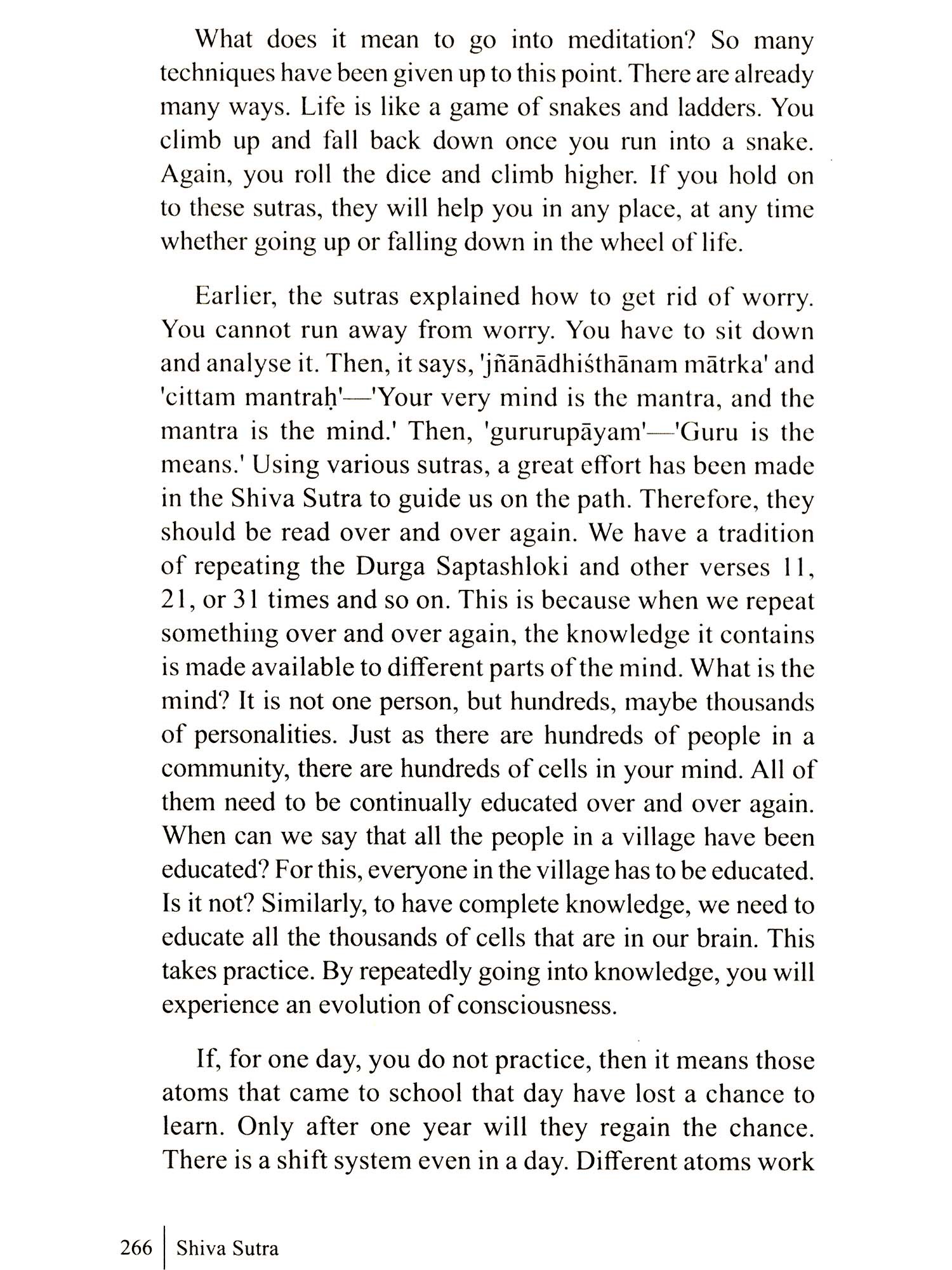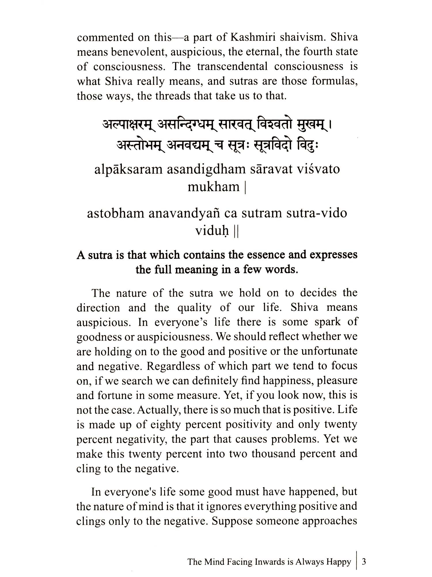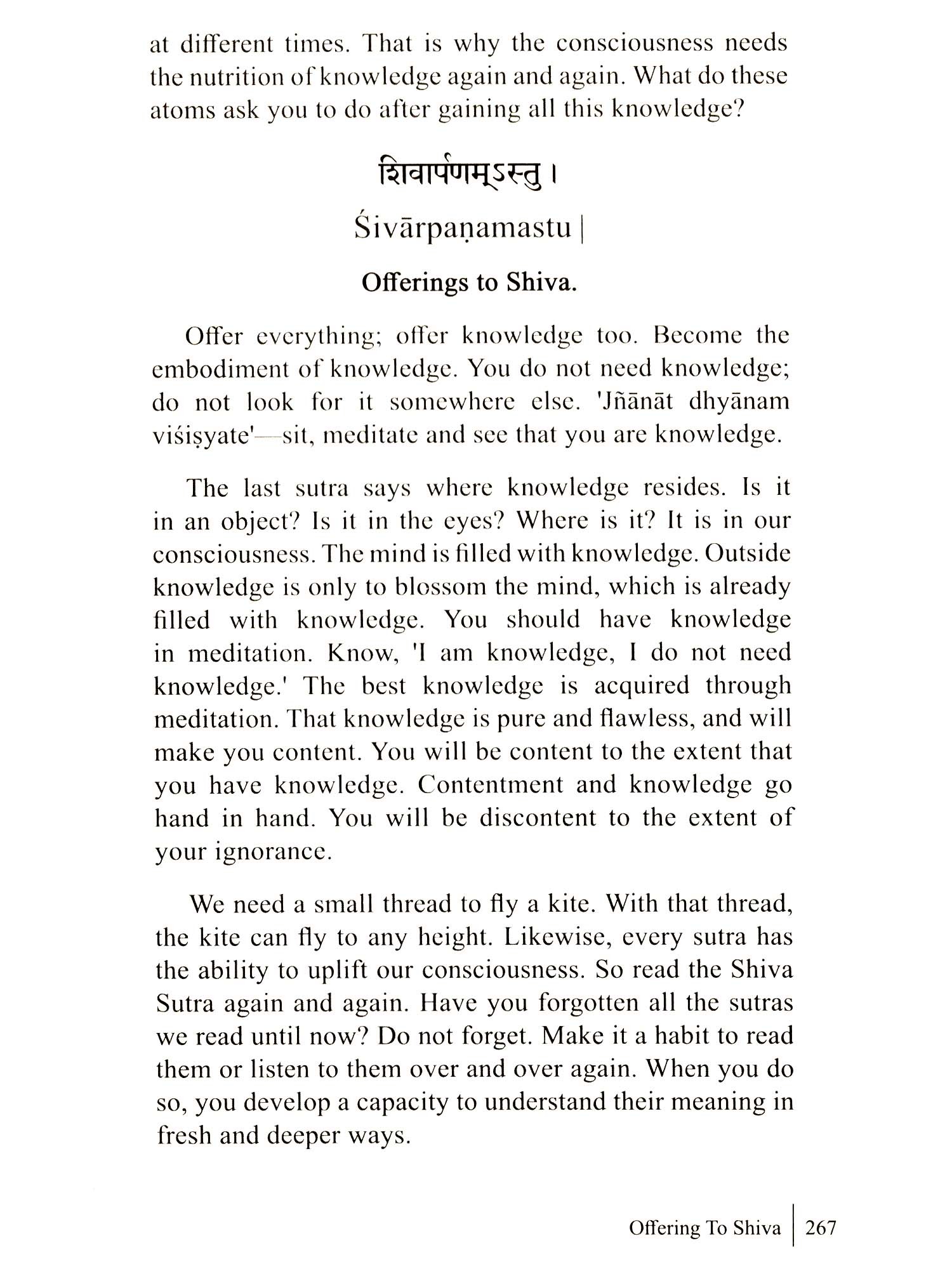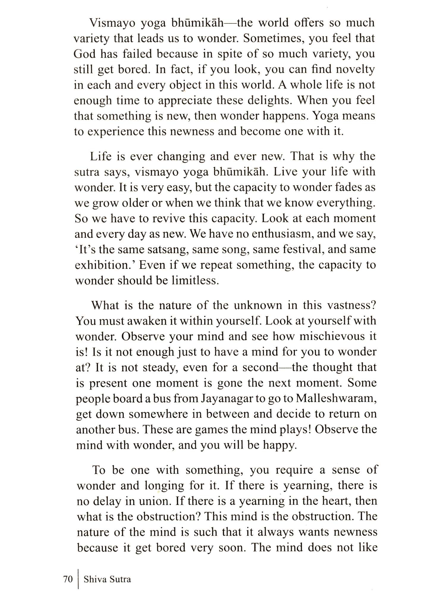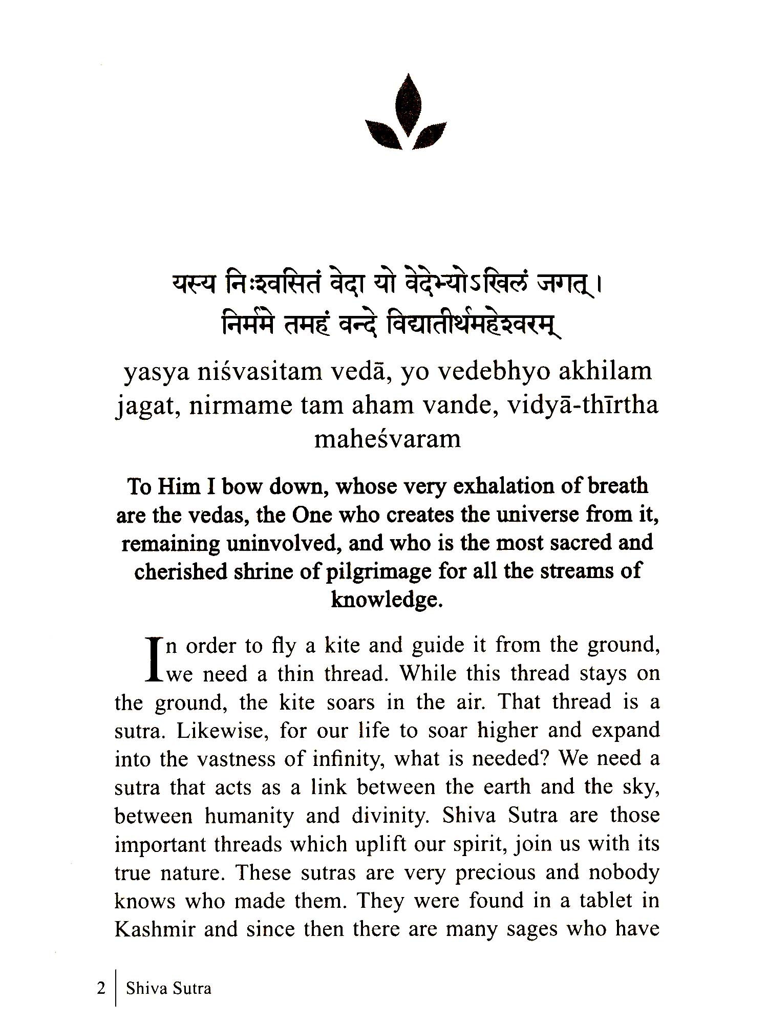A kite needs a string in order to fly through the sky Iii a similar way the Shiva Sutras offers threads to uplift our mind and let it soar to new heights.’ The Shiva Sutras describes the goal of life as life radiating the light of inner joy The magic of the Shiva Sutras is that each sutra is complete, offering us a way to go deeper Into our own nature, which is joy. Step by step, with inimitable humor and wisdom, Sri Sri Ravi Shankar takes from everyday life to guide readers on this journey of Innocence and love. Originally given as1 a commentary in Kannada, this commentary is now available in English.